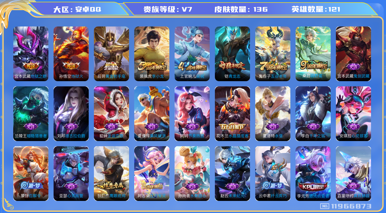 [11966873]V7 4传说 121英雄 136皮肤 可修改实名 优质装备:黄金射手座,地狱火,地狱之眼 珍宝阁皮:玩趣恶龙 限定皮:鸣野蒿,五谷丰年,青龙志(铠年限),梁祝,李小龙 史诗皮:千年之狐,永昼,江河有灵,匿光侦查者,雪夜绮愿(周瑜),真我赫兹(百里守约),百解令(蒙犽),末日机甲-吕布,节奏热浪,水果甜心,天才门将,心灵骇客,德古拉伯爵,暗隐猎兽者,鬼剑武藏,心灵战警,纤云弄巧,繁星吟游(呼啦呼啦),拒霜思,乘风破浪,水晶猎龙者,金属风暴,圣诞恋歌,鹰眼统帅,魅力维加斯,无心,未来纪元-赵云