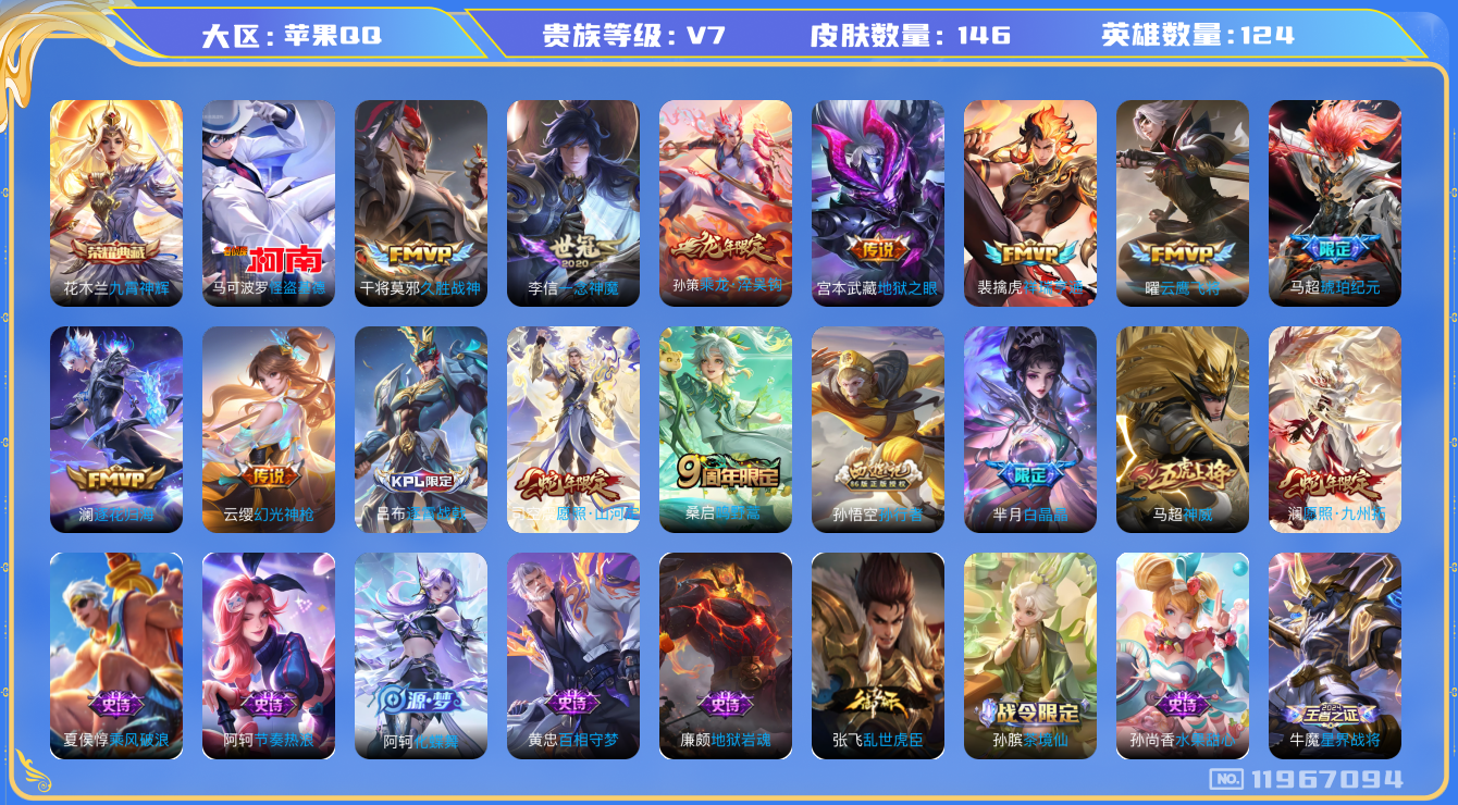 [11967094]V7 1典藏 1珍品传说 12传说 124英雄 146皮肤 可修改实名 优质装备:九霄神辉(木兰典藏),怪盗基德,云鹰飞将(小将军),久胜战神,一念神魔,地狱之眼,澜逐花归海,琥珀纪元马超,涂山容容 传说皮:乘龙·淬吴钩(孙策年限),祥瑞亨通,幻光神枪 珍宝阁皮:万物之道 限定皮:愿照·九州拓(澜年限),愿照·山河定(司空震年限),逐霄战戟,鸣野蒿,白晶晶,神威(电光马子),孙行者 史诗皮:器灵·浮梦炉,化蝶舞,星界战将,谪仙醉月,龙之律动,茶境仙,芈月浮光幕影,上官婉儿群星魔术团,蔬乡物语(鲁班七号),星界特工,百相守梦-黄忠,紫霞仙子,特工魅影,偶像歌手,乱世虎臣,节奏热浪,女仆咖啡,摇滚巨星,水果甜心,功夫厨神,暗隐猎兽者,鬼剑武藏,暗渊魔法,地狱岩魂,乘风破浪,水晶猎龙者,金属风暴,原初追逐者,鹰眼统帅,魅力维加斯