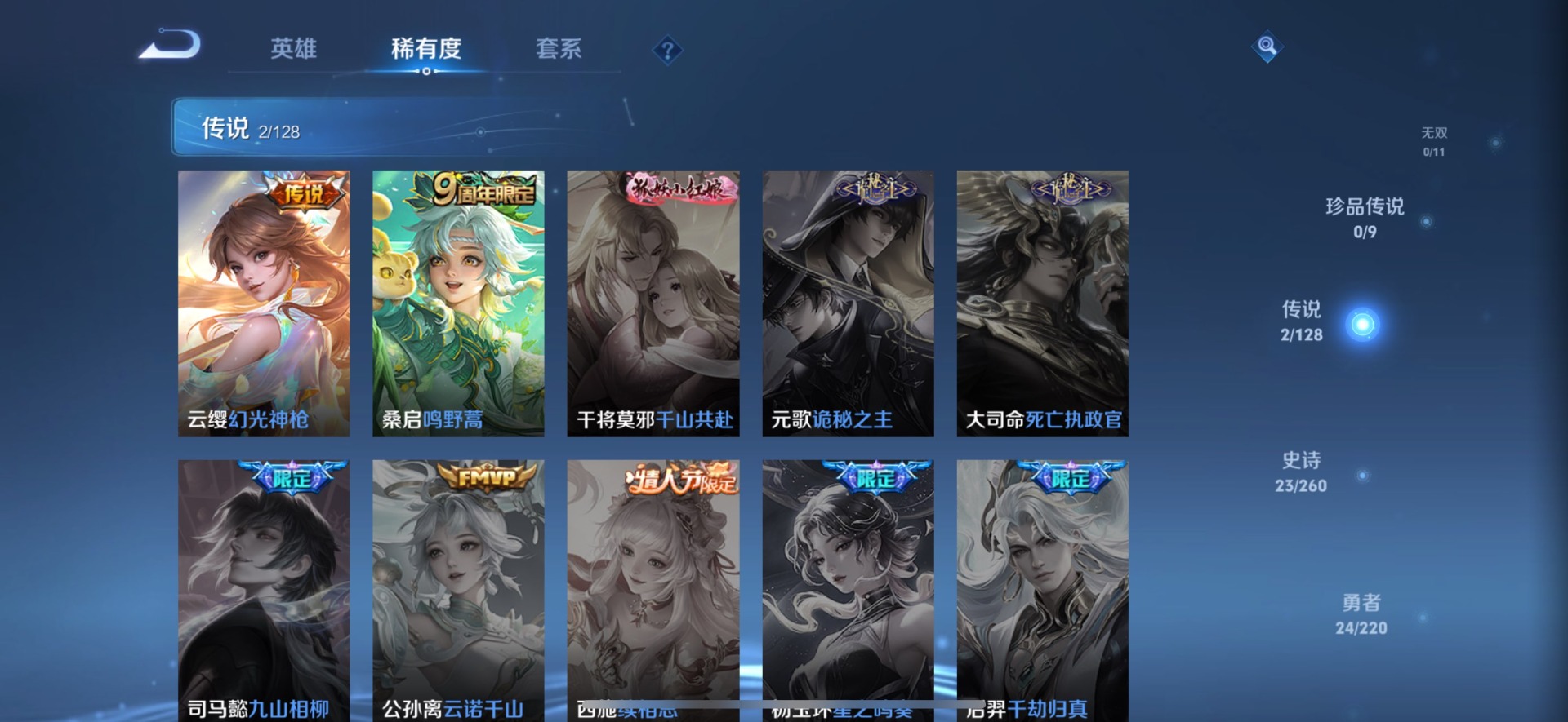 - PX_2103030-Q/至尊星耀/216皮肤/123英雄/1典藏/0珍品无双/0无双/0珍品传说/2传说/55史诗/7稀有英雄 【1 典藏皮肤】九霄神辉 花木兰, 【2 传说皮肤】琥珀纪元 马超,鸣野蒿 桑启, 【55 史诗皮肤】末日机甲 吕布,紫霞仙子 露娜,高山流水 庄周,匿光追影者 镜,冰霜恋舞曲 干将莫邪,妄想食味 姬小满,德古拉伯爵 刘邦,心灵战警 亚瑟,五谷丰年 鬼谷子,无心 元歌,
