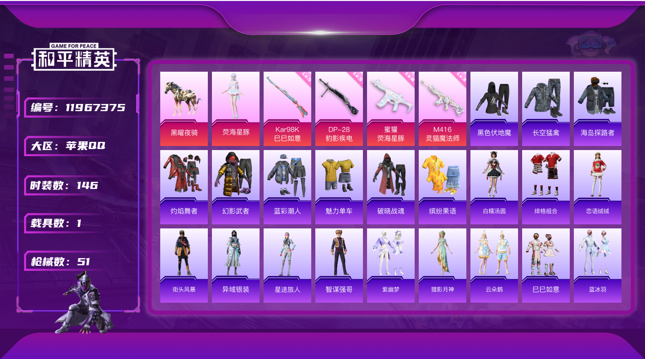 - PX_2104832- 可二次 苹果手Q-5王牌印记-12粉装-7特效枪-3载具-59419热力值-109套装-140枪皮-0卓越印记-0传奇印记, 【12粉装】,洛天依,极致幻想,焰龙焚天,银龙傲海,俏雪含霜,复仇流浪者,暖熊萌萌,妙趣可丽,垂柳戏鸭,俏皮狐尾,骨龙祭渊,暗夜鎏金, 【7特效枪】,SCAR-L-青春物语-4级,M416-心之恋语-5级,GROZA-香水柠檬-5级,AUG-妙趣可丽