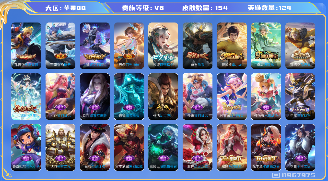 [11967975]V6 1典藏 6传说 124英雄 154皮肤 可修改实名 优质装备:全息碎影(猴子典藏),碎云,鹤归松栖(云缨),澜逐花归海 传说皮:幻光神枪 珍宝阁皮:妄想食味 限定皮:愿照·众生和(妲己年限),鸣野蒿,岱宗(典韦年限),李小龙,孙行者 史诗皮:星界战将,蒙犽顽岩魄,苍穹之光,电玩小子(小书包),千年之狐,江河有灵,末日机甲-莱西奥,百解令(蒙犽),猫狗日记-孙策,猫狗日记-大乔,乱世虎臣,女仆咖啡,水果甜心,心灵骇客,功夫厨神,德古拉伯爵,暗隐猎兽者,幽灵船长,鬼剑武藏,心灵战警,纤云弄巧,拒霜思,逐浪之夏,水晶猎龙者,唤灵魅影,金属风暴,原初追逐者,圣诞狂欢,圣诞恋歌,鹰眼统帅,暗夜贵公子,魅力维加斯,赏金猎手,未来纪元-赵云