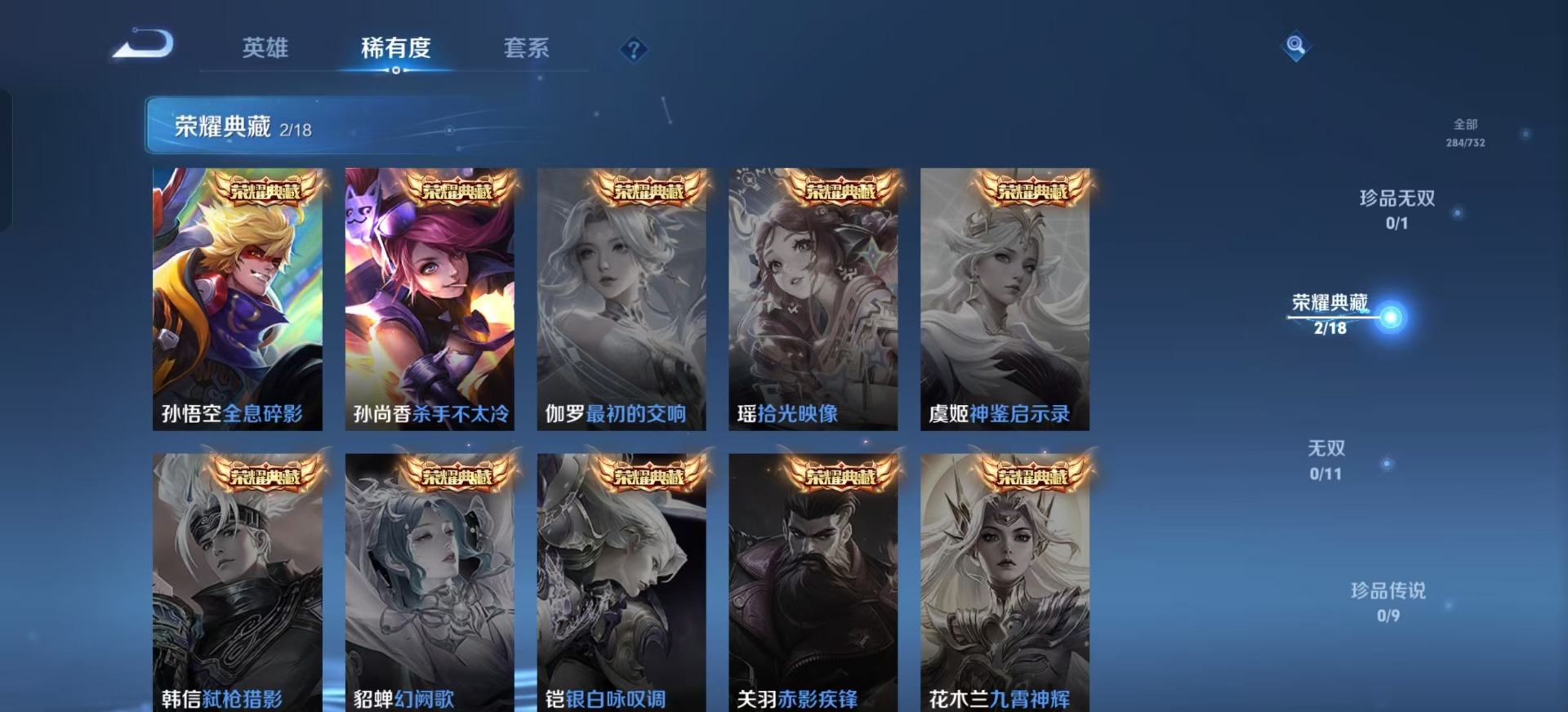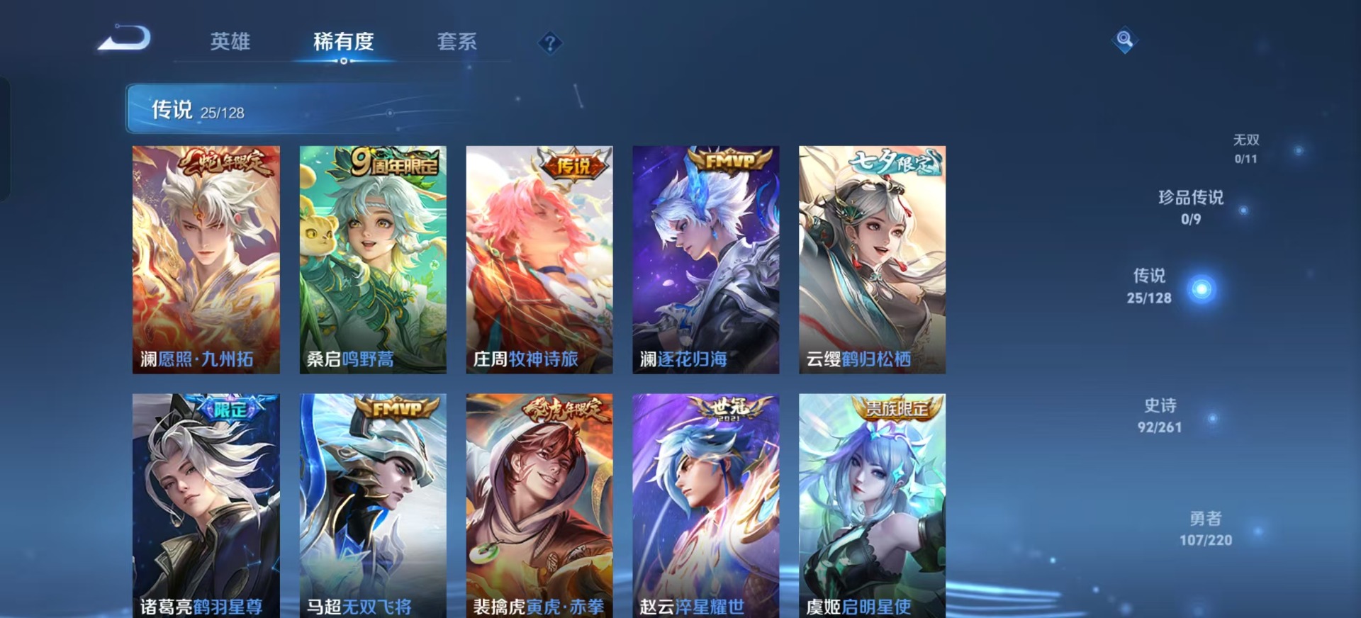 刘备时之恋人,赵云淬星耀世,李信一念神魔,达摩黄金狮子座,庄周牧神诗旅,马超无双飞将,澜逐花归海,虞姬云霓雀翎