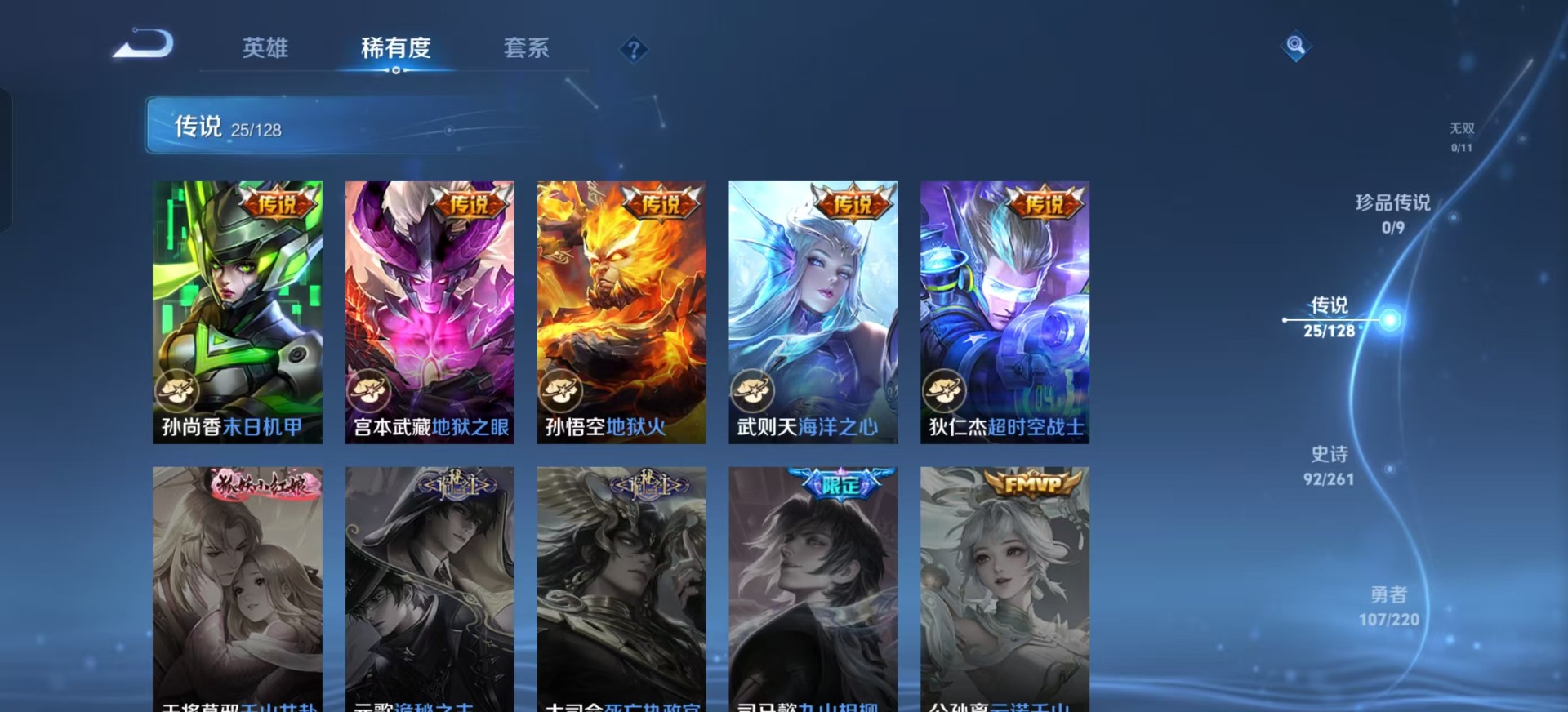 - PX_2070941-【1.1万战金标蒙恬 金标达摩,金标钟无艳】 贵族等级: V7 英雄数: 122 皮肤数: 256 荣耀水晶: 幻阙歌 无双皮: 小乔时之魔女 珍品传说: 酷洛米之心 传说皮: 黄金狮子座,冠军飞将,一念神魔,末日机甲-孙尚香,无双飞将,山海·炽霜斩,浮生妄,乘龙·淬吴钩,吕布曦玄引,典韦战鼓燎原 限定皮: 遇见飞天,李小龙,梁祝,青春决赛季,朱雀志,一生所爱,高山流水,猪悟