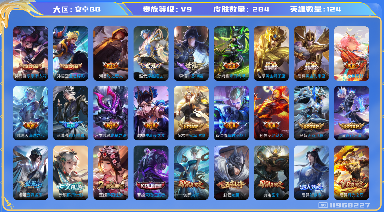 [11968227]V9 2典藏 25传说 124英雄 284皮肤 典藏英雄武则天 可修改实名 优质装备:杀手不太冷,全息碎影(猴子典藏),黄金狮子座,黄金射手座,冠军飞将,一念神魔,云霓雀翎,末日机甲-孙尚香(绿蚂蚱),地狱火,仲夏夜之梦(大飞蛾),海洋之心,地狱之眼,时之恋人-刘备(电焊工),淬星耀世,超时空战士-狄仁杰,无双飞将,鹤羽星尊,鹤归松栖(云缨),澜逐花归海,牧神诗旅 珍宝阁皮:妄想食味,优雅恋人 限定皮:愿照·九州拓(澜年限),鸣野蒿,白虎志(电光耗子),凤求凰(白切鸡),太华(伽罗年限),神威(电光马子),飞衡(韩信年限),高山流水,游园惊梦,梁祝,龙胆,岱宗(典韦年限),天狼征服者,天狼绘梦者,李小龙,辉光之辰,如梦令-后羿,神奇女侠,寅虎·赤拳(老虎年限),山海·玄木吟(马可年限) 史诗皮:化蝶舞,星界战将,龙之律动,藏狐·褐绒,石田雨龙,茶境仙,破空之剑,埋骨钱,百相守梦-百里守约,星界特工,紫霞仙子,苍穹之光,电玩小子(小书包),白龙吟,黄金分割率,特工魅影,千年之狐,江河有灵,百解令(蒙犽),高渐离燃音魔法,蒙恬荣光圣徽,无限星赏官,冰冠公主,青蛇,偶像歌手,暗夜猫娘,末日机甲-吕布,猫狗日记-孙策,时之恋人-孙尚香,乱世虎臣,节奏热浪,修罗,摇滚巨星,水果甜心,天才门将,星夜王子,心灵骇客,功夫厨神,德古拉伯爵,暗隐猎兽者,幽灵船长,鬼剑武藏,暗渊魔法,心灵战警,乐园奇幻夜,纤云弄巧,拒霜思,缤纷独角兽,乘风破浪,逐浪之夏,水晶猎龙者,曙光守护者,箭羽风息,金属风暴,原初追逐者,圣诞狂欢,圣诞恋歌,鹰眼统帅,暗夜贵公子,魅力维加斯,黎明之约,雪上飞焰,赏金猎手
