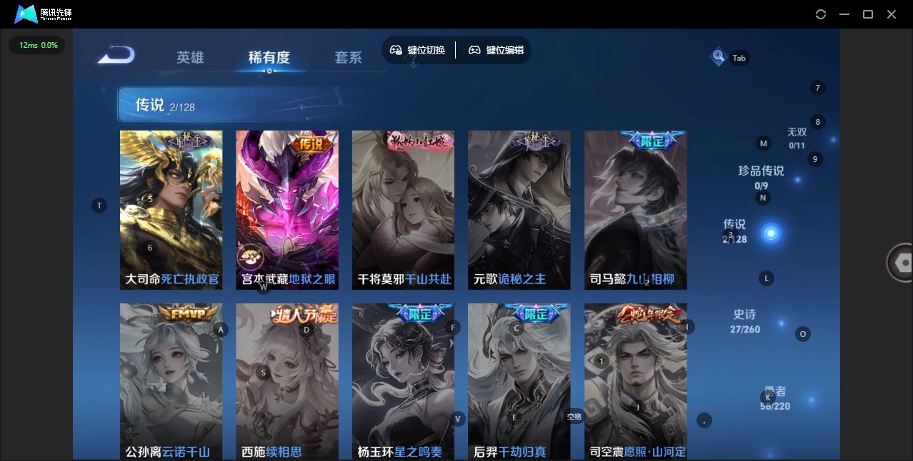 - [11523337]V9 3典藏 18传说 125英雄 332皮肤 典藏英雄武则天 可修改实名 荣耀水晶:鸣剑·曳影,全息碎影(猴子典藏),杀手不太冷 传说皮:黄金狮子座,黄金射手座,仲夏夜之梦(大飞蛾),海洋之心,地狱之眼,一念神魔,久胜战神,云鹰飞将(小将军),炽阳神光,超时空战士-狄仁杰 珍宝阁皮:妄想食味,优雅恋人,玩趣恶龙 限定皮:鸣野蒿,至尊宝,白虎志(电光耗子),凤求凰(白切鸡),太华(伽罗年限),梅西,白晶晶,时雨天司(水龙头),神威(电光马子),遇见飞天,高山流水,五谷丰年,冰锋战神,天狼运算者,游园惊梦,梁祝,御风骁将(吕布年限),祈雪灵祝(雪兔子),李小龙,逐梦之影,辉光之辰,霸王别姬-项羽,纯白花嫁,猪悟能,一生所爱,大圣娶亲,天魔缭乱,青春决赛季,冰霜恋舞曲 史诗皮:鸭鸭历险记-刘禅,龙之律动,百相守梦-黄忠,怒海争锋,百相守梦-周瑜,幻珠鲛人,遇见神鹿,紫霞仙子,苍穹之光,电玩小子(小书包),白龙吟,黄金分割率,特工魅影,千年之狐,永昼,末日机甲-莱西奥,蒙恬荣光圣徽,冰冠公主,偶像歌手,晚萤,魅语,暗夜猫娘,末日机甲-吕布,猫狗日记-孙策,猫狗日记-大乔,乱世虎臣,节奏热浪,修罗,女仆咖啡,摇滚巨星,水果甜心,绅士熊喵,天才门将,星夜王子,心灵骇客,功夫厨神,德古拉伯爵,暗隐猎兽者,幽灵船长,鬼剑武藏,心灵战警,天秀·启明,舞动绿茵,地狱岩魂,纤云弄巧,繁星吟游(呼啦呼啦),拒霜思,缤纷独角兽,乘风破浪,逐浪之夏,水晶猎龙者,曙光守护者,箭羽风息,金属风暴,原初追逐者,圣诞狂欢,圣诞恋歌,鹰眼统帅,暗夜贵公子,魅力维加斯,黎明之约,赏金猎手,奇遇舞章,无心,未来纪元-赵云