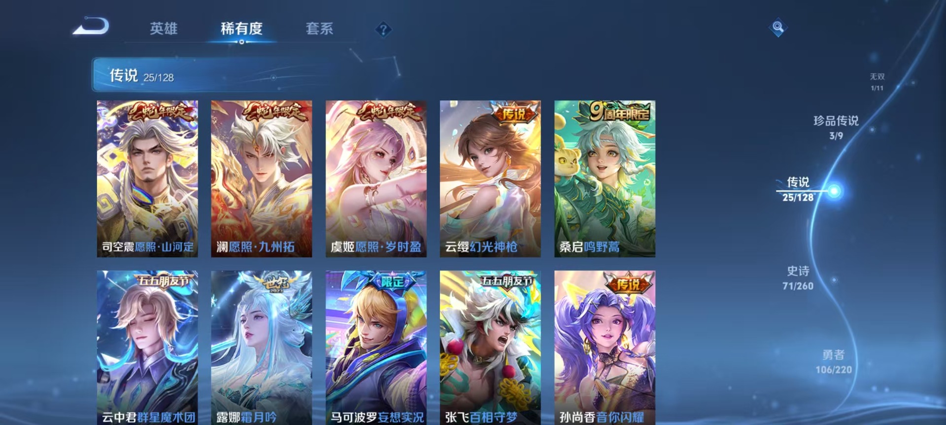 - [11599697]V8 1典藏 1珍品传说 13传说 125英雄 272皮肤 可修改实名 荣耀水晶:鸣剑·曳影 珍品传说:怪盗基德 传说皮:游龙清影(小青龙),山海·炽霜斩(李信年限),云鹰飞将(小将军),炽阳神光,乞巧织情,时之恋人-刘备(电焊工) 珍宝阁皮:女武神,玩趣恶龙 限定皮:逐霄战戟,陌上桑,异界灵契(白毛香),补天,寅虎·展翼(孙膑年限),白鹤梁神女,白晶晶,时雨天司(水龙头),神威(电光马子),高山流水,五谷丰年,冰锋战神,游园惊梦,梁祝,逐梦之星,天狼溯光者,李小龙,逐梦之影,朱雀志(守约年限),真爱至上,纯白花嫁,孙行者,猪悟能,一生所爱,大圣娶亲,青春决赛季,云端筑梦师,乒乒小将,蜜橘之夏,匿光追影者,寅虎·御盾(廉颇年限),寅虎·瑞焰(虎皮蛋子),寅虎·心曲(虎婆),寅虎·赤拳(老虎年限),时之祈愿-云中君,时之祈愿-瑶(瑶传限),梦圆繁星 史诗皮:茶境仙,飞车小橘子,龙之律动,雪豹·霜爪,藏狐·褐绒,石田雨龙,百相守梦-百里守约,超元猎域,化蝶舞,紫霞仙子,苍穹之光,电玩小子(小书包),白龙吟,黄金分割率,特工魅影,千年之狐,江河有灵,高渐离燃音魔法,冰冠公主,偶像歌手,晚萤,魅语,电玩·爆裂旋风,暗夜猫娘,末日机甲-吕布,猫狗日记-孙策,猫狗日记-大乔,时之恋人-孙尚香,乱世虎臣,节奏热浪,修罗,女仆咖啡,摇滚巨星,水果甜心,绅士熊喵,天才门将,星夜王子,心灵骇客,时之奇旅-安琪拉,功夫厨神,德古拉伯爵,暗隐猎兽者,幽灵船长,鬼剑武藏,暗渊魔法,心灵战警,乐园奇幻夜,天秀·启明,舞动绿茵,地狱岩魂,纤云弄巧,繁星吟游(呼啦呼啦),拒霜思,缤纷独角兽,乘风破浪,逐浪之夏,月团寄思,水晶猎龙者,曙光守护者,箭羽风息,金属风暴,圣诞狂欢,圣诞恋歌,鹰眼统帅,暗夜贵公子,雪上飞焰,寅虎·御盾,无心,未来纪元-赵云