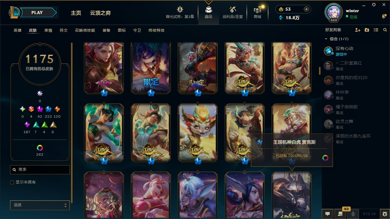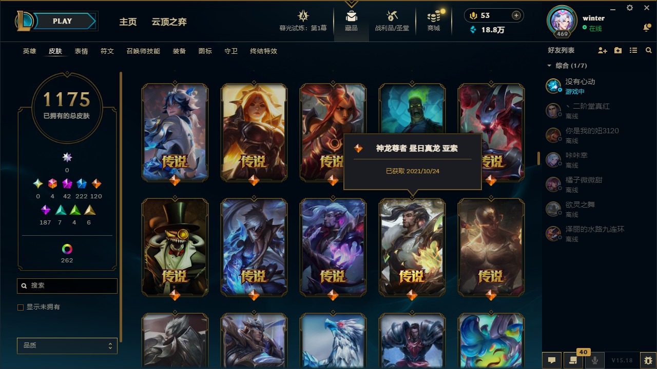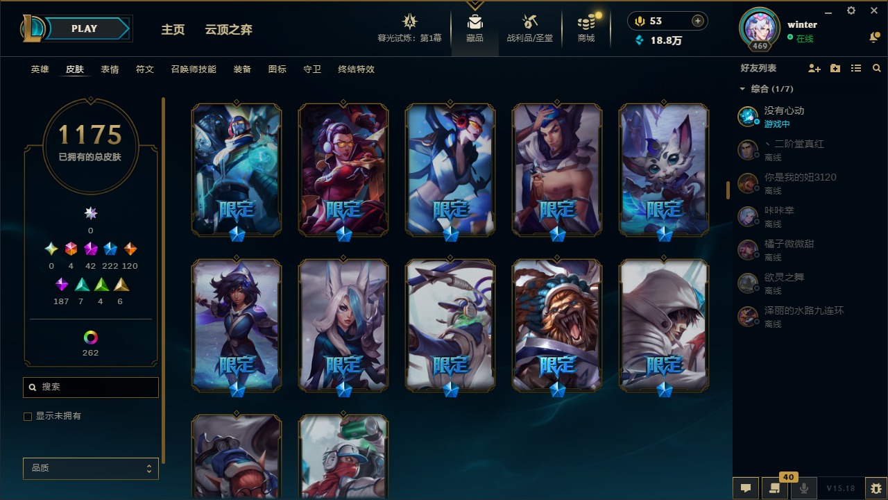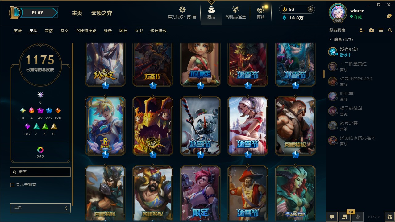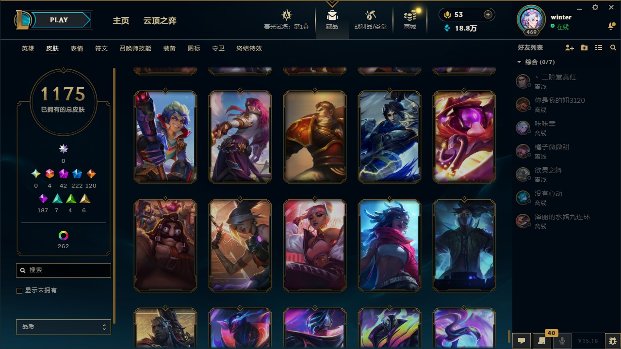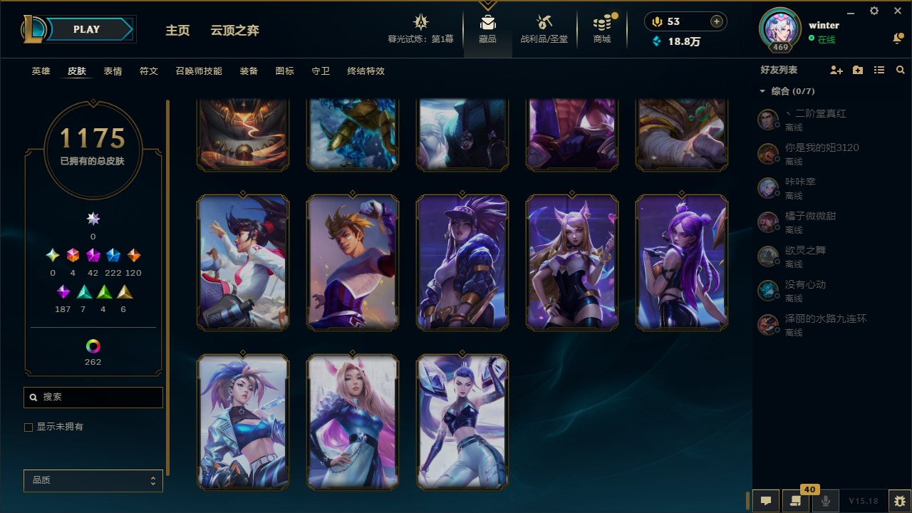 [11968358]4终极 42神话 222限定 120传说 187史诗 1175皮肤 306炫彩 171英雄 可二次 可修改实名 优质装备:至臻 腥红之月 亚托克斯,至臻 未来战士 锤石,至臻 烈焰美人 薇恩,至臻 K/DA 阿狸,至臻 黑夜使者 李青,至臻 K/DA 卡莎,至臻 星之守护者 妮寇,至臻 真实伤害 赛娜,至臻 飞升战神 潘森,至臻 魔女 乐芙兰,至臻 原计划:逆流 塞拉斯,至臻 灵能特工 伊泽瑞尔,至臻 未来战士 卢锡安,至臻 K/DA ALL OUT卡莎,永恒之森 奥恩,光明哨兵 奥拉夫,源代码 乐芙兰,防爆天使 凯尔,巧克力工坊 波比,地底世界 崔斯特,电玩战魂 人马,夺命美人 卡特,防爆机器人 布里茨,防爆士兵 炼金,防爆士兵 格雷福斯,钢铁之翼 凤凰,冠军典狱长 锤石,冠军蔷薇 乐芙兰,冠军之箭 艾希,冠军之矛 滑板鞋,冠军之血 希瓦娜,红桃杰克 崔斯特,惊悚派对 费德提克,警用试作体K-9 内瑟斯,克格汪 克格莫,密林猎手 提莫,破空枪骑 孙悟空,送披萨的小姐姐 希维尔,糖果使徒 费德提克,野兽猎人 德莱文,野兽猎人 瑟庄妮,野兽猎人 泰达米尔,永恒之森 乐芙兰,勇者 阿狸,勇者 奈德丽,御魔星矢 寒冰,征服者 阿利斯塔,征服者 卡尔玛,制胜金靴 李青,至臻 神凰行者 烈羽焰凰 霞,至臻 海之歌 萨勒芬妮,大元素使,灵魂守卫,未来战士,至臻 星之守护者 辛德拉,星之守护者 塔莉娅,至臻 海珀利安小队 迦娜,至臻 至高天 奎桑提,灰烬骑士 莫德凯撒,至臻 星之守护者 妮蔻,至臻 墨之影武者 亚索,斗魂觉醒 莎弥拉,2021 全球总决赛 嘉文四世,奥德赛 吉格斯,玉剑传说 无极 麒麟,源计划: 联合 艾希 红莲之弓,玉剑传说 舞剑仙 轩辕,冰霜之刃 艾瑞莉娅 炫金,玉净夜叉 凯特琳 炫金神机,霸天巨兽·雪崩 墨菲特,玉剑传说 苍鸾 丁香,神龙尊者 圣龙李青 龙腾云起,替父从军 花木兰 炫金龙刃,黎明使者 锐雯 黑夜使者,偶像歌手 阿理 极地雪莲,灵魂莲华 阿狸 春晓,皓彩霓裳 嫦娥,神龙烈焰 金克丝 珍珠龙息,西部魔影 卢锡安 贝利尔之怠,霸天剑魔 亚托克斯 涤罪之翼,灵魂莲华 永恩 春晓,至臻 魂蔷薇 烈娜塔,无畏竞巅峰 薇恩,无畏骑士 瑟庄妮 赤子初心,无畏圣弩 薇恩 绝境狂杀,巅峰猫咪 悠米 凯旋辅卫,巅峰魅影 乐芙兰 神龙之影,无畏游侠 卢锡安 不败圣