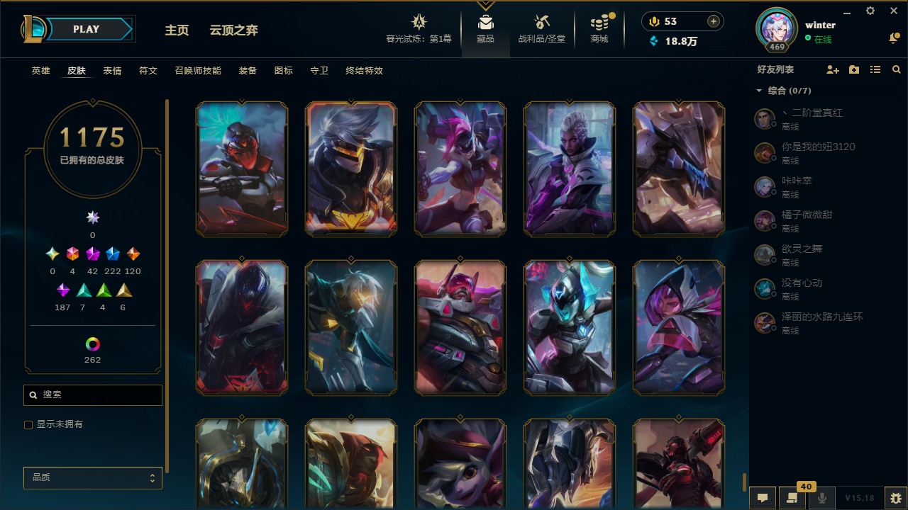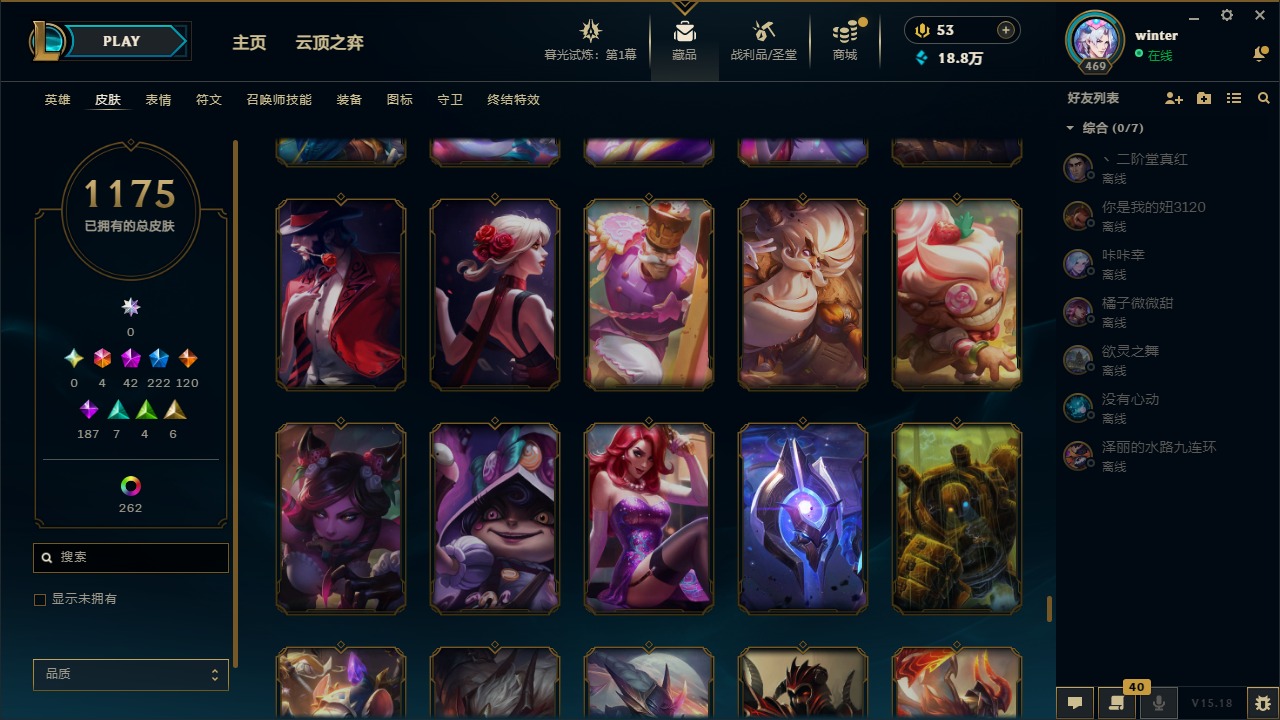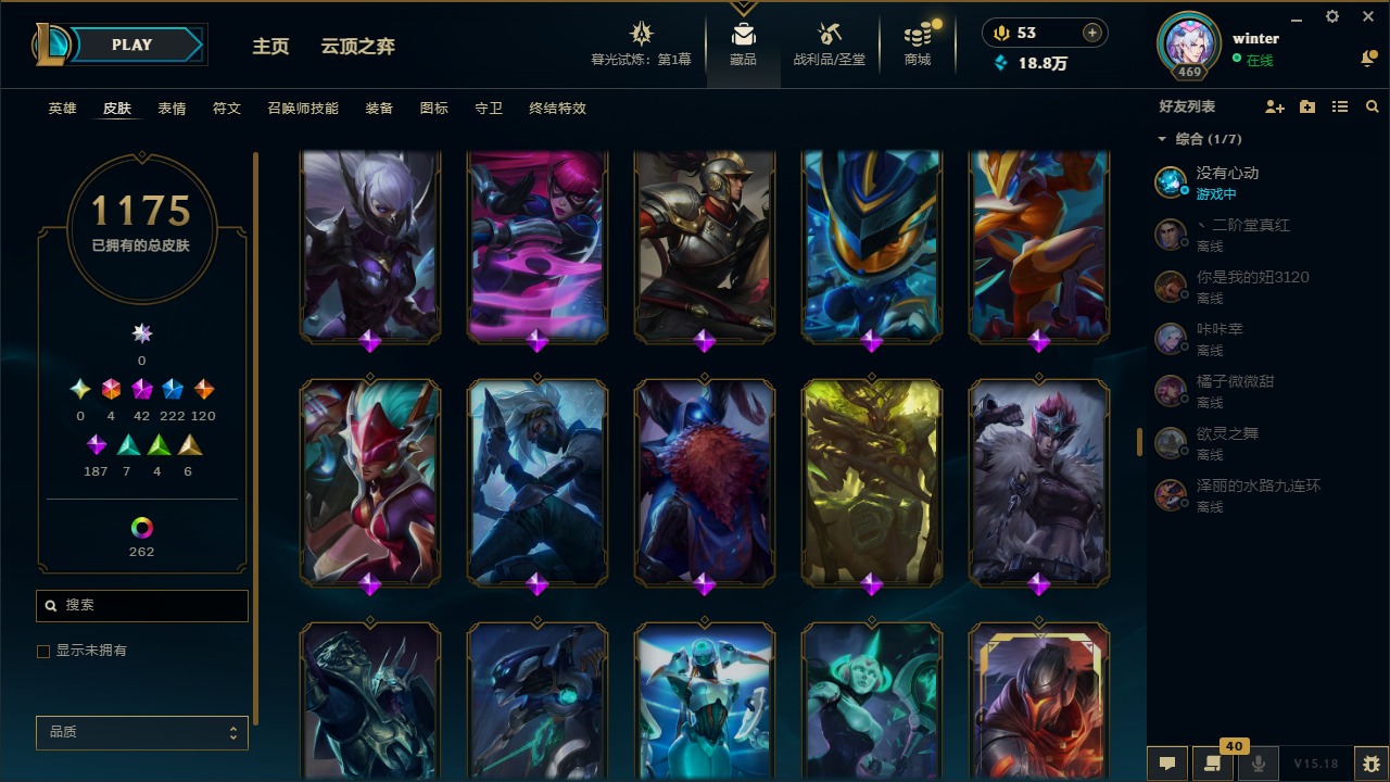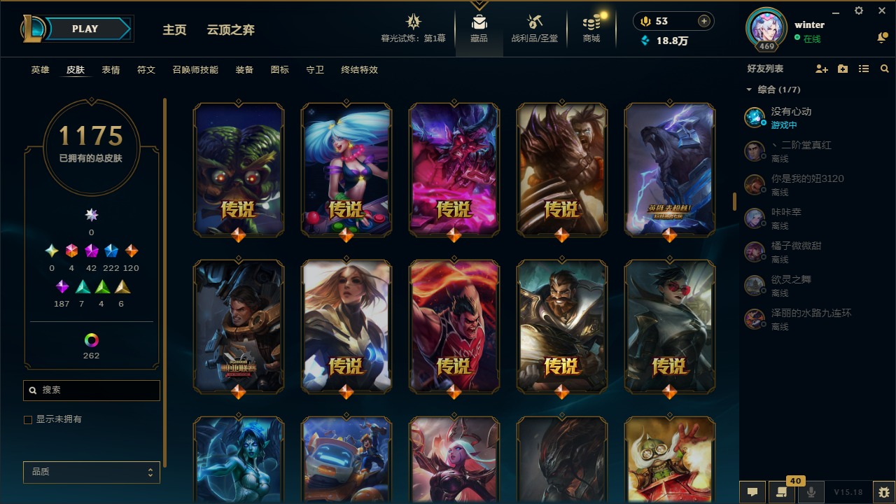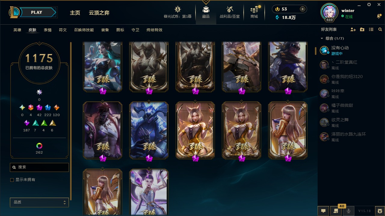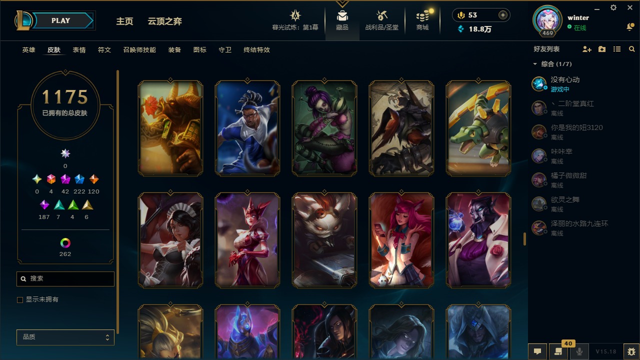 [11968358]4终极 42神话 222限定 120传说 187史诗 1175皮肤 306炫彩 171英雄 可二次 可修改实名 优质装备:至臻 腥红之月 亚托克斯,至臻 未来战士 锤石,至臻 烈焰美人 薇恩,至臻 K/DA 阿狸,至臻 黑夜使者 李青,至臻 K/DA 卡莎,至臻 星之守护者 妮寇,至臻 真实伤害 赛娜,至臻 飞升战神 潘森,至臻 魔女 乐芙兰,至臻 原计划:逆流 塞拉斯,至臻 灵能特工 伊泽瑞尔,至臻 未来战士 卢锡安,至臻 K/DA ALL OUT卡莎,永恒之森 奥恩,光明哨兵 奥拉夫,源代码 乐芙兰,防爆天使 凯尔,巧克力工坊 波比,地底世界 崔斯特,电玩战魂 人马,夺命美人 卡特,防爆机器人 布里茨,防爆士兵 炼金,防爆士兵 格雷福斯,钢铁之翼 凤凰,冠军典狱长 锤石,冠军蔷薇 乐芙兰,冠军之箭 艾希,冠军之矛 滑板鞋,冠军之血 希瓦娜,红桃杰克 崔斯特,惊悚派对 费德提克,警用试作体K-9 内瑟斯,克格汪 克格莫,密林猎手 提莫,破空枪骑 孙悟空,送披萨的小姐姐 希维尔,糖果使徒 费德提克,野兽猎人 德莱文,野兽猎人 瑟庄妮,野兽猎人 泰达米尔,永恒之森 乐芙兰,勇者 阿狸,勇者 奈德丽,御魔星矢 寒冰,征服者 阿利斯塔,征服者 卡尔玛,制胜金靴 李青,至臻 神凰行者 烈羽焰凰 霞,至臻 海之歌 萨勒芬妮,大元素使,灵魂守卫,未来战士,至臻 星之守护者 辛德拉,星之守护者 塔莉娅,至臻 海珀利安小队 迦娜,至臻 至高天 奎桑提,灰烬骑士 莫德凯撒,至臻 星之守护者 妮蔻,至臻 墨之影武者 亚索,斗魂觉醒 莎弥拉,2021 全球总决赛 嘉文四世,奥德赛 吉格斯,玉剑传说 无极 麒麟,源计划: 联合 艾希 红莲之弓,玉剑传说 舞剑仙 轩辕,冰霜之刃 艾瑞莉娅 炫金,玉净夜叉 凯特琳 炫金神机,霸天巨兽·雪崩 墨菲特,玉剑传说 苍鸾 丁香,神龙尊者 圣龙李青 龙腾云起,替父从军 花木兰 炫金龙刃,黎明使者 锐雯 黑夜使者,偶像歌手 阿理 极地雪莲,灵魂莲华 阿狸 春晓,皓彩霓裳 嫦娥,神龙烈焰 金克丝 珍珠龙息,西部魔影 卢锡安 贝利尔之怠,霸天剑魔 亚托克斯 涤罪之翼,灵魂莲华 永恩 春晓,至臻 魂蔷薇 烈娜塔,无畏竞巅峰 薇恩,无畏骑士 瑟庄妮 赤子初心,无畏圣弩 薇恩 绝境狂杀,巅峰猫咪 悠米 凯旋辅卫,巅峰魅影 乐芙兰 神龙之影,无畏游侠 卢锡安 不败圣