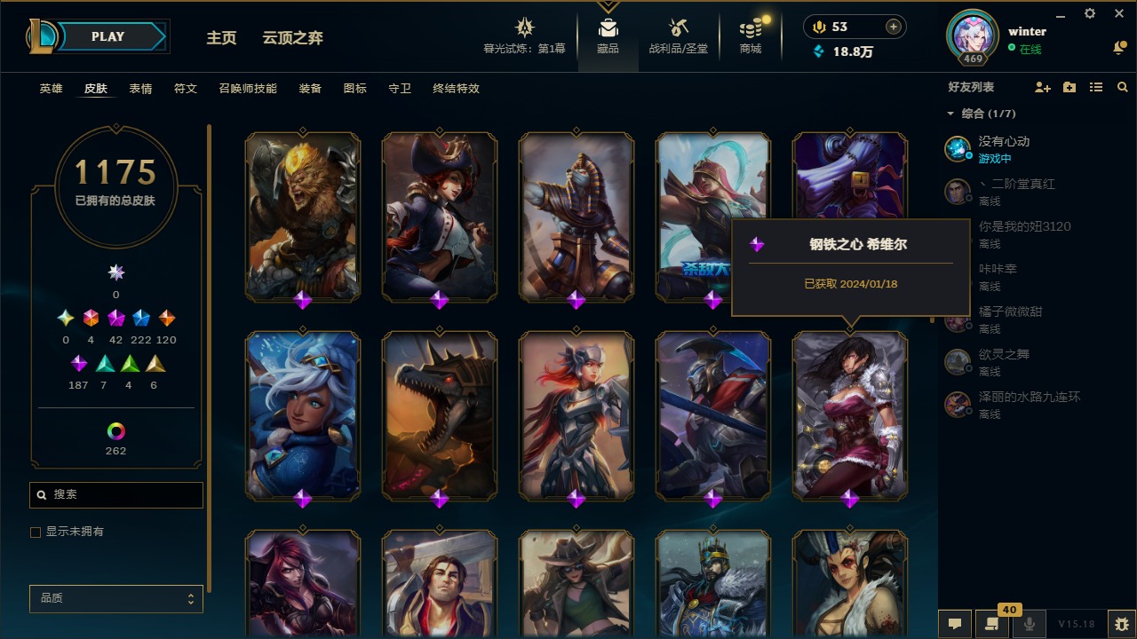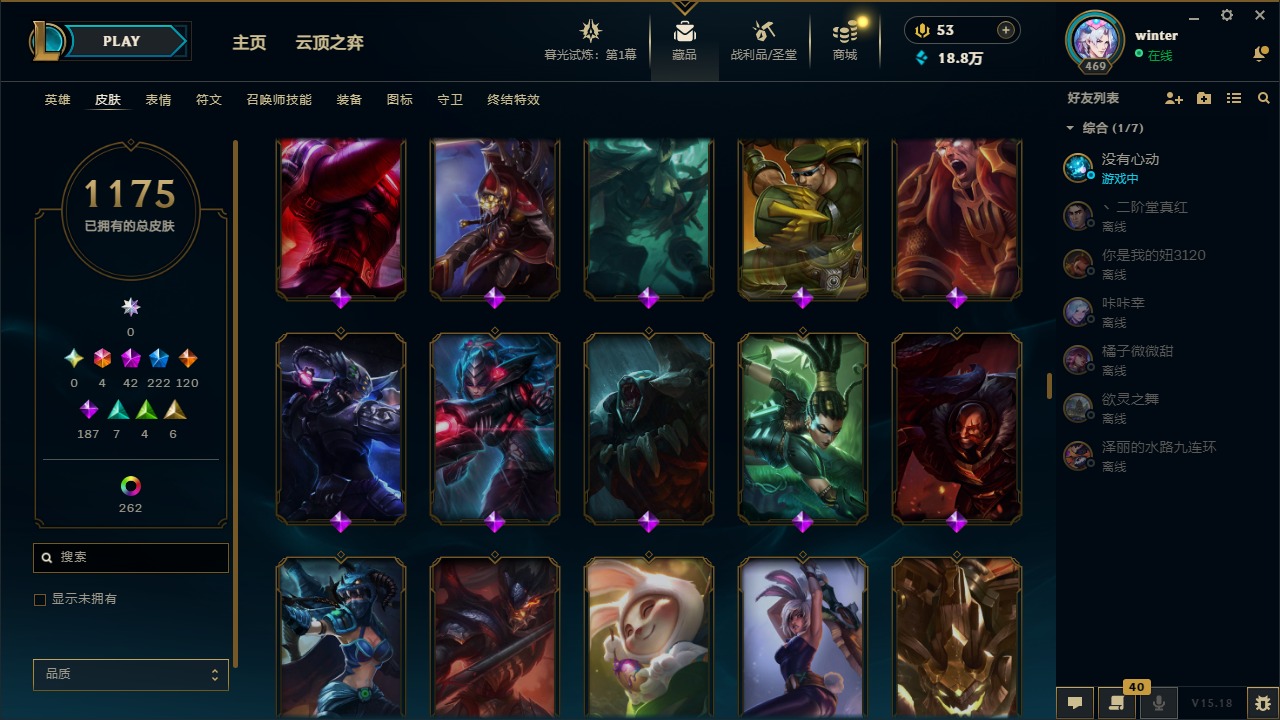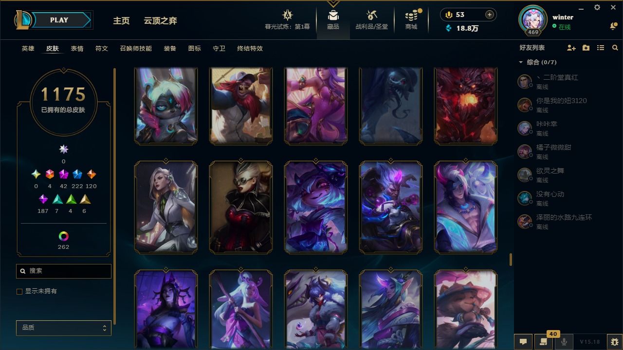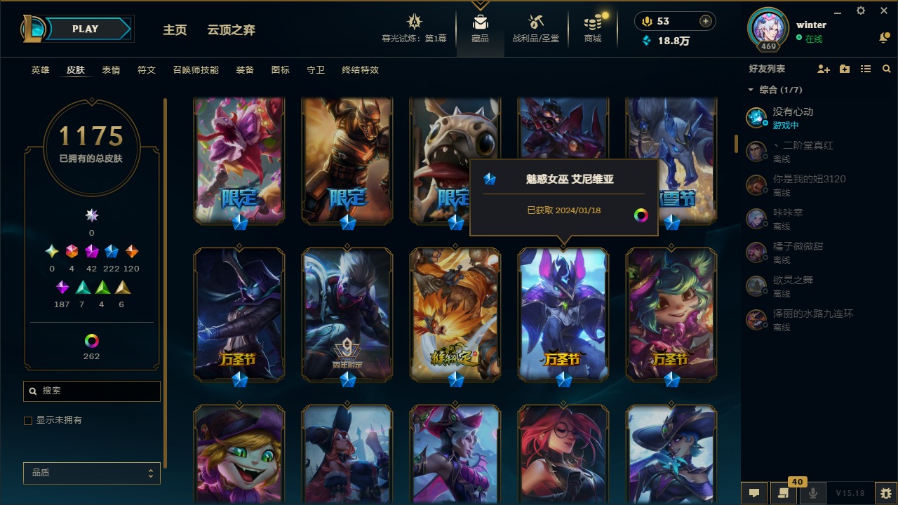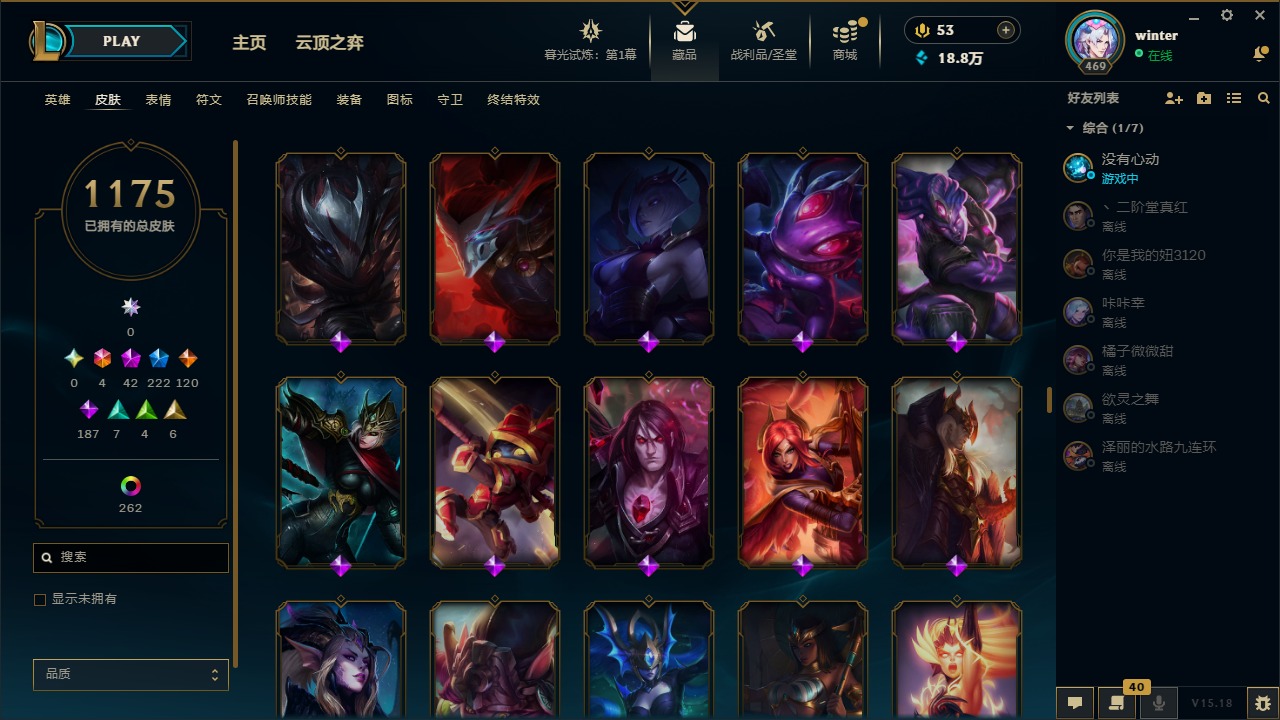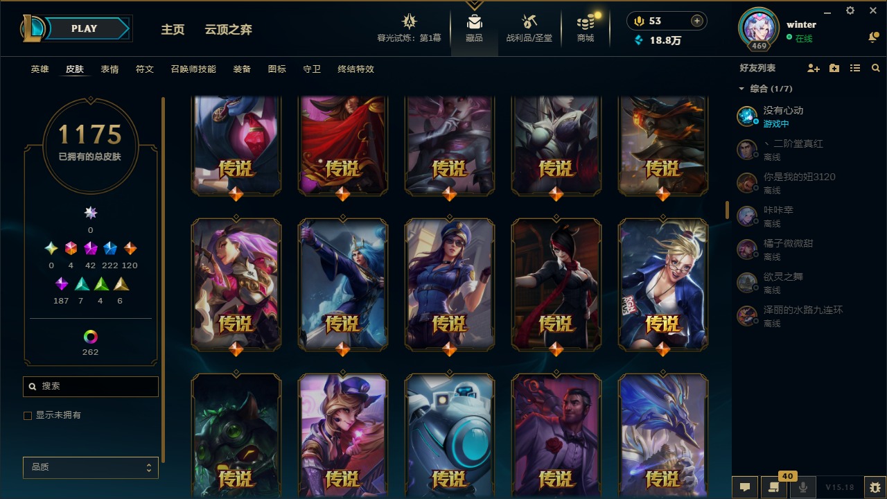 [11968358]4终极 42神话 222限定 120传说 187史诗 1175皮肤 306炫彩 171英雄 可二次 可修改实名 优质装备:至臻 腥红之月 亚托克斯,至臻 未来战士 锤石,至臻 烈焰美人 薇恩,至臻 K/DA 阿狸,至臻 黑夜使者 李青,至臻 K/DA 卡莎,至臻 星之守护者 妮寇,至臻 真实伤害 赛娜,至臻 飞升战神 潘森,至臻 魔女 乐芙兰,至臻 原计划:逆流 塞拉斯,至臻 灵能特工 伊泽瑞尔,至臻 未来战士 卢锡安,至臻 K/DA ALL OUT卡莎,永恒之森 奥恩,光明哨兵 奥拉夫,源代码 乐芙兰,防爆天使 凯尔,巧克力工坊 波比,地底世界 崔斯特,电玩战魂 人马,夺命美人 卡特,防爆机器人 布里茨,防爆士兵 炼金,防爆士兵 格雷福斯,钢铁之翼 凤凰,冠军典狱长 锤石,冠军蔷薇 乐芙兰,冠军之箭 艾希,冠军之矛 滑板鞋,冠军之血 希瓦娜,红桃杰克 崔斯特,惊悚派对 费德提克,警用试作体K-9 内瑟斯,克格汪 克格莫,密林猎手 提莫,破空枪骑 孙悟空,送披萨的小姐姐 希维尔,糖果使徒 费德提克,野兽猎人 德莱文,野兽猎人 瑟庄妮,野兽猎人 泰达米尔,永恒之森 乐芙兰,勇者 阿狸,勇者 奈德丽,御魔星矢 寒冰,征服者 阿利斯塔,征服者 卡尔玛,制胜金靴 李青,至臻 神凰行者 烈羽焰凰 霞,至臻 海之歌 萨勒芬妮,大元素使,灵魂守卫,未来战士,至臻 星之守护者 辛德拉,星之守护者 塔莉娅,至臻 海珀利安小队 迦娜,至臻 至高天 奎桑提,灰烬骑士 莫德凯撒,至臻 星之守护者 妮蔻,至臻 墨之影武者 亚索,斗魂觉醒 莎弥拉,2021 全球总决赛 嘉文四世,奥德赛 吉格斯,玉剑传说 无极 麒麟,源计划: 联合 艾希 红莲之弓,玉剑传说 舞剑仙 轩辕,冰霜之刃 艾瑞莉娅 炫金,玉净夜叉 凯特琳 炫金神机,霸天巨兽·雪崩 墨菲特,玉剑传说 苍鸾 丁香,神龙尊者 圣龙李青 龙腾云起,替父从军 花木兰 炫金龙刃,黎明使者 锐雯 黑夜使者,偶像歌手 阿理 极地雪莲,灵魂莲华 阿狸 春晓,皓彩霓裳 嫦娥,神龙烈焰 金克丝 珍珠龙息,西部魔影 卢锡安 贝利尔之怠,霸天剑魔 亚托克斯 涤罪之翼,灵魂莲华 永恩 春晓,至臻 魂蔷薇 烈娜塔,无畏竞巅峰 薇恩,无畏骑士 瑟庄妮 赤子初心,无畏圣弩 薇恩 绝境狂杀,巅峰猫咪 悠米 凯旋辅卫,巅峰魅影 乐芙兰 神龙之影,无畏游侠 卢锡安 不败圣