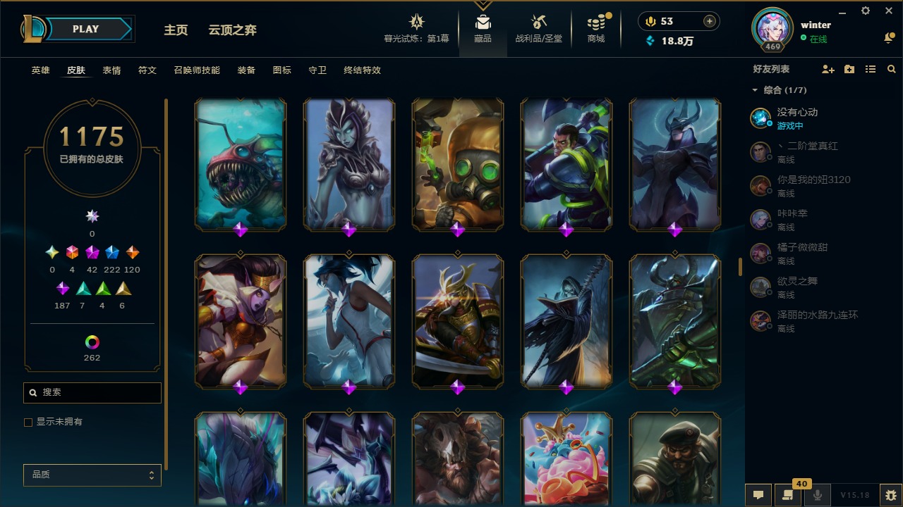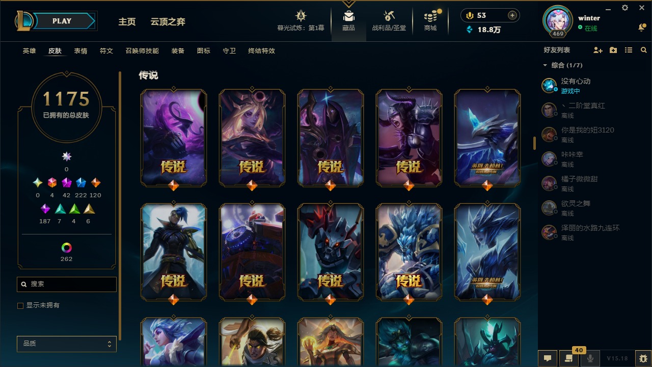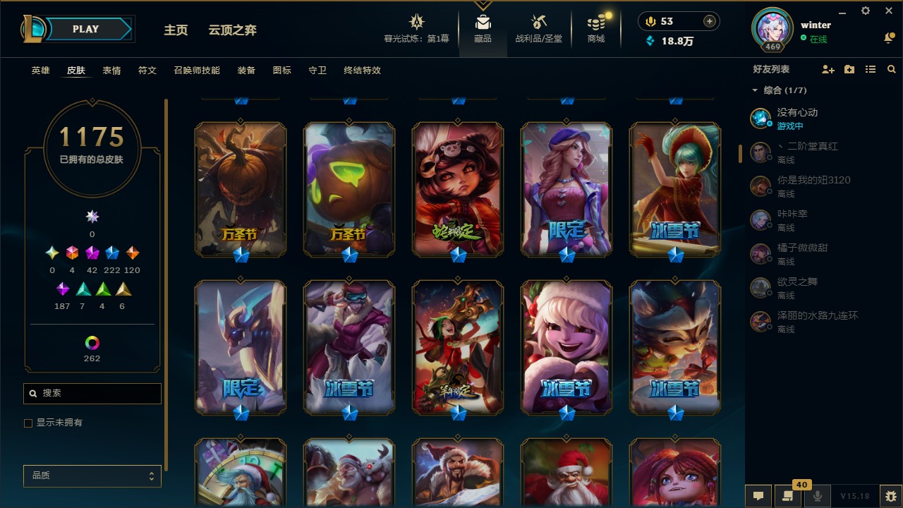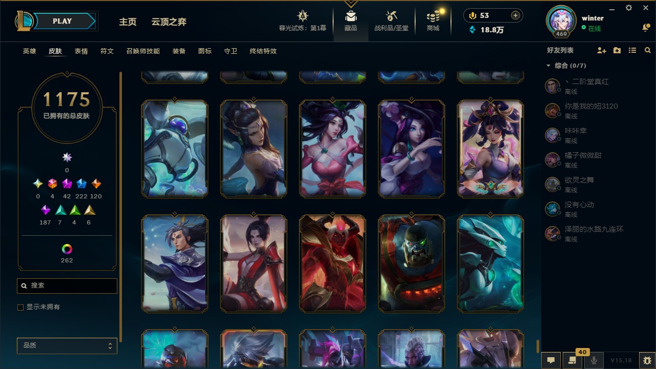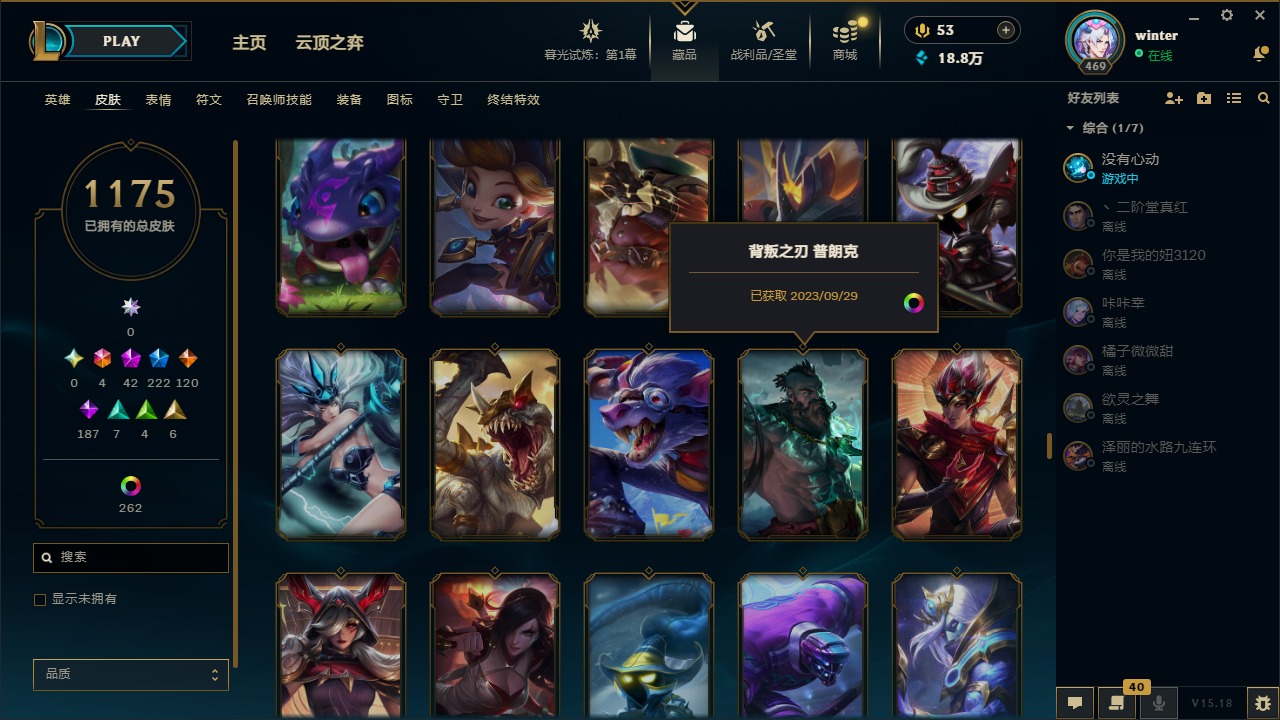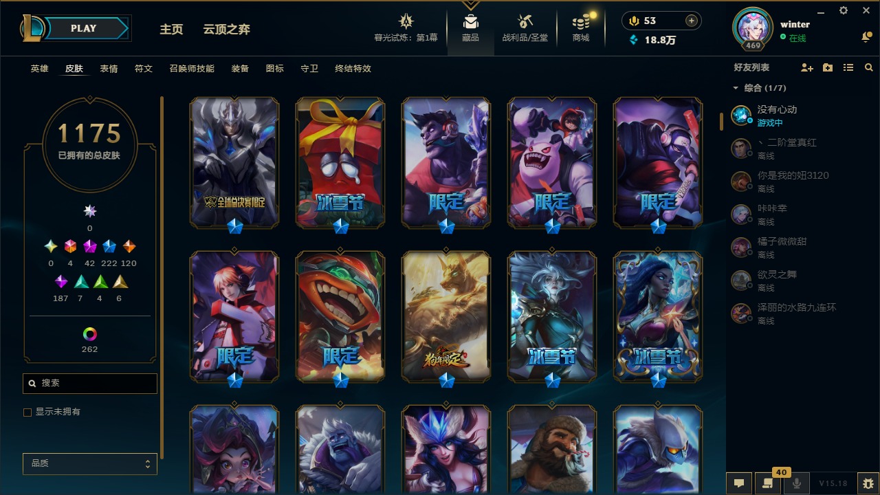 [11968358]4终极 42神话 222限定 120传说 187史诗 1175皮肤 306炫彩 171英雄 可二次 可修改实名 优质装备:至臻 腥红之月 亚托克斯,至臻 未来战士 锤石,至臻 烈焰美人 薇恩,至臻 K/DA 阿狸,至臻 黑夜使者 李青,至臻 K/DA 卡莎,至臻 星之守护者 妮寇,至臻 真实伤害 赛娜,至臻 飞升战神 潘森,至臻 魔女 乐芙兰,至臻 原计划:逆流 塞拉斯,至臻 灵能特工 伊泽瑞尔,至臻 未来战士 卢锡安,至臻 K/DA ALL OUT卡莎,永恒之森 奥恩,光明哨兵 奥拉夫,源代码 乐芙兰,防爆天使 凯尔,巧克力工坊 波比,地底世界 崔斯特,电玩战魂 人马,夺命美人 卡特,防爆机器人 布里茨,防爆士兵 炼金,防爆士兵 格雷福斯,钢铁之翼 凤凰,冠军典狱长 锤石,冠军蔷薇 乐芙兰,冠军之箭 艾希,冠军之矛 滑板鞋,冠军之血 希瓦娜,红桃杰克 崔斯特,惊悚派对 费德提克,警用试作体K-9 内瑟斯,克格汪 克格莫,密林猎手 提莫,破空枪骑 孙悟空,送披萨的小姐姐 希维尔,糖果使徒 费德提克,野兽猎人 德莱文,野兽猎人 瑟庄妮,野兽猎人 泰达米尔,永恒之森 乐芙兰,勇者 阿狸,勇者 奈德丽,御魔星矢 寒冰,征服者 阿利斯塔,征服者 卡尔玛,制胜金靴 李青,至臻 神凰行者 烈羽焰凰 霞,至臻 海之歌 萨勒芬妮,大元素使,灵魂守卫,未来战士,至臻 星之守护者 辛德拉,星之守护者 塔莉娅,至臻 海珀利安小队 迦娜,至臻 至高天 奎桑提,灰烬骑士 莫德凯撒,至臻 星之守护者 妮蔻,至臻 墨之影武者 亚索,斗魂觉醒 莎弥拉,2021 全球总决赛 嘉文四世,奥德赛 吉格斯,玉剑传说 无极 麒麟,源计划: 联合 艾希 红莲之弓,玉剑传说 舞剑仙 轩辕,冰霜之刃 艾瑞莉娅 炫金,玉净夜叉 凯特琳 炫金神机,霸天巨兽·雪崩 墨菲特,玉剑传说 苍鸾 丁香,神龙尊者 圣龙李青 龙腾云起,替父从军 花木兰 炫金龙刃,黎明使者 锐雯 黑夜使者,偶像歌手 阿理 极地雪莲,灵魂莲华 阿狸 春晓,皓彩霓裳 嫦娥,神龙烈焰 金克丝 珍珠龙息,西部魔影 卢锡安 贝利尔之怠,霸天剑魔 亚托克斯 涤罪之翼,灵魂莲华 永恩 春晓,至臻 魂蔷薇 烈娜塔,无畏竞巅峰 薇恩,无畏骑士 瑟庄妮 赤子初心,无畏圣弩 薇恩 绝境狂杀,巅峰猫咪 悠米 凯旋辅卫,巅峰魅影 乐芙兰 神龙之影,无畏游侠 卢锡安 不败圣