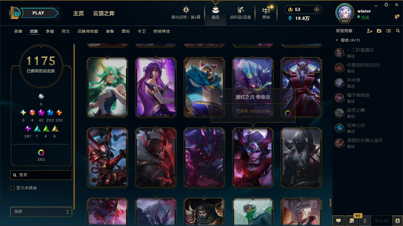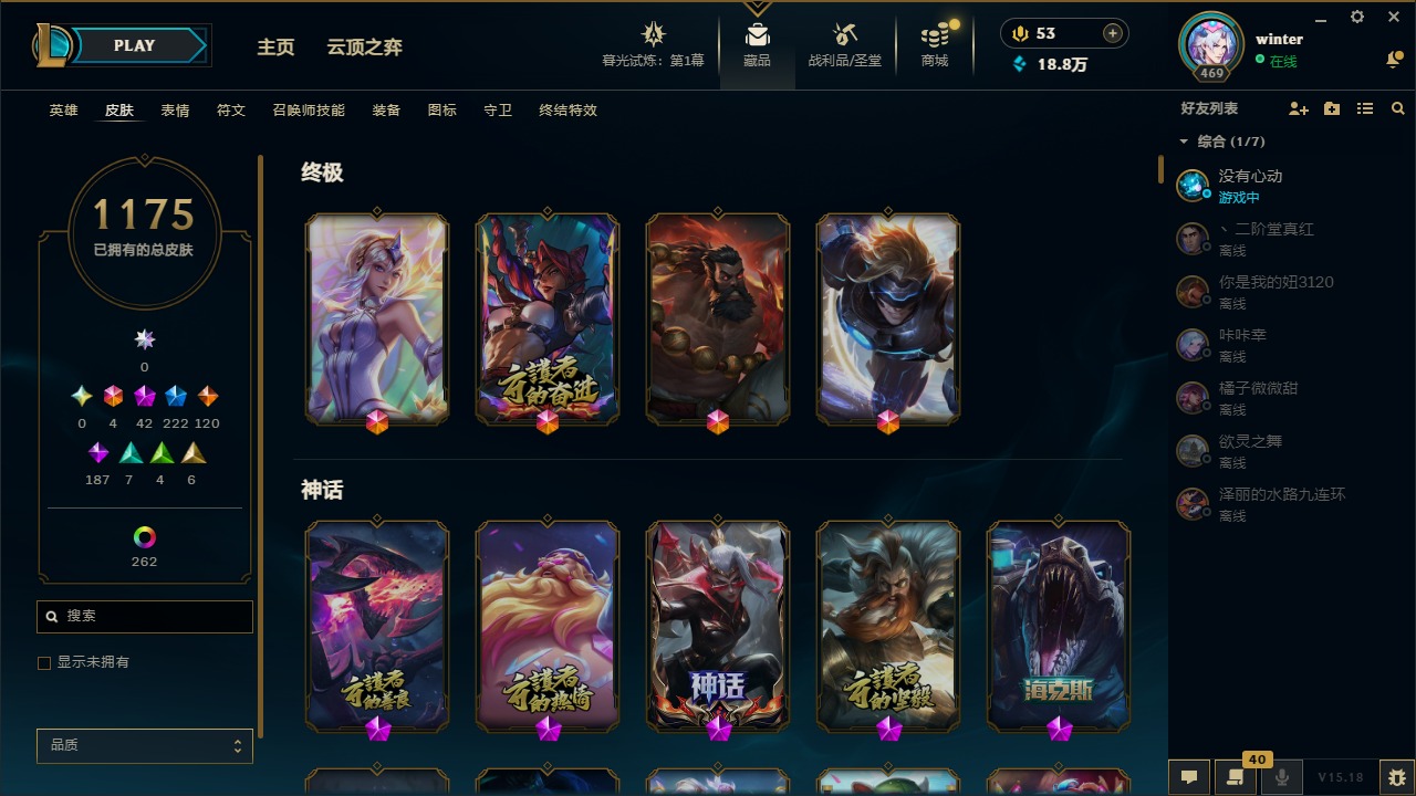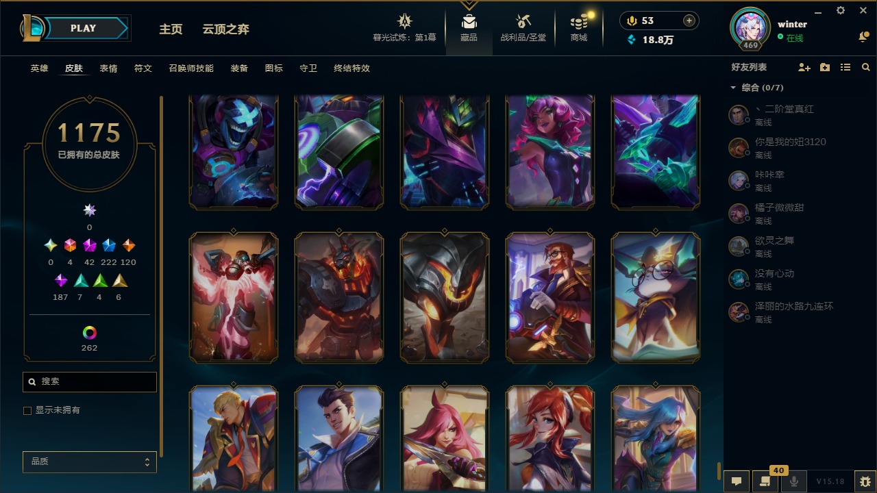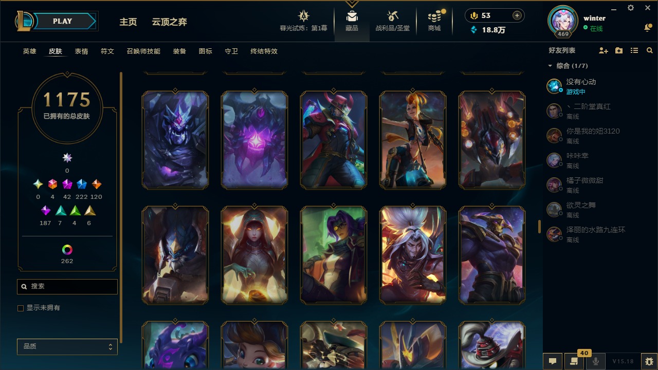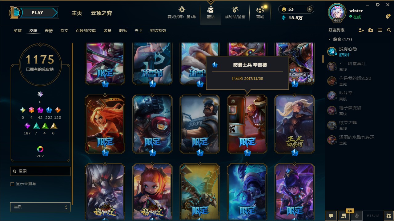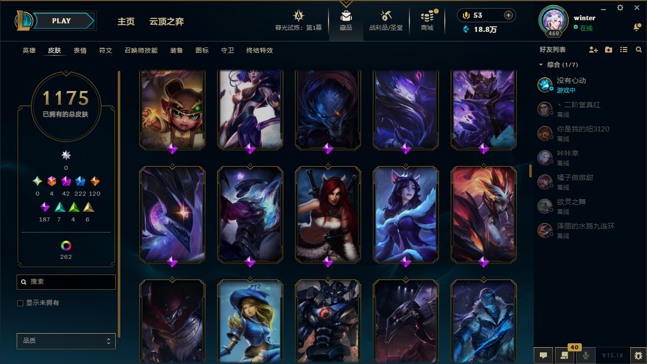 [11968358]4终极 42神话 222限定 120传说 187史诗 1175皮肤 306炫彩 171英雄 可二次 可修改实名 优质装备:至臻 腥红之月 亚托克斯,至臻 未来战士 锤石,至臻 烈焰美人 薇恩,至臻 K/DA 阿狸,至臻 黑夜使者 李青,至臻 K/DA 卡莎,至臻 星之守护者 妮寇,至臻 真实伤害 赛娜,至臻 飞升战神 潘森,至臻 魔女 乐芙兰,至臻 原计划:逆流 塞拉斯,至臻 灵能特工 伊泽瑞尔,至臻 未来战士 卢锡安,至臻 K/DA ALL OUT卡莎,永恒之森 奥恩,光明哨兵 奥拉夫,源代码 乐芙兰,防爆天使 凯尔,巧克力工坊 波比,地底世界 崔斯特,电玩战魂 人马,夺命美人 卡特,防爆机器人 布里茨,防爆士兵 炼金,防爆士兵 格雷福斯,钢铁之翼 凤凰,冠军典狱长 锤石,冠军蔷薇 乐芙兰,冠军之箭 艾希,冠军之矛 滑板鞋,冠军之血 希瓦娜,红桃杰克 崔斯特,惊悚派对 费德提克,警用试作体K-9 内瑟斯,克格汪 克格莫,密林猎手 提莫,破空枪骑 孙悟空,送披萨的小姐姐 希维尔,糖果使徒 费德提克,野兽猎人 德莱文,野兽猎人 瑟庄妮,野兽猎人 泰达米尔,永恒之森 乐芙兰,勇者 阿狸,勇者 奈德丽,御魔星矢 寒冰,征服者 阿利斯塔,征服者 卡尔玛,制胜金靴 李青,至臻 神凰行者 烈羽焰凰 霞,至臻 海之歌 萨勒芬妮,大元素使,灵魂守卫,未来战士,至臻 星之守护者 辛德拉,星之守护者 塔莉娅,至臻 海珀利安小队 迦娜,至臻 至高天 奎桑提,灰烬骑士 莫德凯撒,至臻 星之守护者 妮蔻,至臻 墨之影武者 亚索,斗魂觉醒 莎弥拉,2021 全球总决赛 嘉文四世,奥德赛 吉格斯,玉剑传说 无极 麒麟,源计划: 联合 艾希 红莲之弓,玉剑传说 舞剑仙 轩辕,冰霜之刃 艾瑞莉娅 炫金,玉净夜叉 凯特琳 炫金神机,霸天巨兽·雪崩 墨菲特,玉剑传说 苍鸾 丁香,神龙尊者 圣龙李青 龙腾云起,替父从军 花木兰 炫金龙刃,黎明使者 锐雯 黑夜使者,偶像歌手 阿理 极地雪莲,灵魂莲华 阿狸 春晓,皓彩霓裳 嫦娥,神龙烈焰 金克丝 珍珠龙息,西部魔影 卢锡安 贝利尔之怠,霸天剑魔 亚托克斯 涤罪之翼,灵魂莲华 永恩 春晓,至臻 魂蔷薇 烈娜塔,无畏竞巅峰 薇恩,无畏骑士 瑟庄妮 赤子初心,无畏圣弩 薇恩 绝境狂杀,巅峰猫咪 悠米 凯旋辅卫,巅峰魅影 乐芙兰 神龙之影,无畏游侠 卢锡安 不败圣