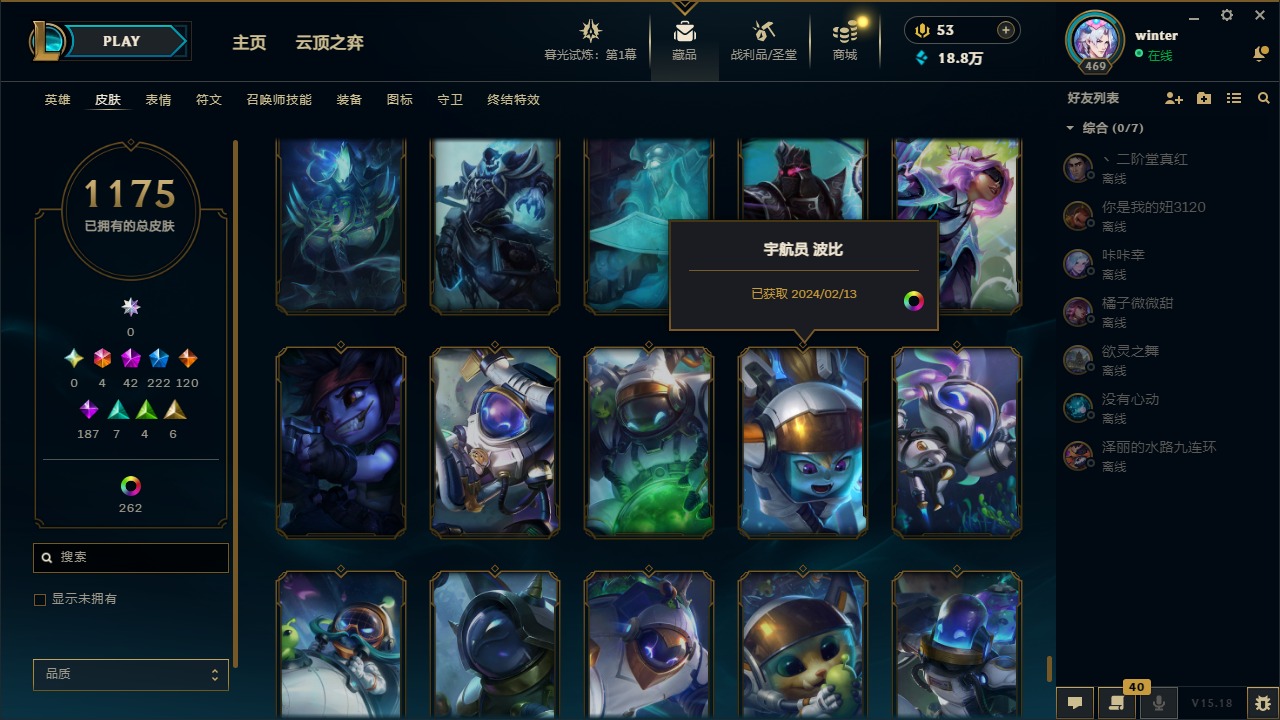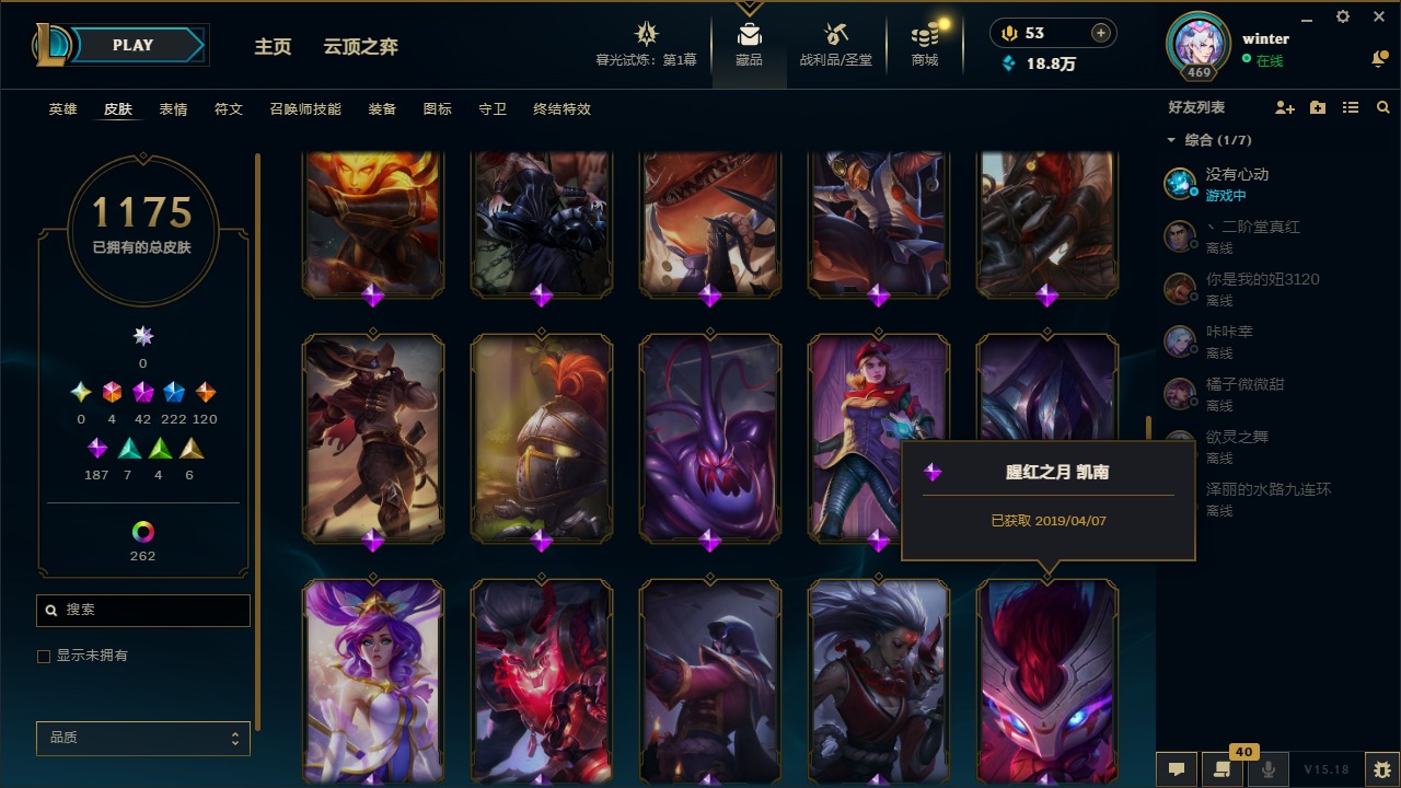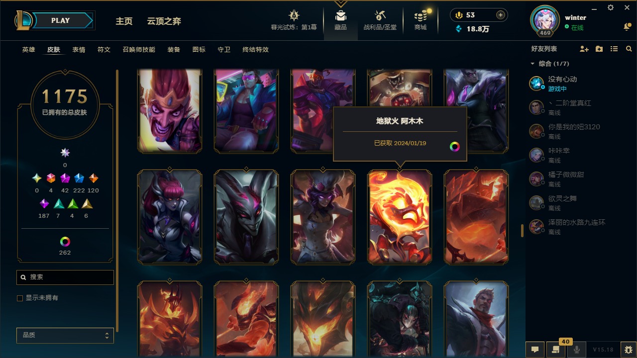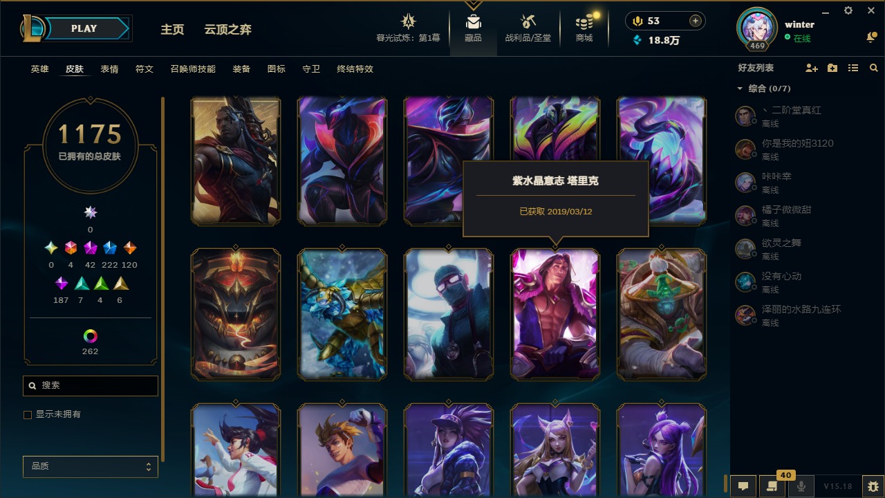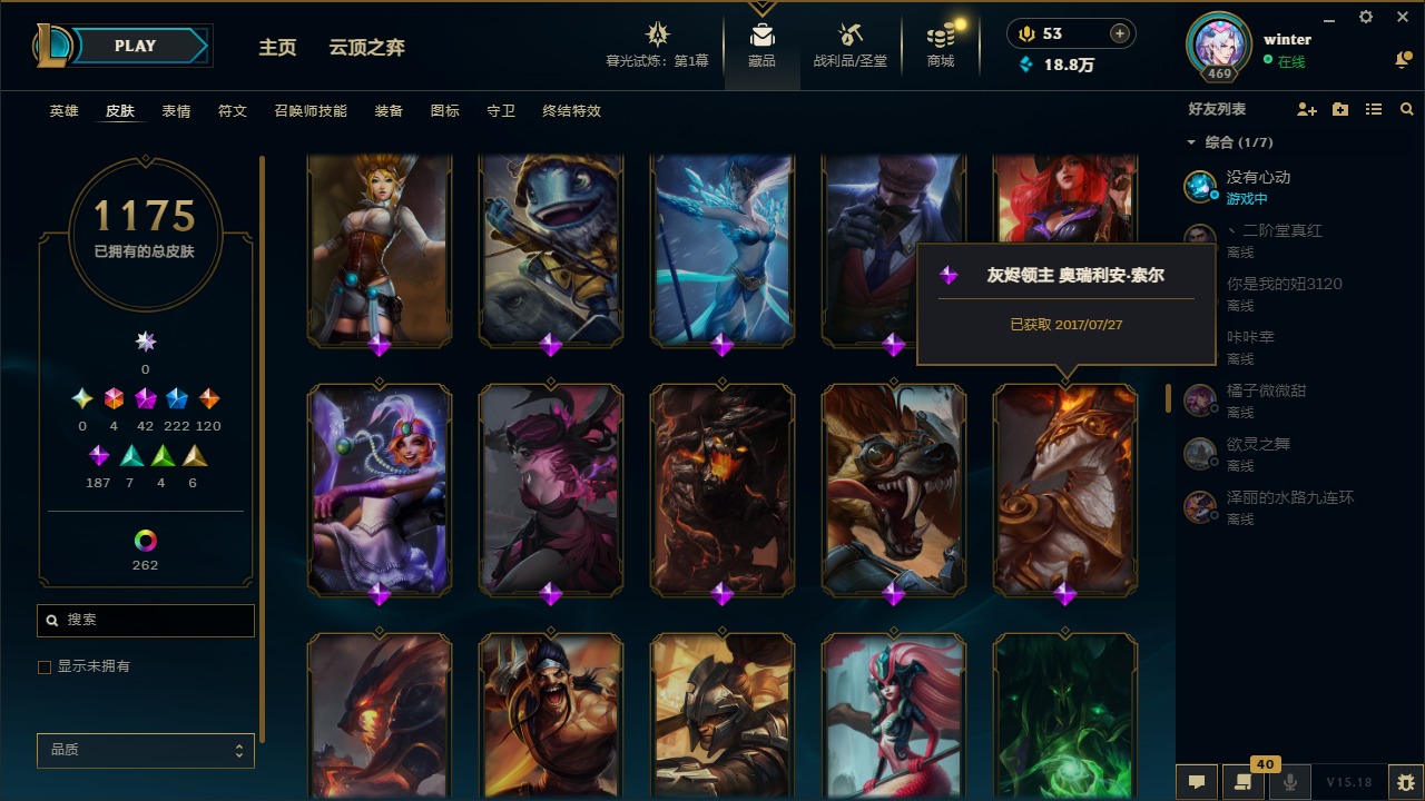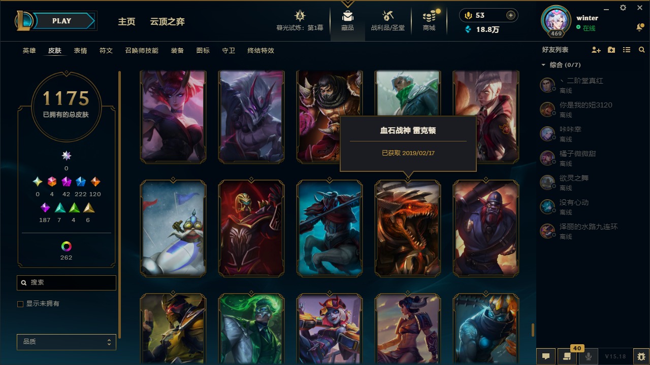 [11968358]4终极 42神话 222限定 120传说 187史诗 1175皮肤 306炫彩 171英雄 可二次 可修改实名 优质装备:至臻 腥红之月 亚托克斯,至臻 未来战士 锤石,至臻 烈焰美人 薇恩,至臻 K/DA 阿狸,至臻 黑夜使者 李青,至臻 K/DA 卡莎,至臻 星之守护者 妮寇,至臻 真实伤害 赛娜,至臻 飞升战神 潘森,至臻 魔女 乐芙兰,至臻 原计划:逆流 塞拉斯,至臻 灵能特工 伊泽瑞尔,至臻 未来战士 卢锡安,至臻 K/DA ALL OUT卡莎,永恒之森 奥恩,光明哨兵 奥拉夫,源代码 乐芙兰,防爆天使 凯尔,巧克力工坊 波比,地底世界 崔斯特,电玩战魂 人马,夺命美人 卡特,防爆机器人 布里茨,防爆士兵 炼金,防爆士兵 格雷福斯,钢铁之翼 凤凰,冠军典狱长 锤石,冠军蔷薇 乐芙兰,冠军之箭 艾希,冠军之矛 滑板鞋,冠军之血 希瓦娜,红桃杰克 崔斯特,惊悚派对 费德提克,警用试作体K-9 内瑟斯,克格汪 克格莫,密林猎手 提莫,破空枪骑 孙悟空,送披萨的小姐姐 希维尔,糖果使徒 费德提克,野兽猎人 德莱文,野兽猎人 瑟庄妮,野兽猎人 泰达米尔,永恒之森 乐芙兰,勇者 阿狸,勇者 奈德丽,御魔星矢 寒冰,征服者 阿利斯塔,征服者 卡尔玛,制胜金靴 李青,至臻 神凰行者 烈羽焰凰 霞,至臻 海之歌 萨勒芬妮,大元素使,灵魂守卫,未来战士,至臻 星之守护者 辛德拉,星之守护者 塔莉娅,至臻 海珀利安小队 迦娜,至臻 至高天 奎桑提,灰烬骑士 莫德凯撒,至臻 星之守护者 妮蔻,至臻 墨之影武者 亚索,斗魂觉醒 莎弥拉,2021 全球总决赛 嘉文四世,奥德赛 吉格斯,玉剑传说 无极 麒麟,源计划: 联合 艾希 红莲之弓,玉剑传说 舞剑仙 轩辕,冰霜之刃 艾瑞莉娅 炫金,玉净夜叉 凯特琳 炫金神机,霸天巨兽·雪崩 墨菲特,玉剑传说 苍鸾 丁香,神龙尊者 圣龙李青 龙腾云起,替父从军 花木兰 炫金龙刃,黎明使者 锐雯 黑夜使者,偶像歌手 阿理 极地雪莲,灵魂莲华 阿狸 春晓,皓彩霓裳 嫦娥,神龙烈焰 金克丝 珍珠龙息,西部魔影 卢锡安 贝利尔之怠,霸天剑魔 亚托克斯 涤罪之翼,灵魂莲华 永恩 春晓,至臻 魂蔷薇 烈娜塔,无畏竞巅峰 薇恩,无畏骑士 瑟庄妮 赤子初心,无畏圣弩 薇恩 绝境狂杀,巅峰猫咪 悠米 凯旋辅卫,巅峰魅影 乐芙兰 神龙之影,无畏游侠 卢锡安 不败圣