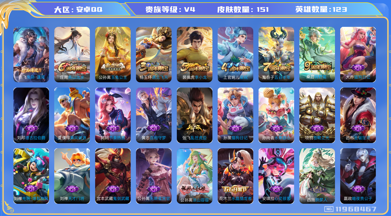- PX_2096858-实名: 可修改 贵族等级: V4 英雄数: 94 皮肤数: 67 传说皮: 乘龙·淬吴钩,典韦战鼓燎原