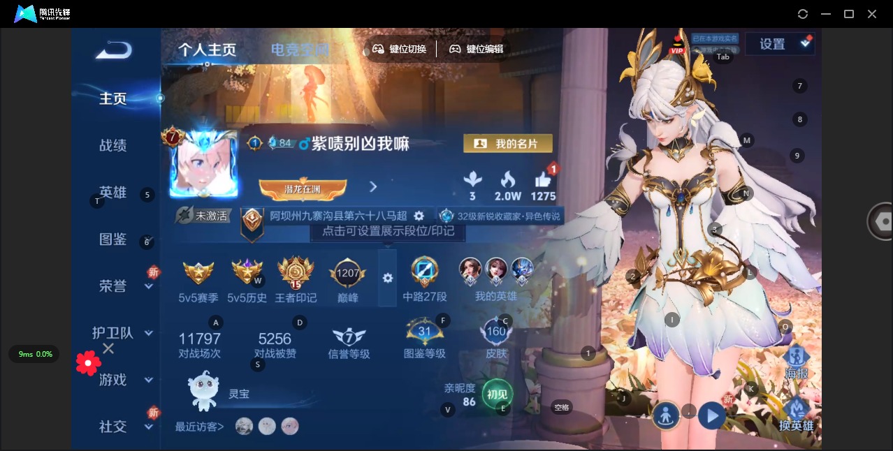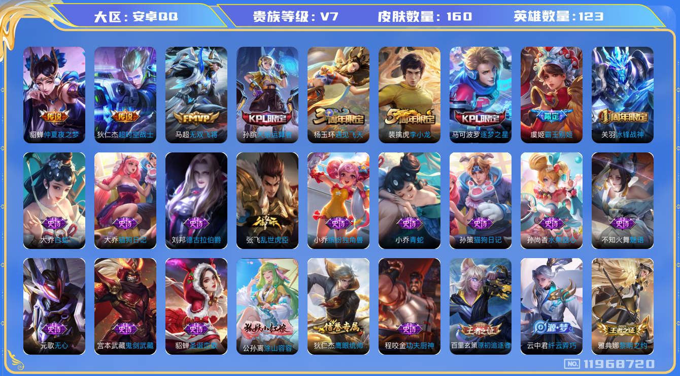 - PX_2082984-实名: 不可修改 贵族等级: V9 英雄数: 124 皮肤数: 265 荣耀水晶: 天鹅之梦,幻阙歌,拾光映像,最初的交响 无双皮: 真我赫兹(瑶),小乔时之魔女 珍品传说: 怪盗基德 星传说: 时之愿境,金色仲夏夜,星际治安官 传说皮: 云鹰飞将,仲夏夜之梦,音你心动-周瑜,乞巧织情,游龙清影,碎云,记忆之芯,妄想奇谈,大乔-时之奇旅,幻光神枪 限定皮: 祈雪灵祝,时之彼端