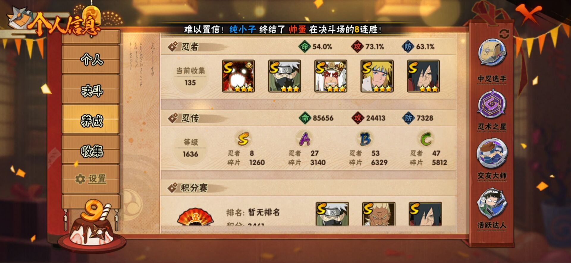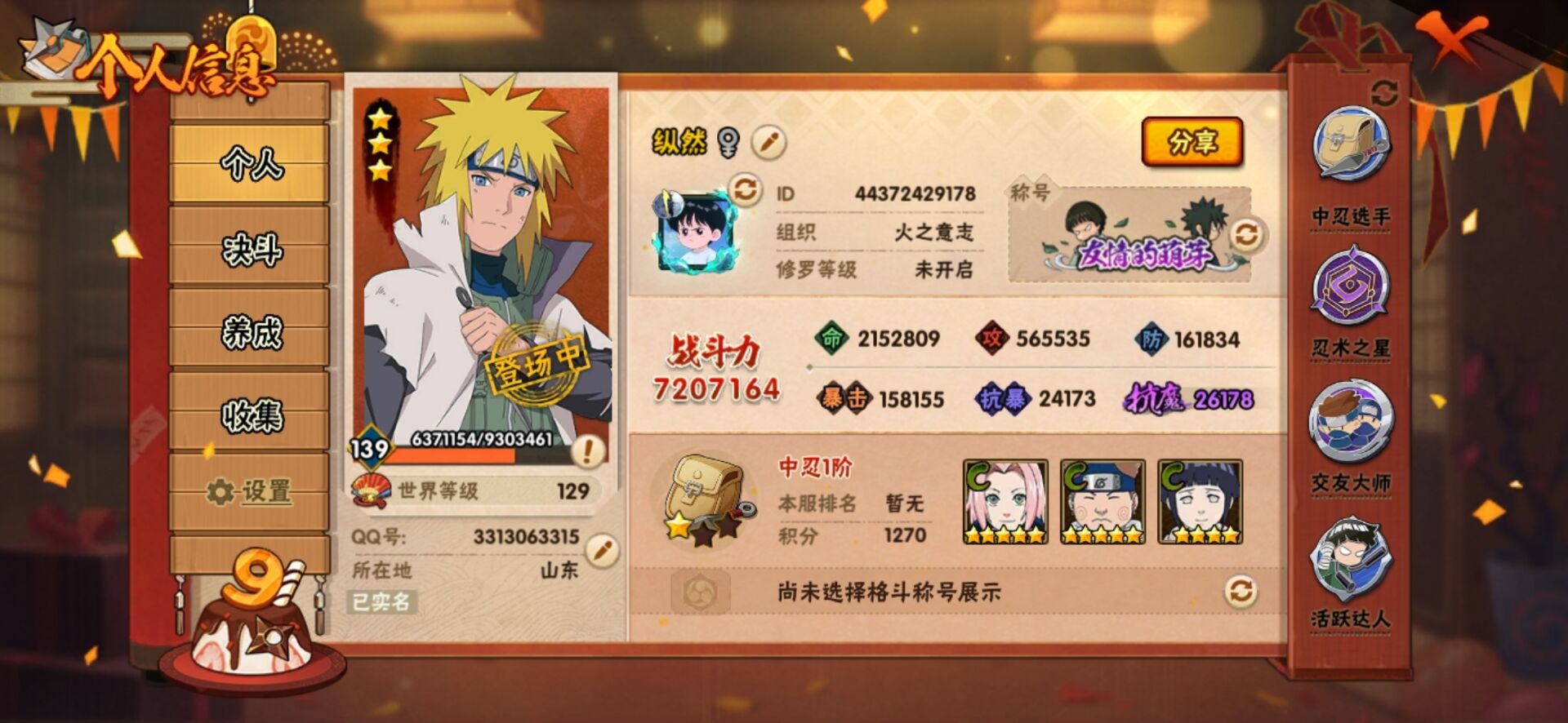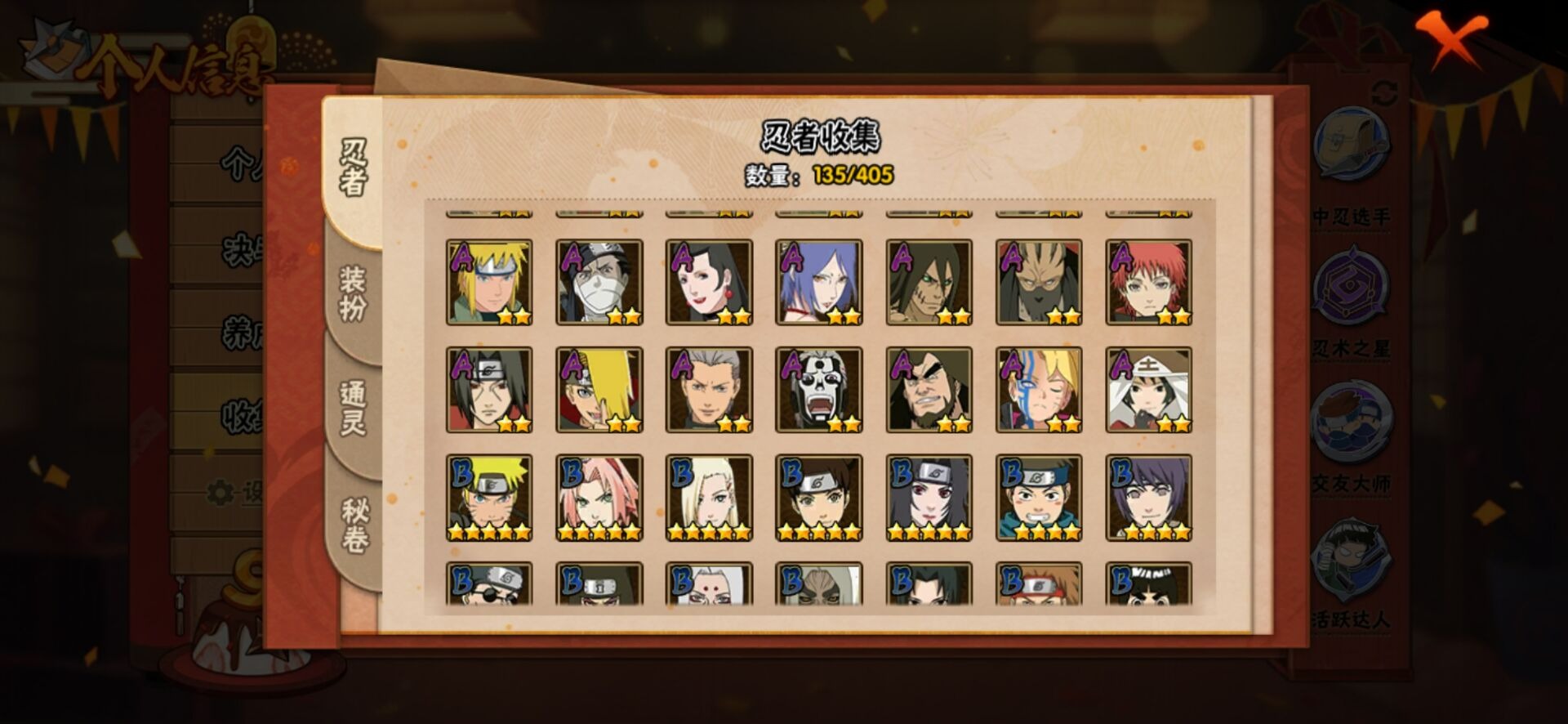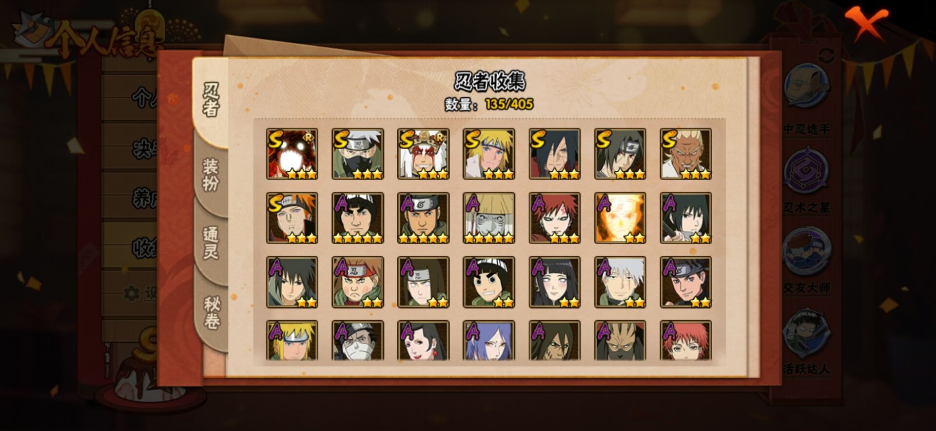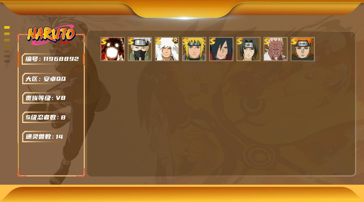 [11968892]V8 8S忍 34A忍 14通灵 720.7W战力 可二次 可修改实名 优质装备:宇智波斑「秽土转生·解」,艾「忍界大战」,旗木卡卡西「须佐能乎」,漩涡鸣人 「暴怒·第六尾」 S级忍者:自来也 「舞之豪杰」,宇智波鼬 「须佐能乎」,佩恩「天道」,波风水门