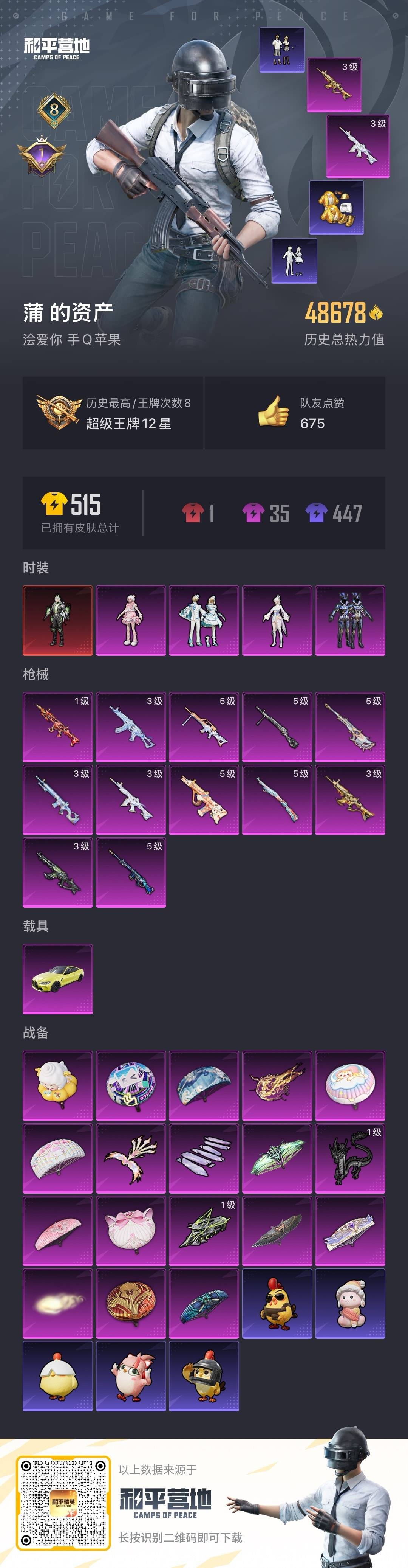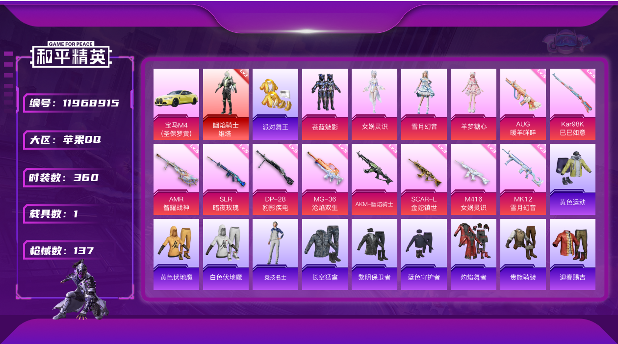 [11968915]1红装 4粉装 12特效枪 1载具 8印记 可二次 可修改实名 身法装备:舞王派对(派对舞王、小金鞋) 优质装备:幽焰骑士-维塔 ,一级幽焰骑士-维塔(1级维塔),宝马M4(圣保罗黄),舞王派对(派对舞王、小金鞋),苍蓝魅影,SLR暗夜玫瑰,AKM-幽焰骑士,女娲灵识,M416-女娲灵识,SCAR-L金蛇镇世,AUG-暖羊咩咩,雪月幻音,MK12-雪月幻音,AMR-智耀战神,羊梦糖心,Kar98K-巳巳如意 热门装扮:派对舞王(小金鞋) 稀有枪皮:MG-36-沧焰双生,DP-28-豹影疾电 五级特效枪:五级Kar98K-巳巳如意,五级DP-28-豹影疾电,五级MG-36-沧焰双生,五级AUG-暖羊咩咩,五级AMR-智耀战神,五级SLR-暗夜玫瑰 三级特效枪:三级AKM-幽焰骑士,三级M416-女娲灵识,三级SCAR-L金蛇镇世,三级MK12-雪月幻音 紫色装扮:SS31特训套装,人气偶像,极速光影,SS30特训套装,云朵鹅,彩虹兔,雪绒豹,SS33特训套装,顶瓜瓜,SS15特训,SS16特训,银白舞王,萌趣颜团子,特种颜团子,SS19特训,吉莉礼服,瑞龙福将,团圆交子,SS17特训,SS18特训,都市魅力,野性战魂,长空猛禽,迎春赐吉,缤纷果语,蓝彩潮人,蓝色守护者,虎虎生威吉莉,风行保卫者,龙腾端午,魅力单车,黄色伏地魔,黄色运动,黎明保卫者,龙的传人,蝶变,银刃勇者大衣,朋克治安官,极地朋克,格斗先锋,滨海假日,滨海厨神,白色伏地魔,破晓战魂,破蛋小黄鸡,福星高照,潮流先锋,灼焰舞者,热血青春,燃烧卡路里,SS29特训,先驱飞行员,星途旅人,SS28特训,异域银装,鱼渊荷华,燕燕于飞,都市丽猫,青团波波,糖糖葫芦,棉花软糖,竞技名士,街头风暴,SS25特训,SS27特训,晶辉守护,大橘大利,粉恋花,蓝冰羽,紫幽梦,SS32特训服(SS32特训套装),闪电轻猫,纯白跃动,蜜桃派对,恋语绒绒,金耀舞者,贵族骑装,弄潮海豚,光之冒险,海上生明月 优质战备:圣堂之誓降落伞,龙翔九天飞行器,星途旅人降落伞,英伦信使降落伞,千金淑猫降落伞,镜域双华-灵镜之阶,蜜语绒猫降落伞,幽焰列车飞行器,幽焰骑士降落伞,幻彩电音降落伞,喜羊羊与灰太狼降落伞,万象金身飞行器,凤舞九天飞行器,临安公主降落伞,雪月幻音降落伞,彩虹独角兽降落伞,暗夜玫瑰降落伞,飞行器-齐天大圣,齐天大圣降落