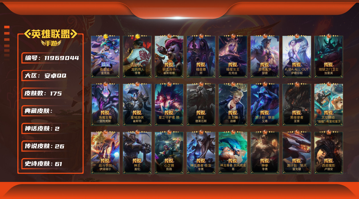 [11969044]26传说 61史诗 175皮肤 可二次 可修改实名 优质装备:暗星尊,黑夜使者亚索,K/DA ALLOUT萨勒芬妮,黎明使者锐雯,女主播风女,神龙尊者 驭风啸龙,神拳盲僧,神王盖伦,神王诺手,天煞劫,西部魔影卢锡安,星域游侠卡牌,星之守护者 陨,驯龙炮手,源计划:联合,战斗学院ez,玉剑传说 武剑仙,灵魂莲华锤石,源计划:泯灭,暗星女王拉克丝,龙的传人,灵魂莲华腕豪,心之钢凯隐,龙的传人 段位:王者 神话皮:夜星流火 金克丝 限定皮肤:涂鸦小队艾克 传说皮:神龙尊者 圣龙 李青,海魔至尊 亚托克斯,太空律动机器人,地狱之门卫士,黎明使者永恩