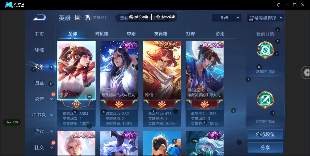 - [11688527]V8 1典藏 11传说 120英雄 197皮肤 可修改实名 优质装备:杀手不太冷,黄金狮子座,久胜战神,一念神魔,末日机甲-孙尚香(绿蚂蚱),零号·赤焰,胖达荣荣,时之恋人-刘备(电焊工) 限定皮:至尊宝,太华(伽罗年限),飞衡(韩信年限),遇见飞天,五谷丰年,武圣,游园惊梦,梁祝,天狼狩猎者,李小龙,逐梦之光,玄武志(苏烈年限),辉光之辰,一生所爱,大圣娶亲,天魔缭乱 史诗皮:白龙吟,黄金分割率,千年之狐,魅语,无限星赏官,冰冠公主,偶像歌手,晚萤,猫狗日记-孙策,时之恋人-孙尚香,修罗,水果甜心,天才门将,星夜王子,功夫厨神,德古拉伯爵,暗隐猎兽者,幽灵船长,鬼剑武藏,舞动绿茵,地狱岩魂,繁星吟游(呼啦呼啦),缤纷独角兽,乘风破浪,水晶猎龙者,曙光守护者,箭羽风息,金属风暴,原初追逐者,鹰眼统帅,暗夜贵公子,魅力维加斯,未来纪元-赵云