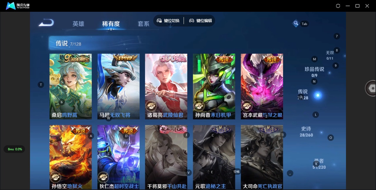 - [12232963]V8 2典藏 2珍品传说 8传说 126英雄 339皮肤 典藏英雄武则天 可修改实名 优质装备:无限飓风号(高达),拾光映像(瑶典藏),江户川柯南,末日机甲-孙尚香(绿蚂蚱),音你心动-小乔,海洋之心,地狱之眼 珍品传说:时之奇旅-孙策 珍宝阁皮:蔷薇恋人,女武神 限定皮:逐霄战戟,鸣野蒿,至尊宝,凤求凰(白切鸡),凤凰于飞,太华(伽罗年限),时之彼端,游园惊梦,梁祝,玄武志(苏烈年限),如梦令-后羿,霸王别姬-项羽,乒乒小将 史诗皮:鸭鸭历险记-刘禅,器灵·浮梦炉,化蝶舞,龙之律动,石田雨龙,怒海争锋,琥珀纪元伽罗,蔬乡物语(鲁班七号),百相守梦-黄忠,紫霞仙子,电玩小子(小书包),黄金分割率,千年之狐,江河有灵,匿光侦查者,雪夜绮愿(周瑜),百解令(蒙犽),高渐离燃音魔法,无限星赏官,冰冠公主,青蛇,偶像歌手,白蛇,猫狗日记-孙策,猫狗日记-大乔,乱世虎臣,摇滚巨星,水果甜心,绅士熊喵,天才门将,星夜王子,心灵骇客,功夫厨神,德古拉伯爵,暗隐猎兽者,幽灵船长,鬼剑武藏,心灵战警,乐园奇幻夜,舞动绿茵,地狱岩魂,纤云弄巧,繁星吟游(呼啦呼啦),拒霜思,缤纷独角兽,乘风破浪,逐浪之夏,月团寄思,水晶猎龙者,曙光守护者,金属风暴,原初追逐者,圣诞狂欢,圣诞恋歌,鹰眼统帅,王者之锤,魅力维加斯,未来纪元-赵云