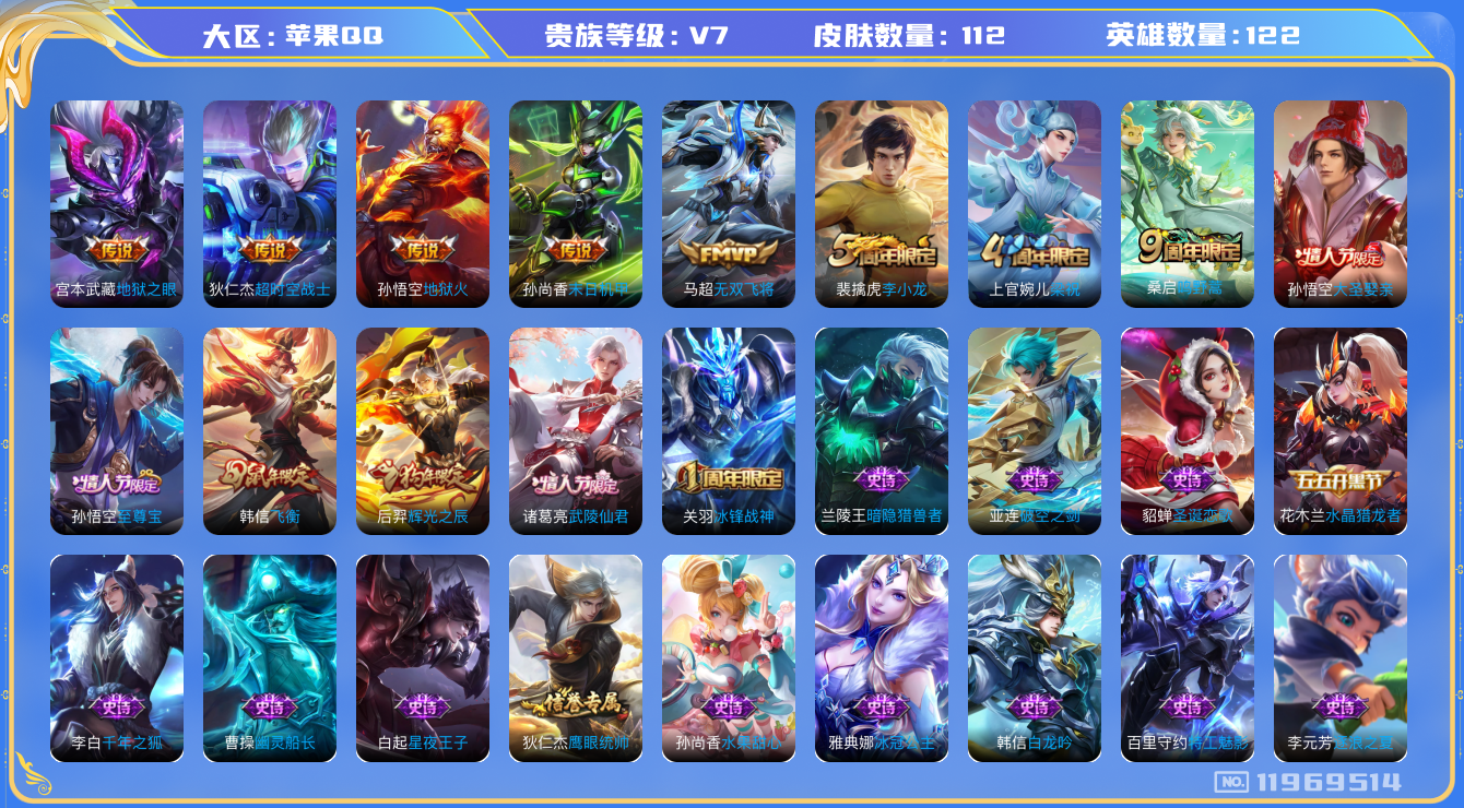[11969514]V7 7传说 122英雄 112皮肤 可修改实名 优质装备:末日机甲-孙尚香(绿蚂蚱),地狱火,地狱之眼,超时空战士-狄仁杰,无双飞将 限定皮:鸣野蒿,至尊宝,武陵仙君(小桃花),飞衡(韩信年限),冰锋战神,梁祝,李小龙,辉光之辰,大圣娶亲 史诗皮:破空之剑,紫霞仙子,电玩小子(小书包),白龙吟,黄金分割率,特工魅影,千年之狐,冰冠公主,末日机甲-吕布,水果甜心,星夜王子,暗隐猎兽者,幽灵船长,逐浪之夏,水晶猎龙者,圣诞狂欢,圣诞恋歌,鹰眼统帅
