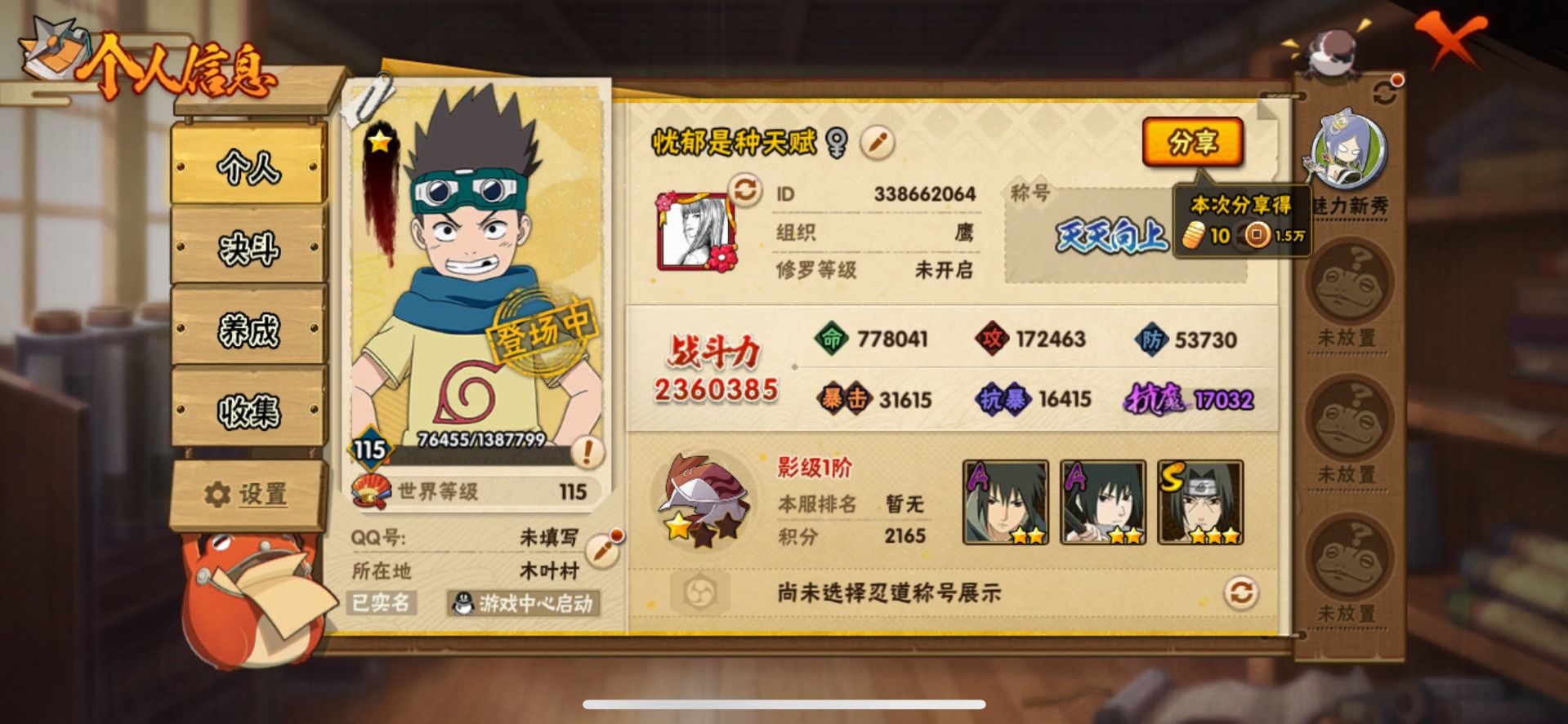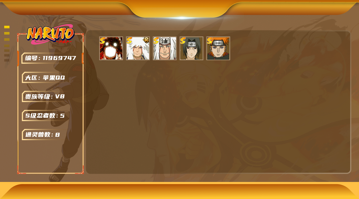 [11969747]V8 5S忍 13A忍 8通灵 236W战力 可二次 可修改实名 优质装备:漩涡鸣人 「暴怒·第六尾」 S级忍者:自来也 「舞之豪杰」,宇智波鼬 「须佐能乎」,佩恩「天道」,自来也