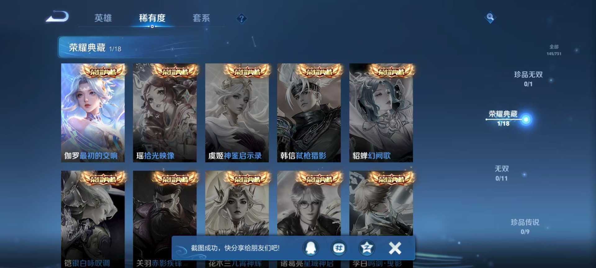 - PX_2096165-49 安卓QQ/荣耀黄金/228皮肤/121英雄/3典藏/0珍品无双/0无双/0珍品传说/7传说/62史诗/7稀有英雄 【3 典藏皮肤】全息碎影 孙悟空,九霄神辉 花木兰,大秦宣太后 芈月, 【7 传说皮肤】启明星使 虞姬,云鹰飞将 曜,仲夏夜之梦 貂蝉,武陵仙君 诸葛亮,炽阳神光 镜,无尽星芒 后羿,绯月行 不知火舞, 【62 史诗皮肤】百解令 蒙犽,银河之约 李元芳,奇遇