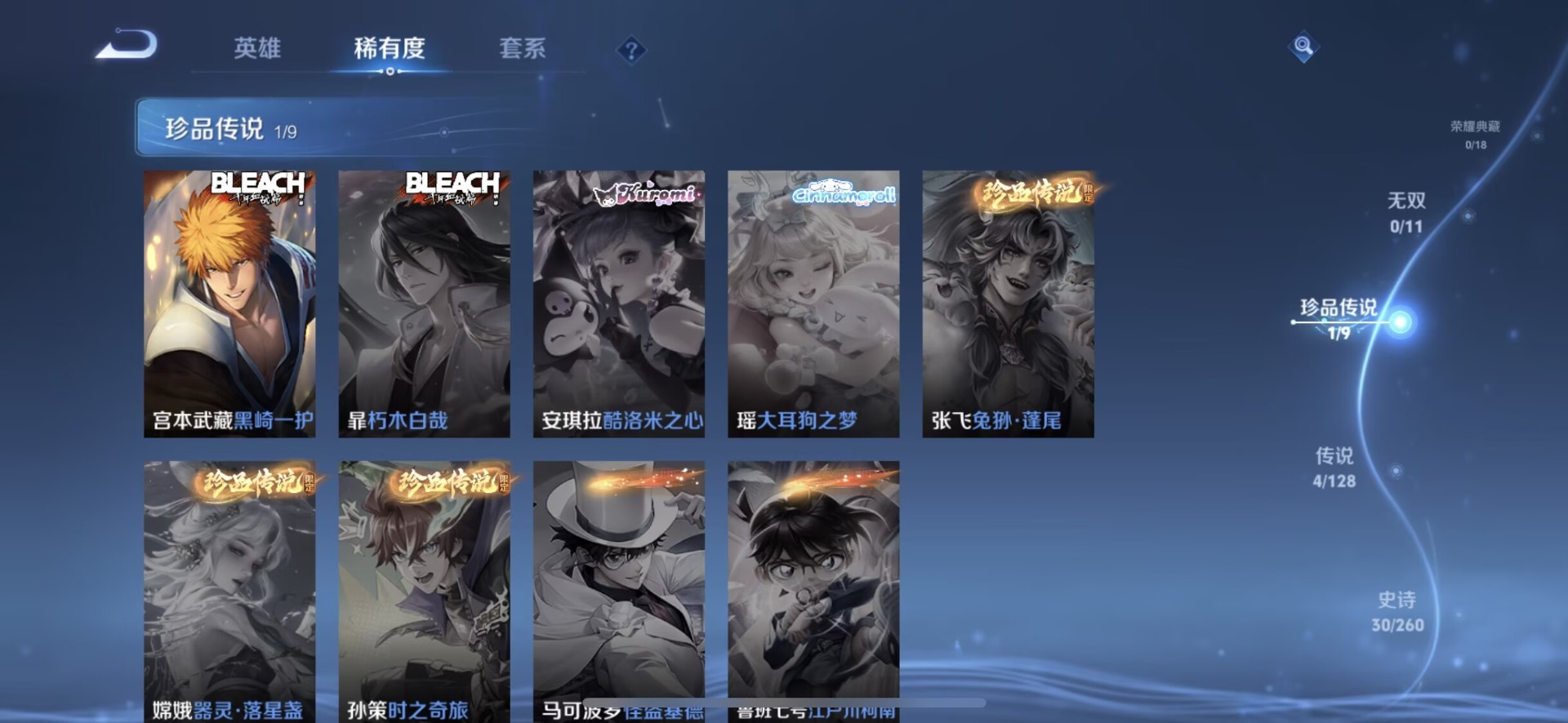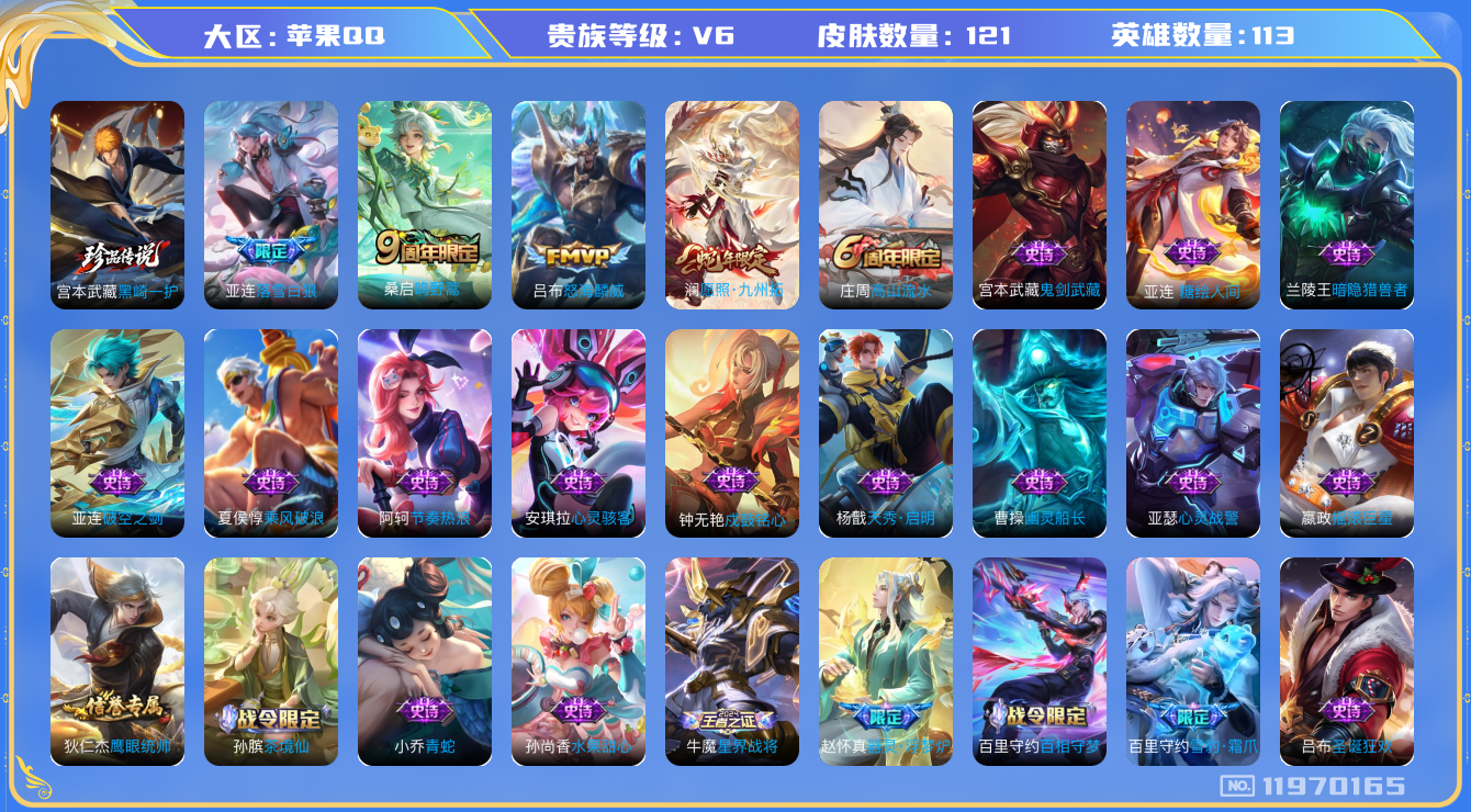 [11970165]V6 1珍品传说 4传说 113英雄 121皮肤 可修改实名 优质装备:黑崎一护 传说皮:落雪白狼 限定皮:愿照·九州拓(澜年限),鸣野蒿,高山流水,怒海麟威 史诗皮:鸭鸭历险记-刘禅,器灵·浮梦炉,糖绘人间,星界战将,龙之律动,雪豹·霜爪,百相守梦-周瑜,戍鼓铭心,茶境仙,破空之剑,百相守梦-百里守约,守夜人,紫霞仙子,青蛇,节奏热浪,摇滚巨星,水果甜心,心灵骇客,暗隐猎兽者,幽灵船长,鬼剑武藏,心灵战警,天秀·启明,乘风破浪,圣诞狂欢,鹰眼统帅,魅力维加斯