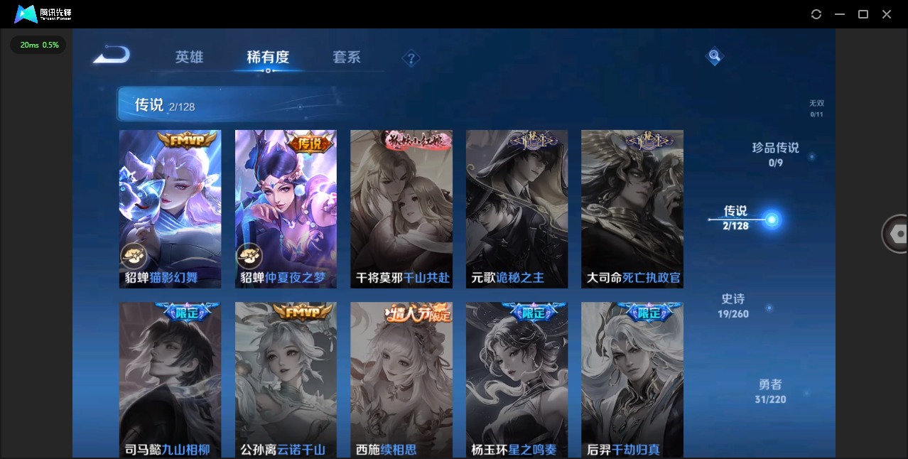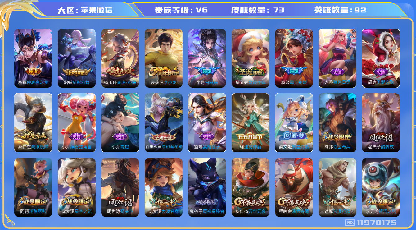 [11970175]V6 2传说 92英雄 73皮肤 可修改实名 永久限制社交场景 优质装备:猫影幻舞,仲夏夜之梦(大飞蛾) 限定皮:白晶晶,李小龙,霸王别姬-虞姬,奇迹圣诞,寅虎·心曲(虎婆) 史诗皮:遇见神鹿,紫霞仙子,青蛇,猫狗日记-大乔,繁星吟游(呼啦呼啦),缤纷独角兽,原初追逐者,圣诞恋歌,鹰眼统帅