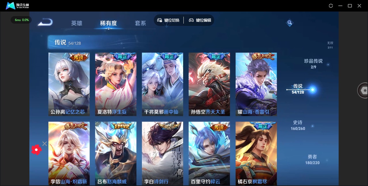- [11523128]V9 2典藏 3珍品传说 21传说 125英雄 343皮肤 可修改实名 荣耀水晶:鸣剑·曳影,全息碎影(猴子典藏) 珍品传说:江户川柯南,怪盗基德,时之奇旅-孙策 传说皮:乘龙·淬吴钩(孙策年限),幻光神枪,玄雷天君,黄金射手座,地狱火,地狱之眼,一念神魔,淬星耀世,久胜战神,云鹰飞将(小将军),飞鸢探春,妄想实况,遇见神鼓 珍宝阁皮:万物之道,蔷薇恋人,玩趣恶龙 限定皮:愿照·山河定(司空震年限),逐霄战戟,陌上桑,鸣野蒿,至尊宝,白虎志(电光耗子),异界灵契(白毛香),傲雪梅枪,时雨天司(水龙头),神威(电光马子),高山流水,怒海麟威,降魔,五谷丰年,祈雪灵祝(雪兔子),天狼绘梦者,李小龙,逐梦之影,大圣娶亲 史诗皮:百相守梦-百里守约,星界战将,茶境仙,器灵·浮梦炉,化蝶舞,灵蛊蚀心,龙之律动,破空之剑,遇见神鹿,紫霞仙子,电玩小子(小书包),白龙吟,黄金分割率,特工魅影,千年之狐,永昼,江河有灵,高渐离燃音魔法,蒙恬荣光圣徽,偶像歌手,青蛇,晚萤,暗夜猫娘,无限星赏官,末日机甲-吕布,猫狗日记-孙策,猫狗日记-大乔,乱世虎臣,节奏热浪,修罗,女仆咖啡,摇滚巨星,水果甜心,绅士熊喵,天才门将,星夜王子,心灵骇客,功夫厨神,德古拉伯爵,暗隐猎兽者,幽灵船长,鬼剑武藏,心灵战警,乐园奇幻夜,天秀·启明,舞动绿茵,地狱岩魂,纤云弄巧,拒霜思,缤纷独角兽,乘风破浪,逐浪之夏,月团寄思,水晶猎龙者,曙光守护者,金属风暴,原初追逐者,圣诞狂欢,圣诞恋歌,鹰眼统帅,魅力维加斯,黎明之约,赏金猎手,无心,未来纪元-赵云