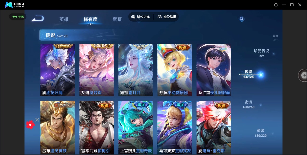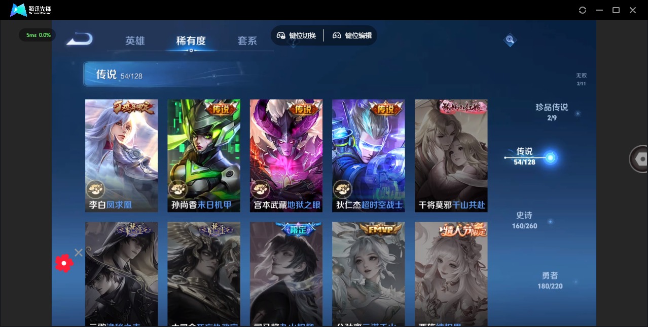 - [11742013]V5 1典藏 1珍品传说 2传说 122英雄 109皮肤 可修改实名 优质装备:鸣剑·曳影,末日机甲-孙尚香(绿蚂蚱),涂山容容 珍品传说:时之奇旅-孙策 珍宝阁皮:玩趣恶龙 限定皮:鸣野蒿,五谷丰年,梁祝,龙胆,岱宗(典韦年限) 史诗皮:电玩小子(小书包),特工魅影,江河有灵,雪夜绮愿(周瑜),蒙恬荣光圣徽,冰冠公主,电玩·爆裂旋风,末日机甲-吕布,节奏热浪,女仆咖啡,摇滚巨星,水果甜心,功夫厨神,暗隐猎兽者,舞动绿茵,缤纷独角兽,逐浪之夏,金属风暴,圣诞狂欢,圣诞恋歌,鹰眼统帅,暗夜贵公子,无心,未来纪元-赵云