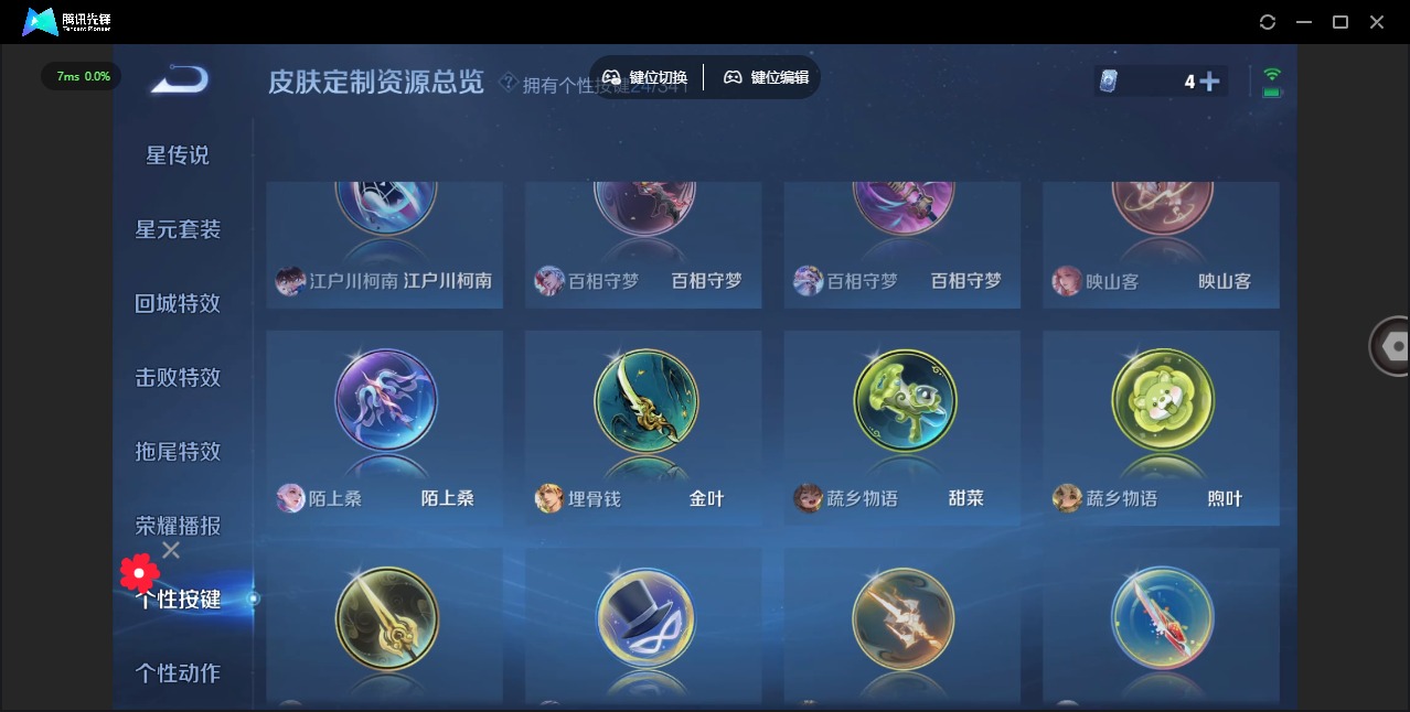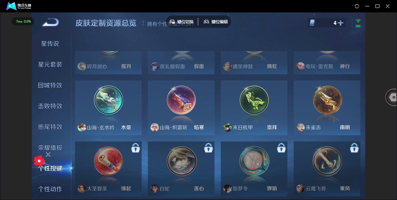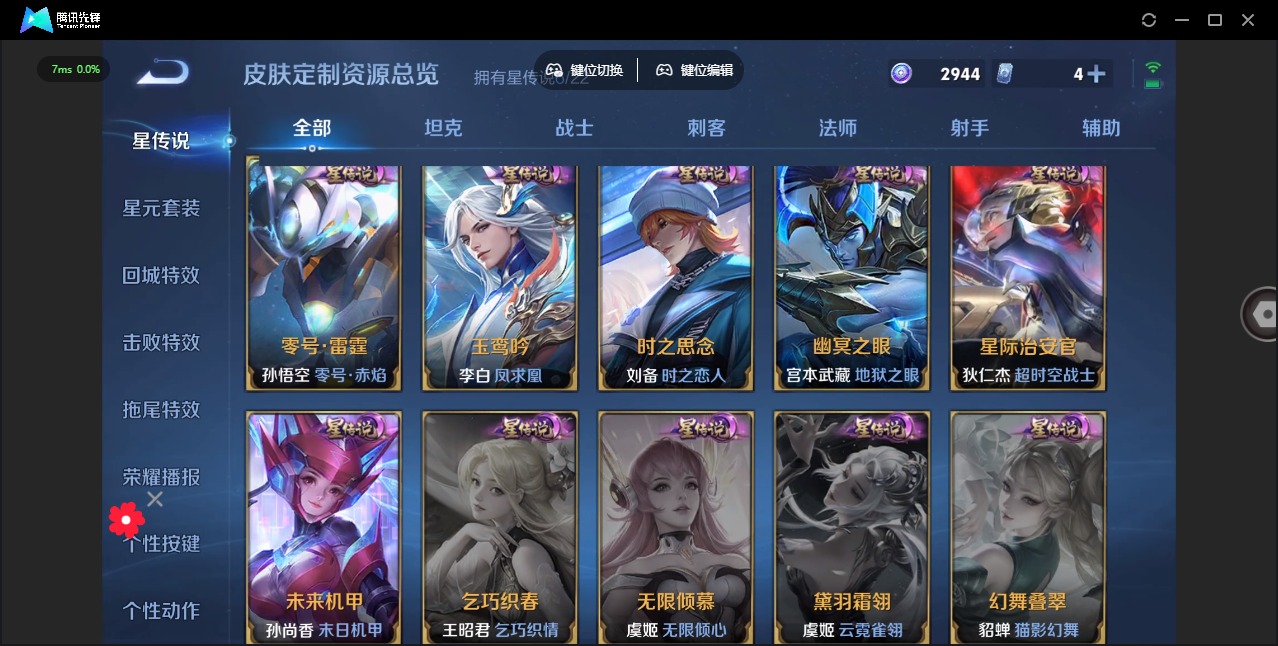 夏侯惇霜北刀,黄忠烈魂,铠青龙志,苏烈玄武志,赵云龙胆,鲁班七号乒乒小将,后羿无尽星芒,吕布御风骁将,后羿如梦令,诸葛亮时雨天司,兰陵王默契交锋,公孙离玉兔公主,司空震愿照·山河定,裴擒虎李小龙,上官婉儿梁祝,花木兰默契交锋,李白诗剑行,安琪拉魔法小厨娘,马可波罗山海·玄木吟,艾琳陌上桑,马可波罗深海之息,桑启鸣野蒿,猪八戒猪悟能,孙悟空孙行者,孙悟空大圣娶亲,孙悟空至尊宝,芈月白晶晶,马超神威,盘古冰霜神祇,云中君时之祈愿,韩信飞衡,韩信逐梦之影,百里守约朱雀志,澜愿照·九州拓,虞姬霸王别姬,虞姬愿照·岁时盈,娜可露露前尘镜,王昭君凤凰于飞,王昭君映山客,橘右京枫霜尽