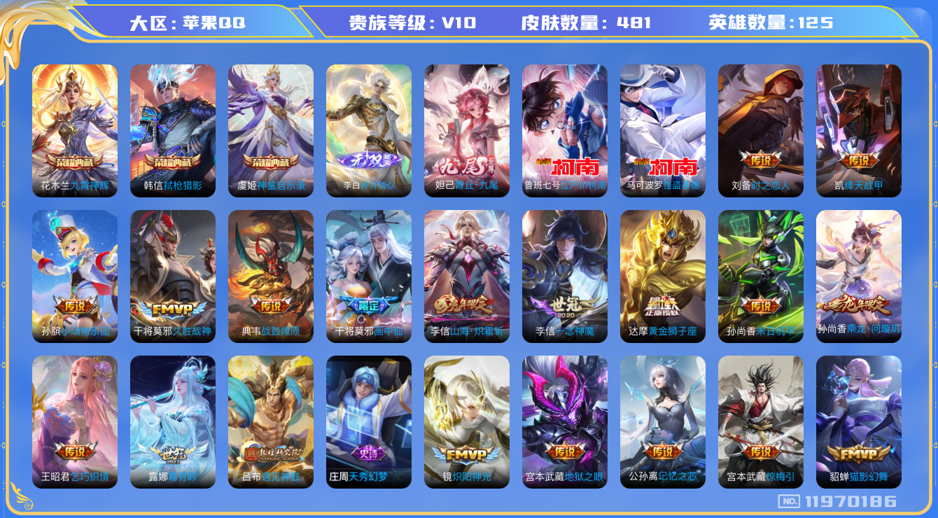 [11970186]V10 3典藏 2无双 2珍品传说 54传说 125英雄 481皮肤 可修改实名 百里守约小国标 黄忠小国标 狄仁杰小国标 苍小国标 虞姬小国标 戈娅小国标 莱西奥小国标 钟馗小国标 优装备:九霄神辉(木兰典藏),弑枪猎影(韩信典藏),青丘·九尾(妲己无双),碎月剑心(李白无双),神鉴启示录,江户川柯南,怪盗基德,黄金狮子座,云鹰飞将(小将军),绛天战甲(鸡嘴战神),黄金白羊座,猫影幻舞,久胜战神,炽阳神光,一念神魔,云霓雀翎,末日机甲-孙尚香(绿蚂蚱),零号·赤焰,地狱之眼,胖达荣荣,乞巧织情,时之恋人-刘备(电焊工),超时空战士-狄仁杰,无双飞将,碎云,天秀幻梦,山海·炽霜斩(李信年限),山海·苍雷引(电光曜子),画中仙,浮生妄,记忆之芯(机甲兔),青丘·九尾,电玩·雷克斯,妄想实况,妄想奇谈,惊梅引,遇见神鼓,夜礼服假面,小动物乐团,霜月吟,澜逐花归海,艾琳觅芳踪,黄金天蝎座,涂山容容 传说皮:乘龙·问璇玑(孙尚香年限),典韦战鼓燎原,幻光神枪 珍宝阁皮:妄想食味,优雅恋人,女武神 限定皮:愿照·九州拓(澜年限),愿照·岁时盈(虞姬年限),愿照·山河定(司空震年限),逐霄战戟,映山客,陌上桑,鸣野蒿,夏侯惇霜北刀,至尊宝,凤求凰(白切鸡),凤凰于飞,前尘镜,魔法小厨娘,白晶晶,时雨天司(水龙头),神威(电光马子),飞衡(韩信年限),高山流水,诗剑行,齐天大圣,怒海麟威,五谷丰年,青龙志(铠年限),游园惊梦,梁祝,御风骁将(吕布年限),龙胆,烈魂,李小龙,逐梦之影,玄武志(苏烈年限),朱雀志(守约年限),如梦令-后羿,霸王别姬-虞姬,默契交锋-兰陵王,默契交锋-花木兰,孙行者,猪悟能,大圣娶亲,乒乒小将,戈雅时之祈愿-云中君,玉兔公主,无尽星芒,深海之息(深海大菠萝),枫霜尽,山海·玄木吟(马可年限),冰霜神祇 史诗皮:鸭鸭历险记-刘禅,器灵·浮梦炉,狼魂孤将,化蝶舞,灵蛊蚀心,星界战将,龙之律动,雪豹·霜爪,石田雨龙,怒海争锋,破空之剑,战舞者,东方月初,蒙犽顽岩魄,埋骨钱,海诺心动手记,琥珀纪元伽罗,蔬乡物语(鲁班七号),超元猎域,百相守梦-百里守约,星界特工,百相守梦-黄忠,遇见神鹿,紫霞仙子,苍穹之光,电玩小子(小书包),黄金分割率,特工魅影,千年之狐,永昼,江河有灵,匿光侦查者,末日机甲-莱西奥,鹤归松栖(赵怀真