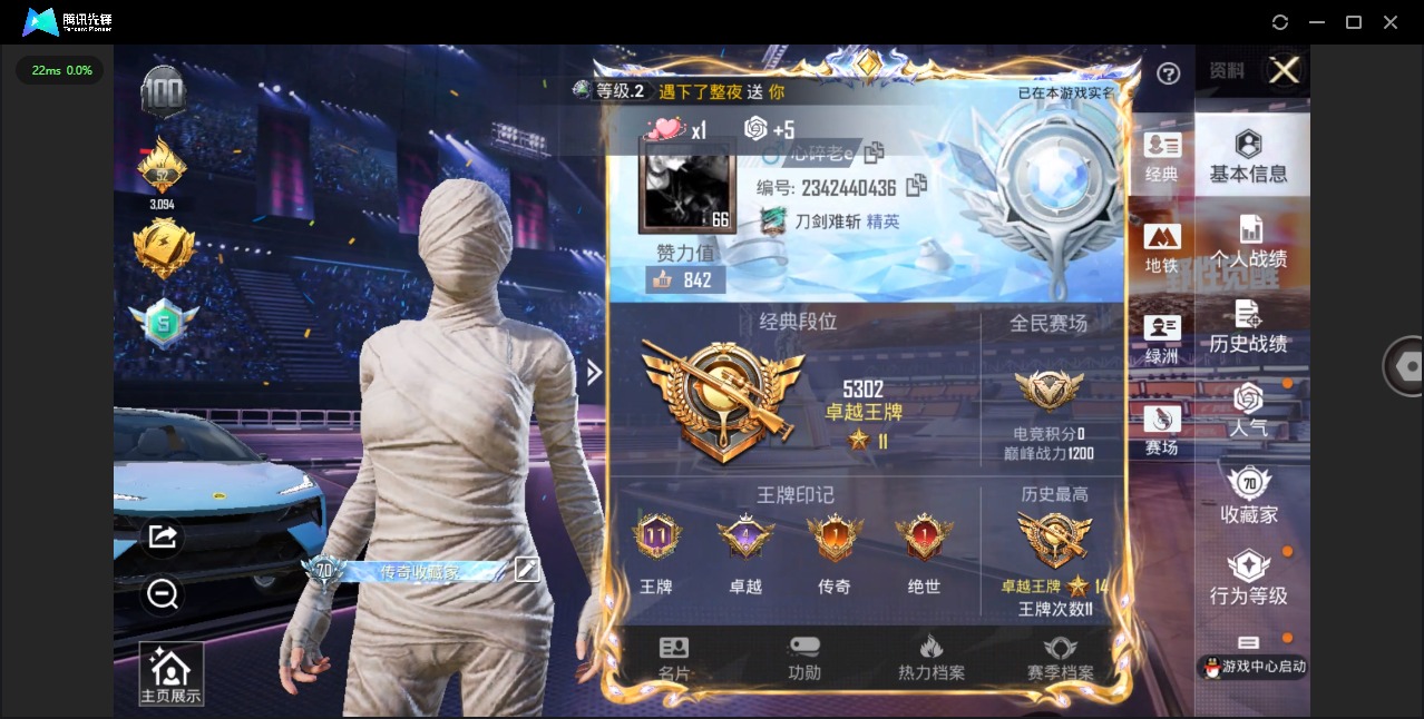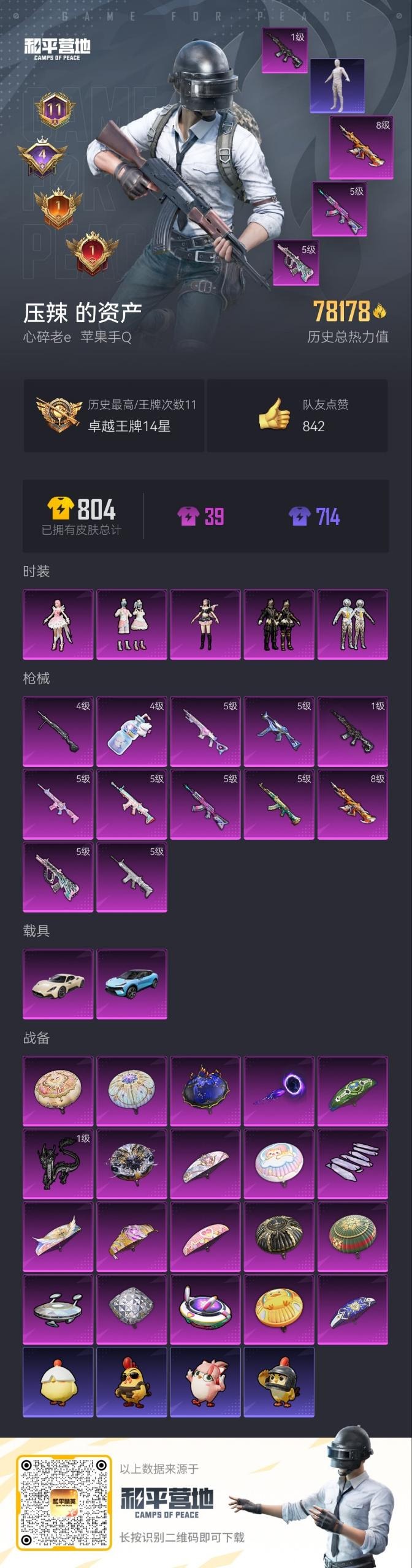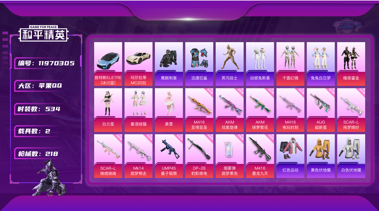 [11970305]实名: 可修改 时装数: 534 载具数: 2 枪械数: 218 战备数: 2 热门装扮: 迅捷狂鲨,鹰眼刺客,冥河战士,千面幻镜,动感兔斯基,兔兔白日梦,暗夜鎏金,白兰星,蜜语绒猫,美雪 载具: 路特斯ELETRE(冰川蓝),玛莎拉蒂MC20(星石白) 稀有枪皮: AKM炫紫旋律,M416至情至圣,SCAR-L纯梦嫁纱,AUG超新星,AKM绿萝繁花,SCAR-L-锦绣绵绵,M416电玩时刻,M416墨龙九天,UMP45量子极限,MK14-甜梦熊击,烟雾弹-甜梦果泡,DP-28-豹影疾电