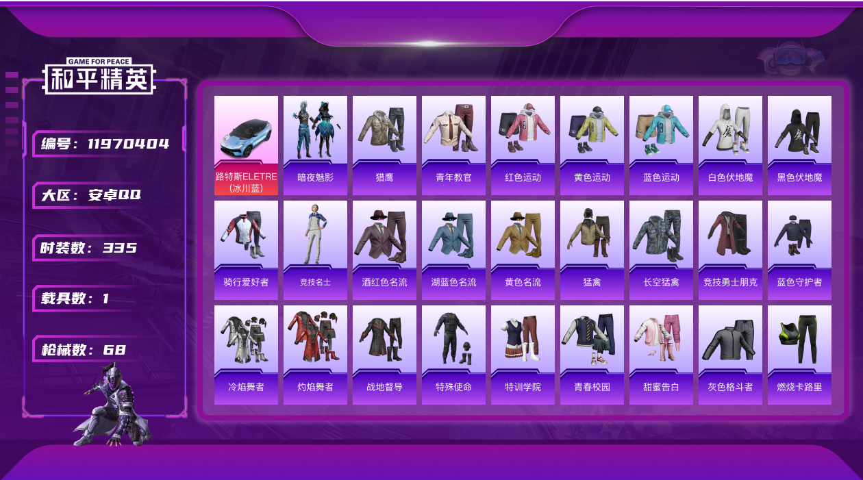 [11970404]1载具 4印记 可二次 可修改实名 优质装备:路特斯ELETRE(冰川蓝) 热门装扮:暗夜魅影 紫色装扮:SS22特训,娇憨猪猪,萌趣咩咩,SS21特训,人气偶像,冰川特警,冷焰舞者,北国孤狼,SS20特训,SS15特训,SS16特训,SS14特训,萌趣颜团子,特种颜团子,猎梦纪元,飞驰魅影,音速流光,极速竞梦,SS19特训,军刀雅典娜,吉莉礼服,甜心亚梦,虚音幻奏,瑞龙福将,团圆交子,醒狮腾龙,SS17特训,SS18特训,都市漫游者,都市魅力,酒红色名流,长空猛禽,霓虹街区,青年教官,青春校园,蓝彩潮人,蓝色守护者,蓝色运动,虎虎生威吉莉,街头潮人,跃动心情,骑行爱好者,魅力单车,鹤鸣,麻辣教官,黄色名流,黄色运动,黑色伏地魔,极地朋克,极速红龙,格斗先锋,深蓝色名流,幻影武者,夏日音浪,完美偶像,帅气教官,幻世战舞者,战地督导,探宝勇士,湖蓝色名流,绮丽涂鸦,白熊同盟,白色伏地魔,破晓战魂,破蛋小黄鸡,甜蜜告白,福星高照,竞技勇士朋克,竞技达人朋克,红色运动,牛气冲天,灰色格斗者,灼焰舞者,炫蓝之夏,燃烧卡路里,牛气满满,猛禽,特殊使命,特训学院,猎鹰,玉兔迎春,竞技名士,耀粉歌者,萌黄之夏,海上生明月 优质战备:垂柳戏鸭降落伞,夏日绵绵冰降落伞,暗夜玫瑰降落伞