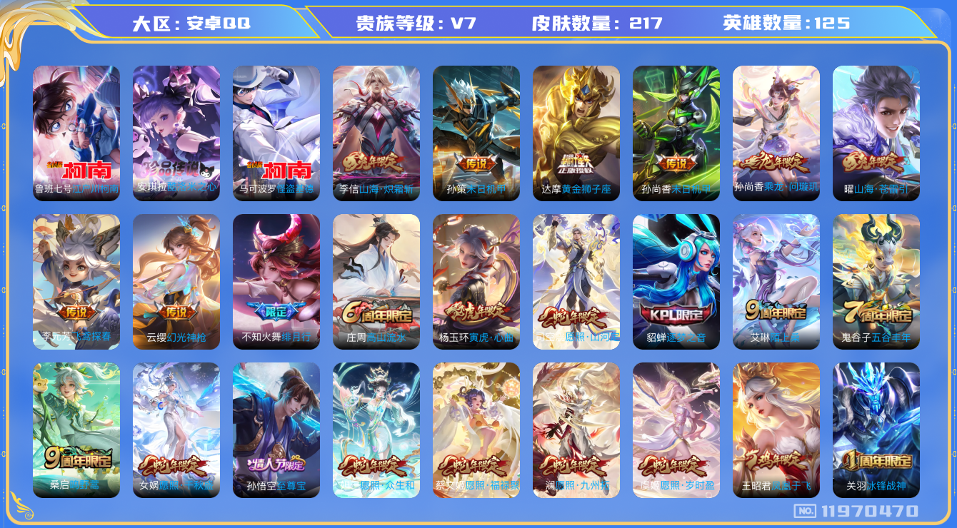[11970470]V7 3珍品传说 16传说 125英雄 217皮肤 可修改实名 优质装备:江户川柯南,怪盗基德,酷洛米之心,黄金狮子座,末日机甲-孙尚香(绿蚂蚱),飞鸢探春,末日机甲-孙策,山海·炽霜斩(李信年限),山海·苍雷引(电光曜子),涂山容容 传说皮:乘龙·问璇玑(孙尚香年限),幻光神枪 珍宝阁皮:万物之道,蔷薇恋人 限定皮:愿照·九州拓(澜年限),愿照·福禄聚(蔡文姬年限),愿照·岁时盈(虞姬年限),愿照·山河定(司空震年限),愿照·众生和(妲己年限),愿照·千秋盛(女娲年限),陌上桑,鸣野蒿,至尊宝,凤凰于飞,绯月行,高山流水,五谷丰年,冰锋战神,逐梦之音,寅虎·心曲(虎婆) 史诗皮:器灵·浮梦炉,化蝶舞,谪仙醉月,龙之律动,藏狐·褐绒,破空之剑,涂山红红,东方月初,百相守梦-黄忠,遇见神鹿,紫霞仙子,白龙吟,特工魅影,江河有灵,百解令(蒙犽),冰冠公主,白蛇,电玩·爆裂旋风,龙骑士(小龙虾),末日机甲-吕布,猫狗日记-孙策,乱世虎臣,节奏热浪,女仆咖啡,水果甜心,星夜王子,心灵骇客,功夫厨神,德古拉伯爵,幽灵船长,鬼剑武藏,心灵战警,地狱岩魂,拒霜思,乘风破浪,逐浪之夏,曙光守护者,金属风暴,鹰眼统帅,暗夜贵公子,魅力维加斯,无心