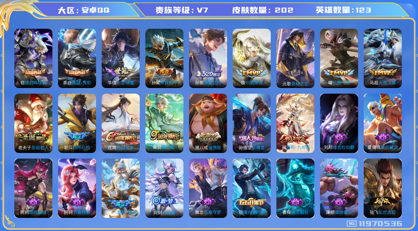 [11970536]V7 2典藏 9传说 123英雄 202皮肤 可修改实名 优质装备:鸣剑·曳影,银白咏叹调(倪克斯侍卫),云鹰飞将(小将军),炽阳神光,一念神魔,末日机甲-孙策,挚爱之约,无双飞将,诡秘之主,涂山容容 珍宝阁皮:妄想食味,玩趣恶龙 限定皮:愿照·九州拓(澜年限),鸣野蒿,至尊宝,高山流水,圣诞老人,猪悟能,百木心枪 史诗皮:赞萌露比,糖绘人间,化蝶舞,灵蛊蚀心,星界战将,谪仙醉月,龙之律动,藏狐·褐绒,百相守梦-周瑜,茶境仙,撼地雄心,破空之剑,战舞者,百相守梦-黄忠,黄金分割率,千年之狐,永昼,冰冠公主,偶像歌手,暗夜猫娘,猫狗日记-孙策,乱世虎臣,节奏热浪,修罗,功夫厨神,德古拉伯爵,幽灵船长,鬼剑武藏,心灵战警,乘风破浪,水晶猎龙者,曙光守护者,原初追逐者,圣诞狂欢,鹰眼统帅,魅力维加斯,黎明之约,赏金猎手,无心,未来纪元-赵云