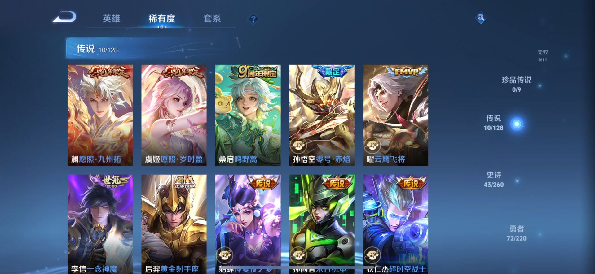 - [12296360]V7 12传说 124英雄 169皮肤 可修改实名 优质装备:云鹰飞将(小将军),一念神魔,末日机甲-孙尚香(绿蚂蚱),地狱之眼,无双飞将,惊梅引 传说皮:乘龙·铭钟鼎(赵云年限) 珍宝阁皮:蔷薇恋人 限定皮:愿照·岁时盈(虞姬年限),神威(电光马子),高山流水,齐天大圣,怒海麟威,五谷丰年,青龙志(铠年限),梁祝,李小龙,孙行者,寅虎·赤拳(老虎年限),深海之息(深海大菠萝) 史诗皮:石田雨龙,琥珀纪元伽罗,紫霞仙子,白龙吟,特工魅影,永昼,江河有灵,鹤归松栖(赵怀真),高渐离燃音魔法,蒙恬荣光圣徽,偶像歌手,白蛇,节奏热浪,修罗,水果甜心,星夜王子,暗隐猎兽者,鬼剑武藏,地狱岩魂,纤云弄巧,逐浪之夏,水晶猎龙者,金属风暴,原初追逐者,圣诞狂欢,圣诞恋歌,鹰眼统帅,魅力维加斯,黎明之约,赏金猎手,无心,未来纪元-赵云
