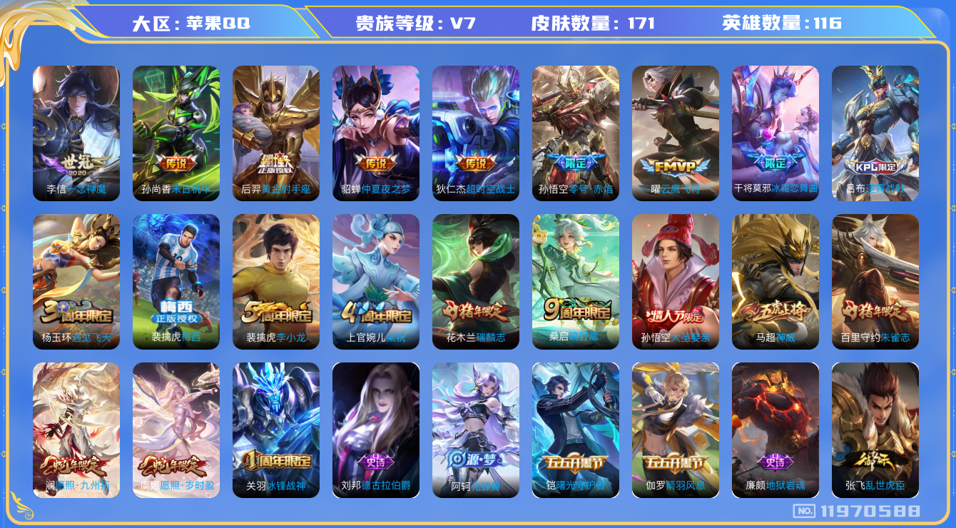 [11970588]V7 10传说 116英雄 171皮肤 可修改实名 优质装备:黄金射手座,云鹰飞将(小将军),一念神魔,末日机甲-孙尚香(绿蚂蚱),仲夏夜之梦(大飞蛾),零号·赤焰,超时空战士-狄仁杰,涂山容容 限定皮:愿照·九州拓(澜年限),愿照·岁时盈(虞姬年限),逐霄战戟,鸣野蒿,梅西,神威(电光马子),瑞麟志(木兰年限),遇见飞天,冰锋战神,梁祝,李小龙,朱雀志(守约年限),大圣娶亲,冰霜恋舞曲 史诗皮:化蝶舞,紫霞仙子,白龙吟,黄金分割率,特工魅影,千年之狐,无限星赏官,偶像歌手,末日机甲-吕布,猫狗日记-孙策,乱世虎臣,修罗,水果甜心,天才门将,德古拉伯爵,鬼剑武藏,舞动绿茵,地狱岩魂,曙光守护者,箭羽风息,圣诞狂欢,圣诞恋歌,鹰眼统帅