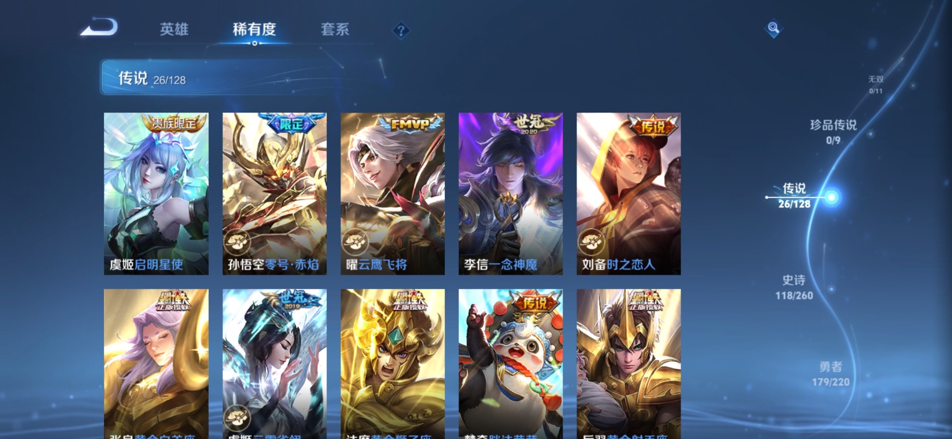 - PX_2110002-Q/至尊星耀/283皮肤/125英雄/1典藏/0珍品无双/0无双/1珍品传说/18传说/80史诗/9稀有英雄 【1 珍品传说】黑崎一护 宫本武藏, 【1 典藏皮肤】杀手不太冷 孙尚香, 【18 传说皮肤】启明星使 虞姬,云鹰飞将 曜,凤求凰 李白,猫影幻舞 貂蝉,祈雪灵祝 公孙离,默契交锋 兰陵王,音你心动 周瑜,时之恋人 刘备,黄金狮子座 达摩,乘龙·淬吴钩 孙策,一念神魔