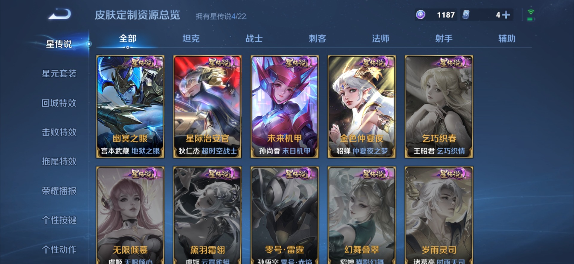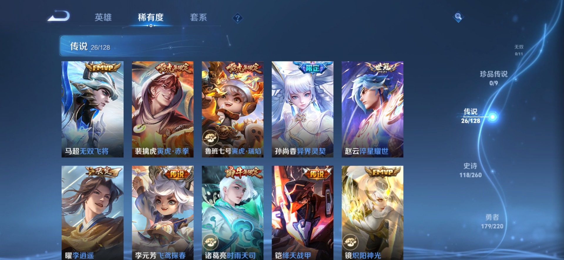 黄忠烈魂,甄姬女儿国国王,铠青龙志,廉颇寅虎·御盾,赵云百木心枪,赵云龙胆,孙膑天狼运算者,孙膑寅虎·展翼,干将莫邪冰霜恋舞曲,孙尚香异界灵契,鲁班七号寅虎·瑞焰,后羿如梦令,镜匿光追影者,诸葛亮时雨天司,杨玉环寅虎·心曲,公孙离玉兔公主,公孙离蜜橘之夏,裴擒虎李小龙,裴擒虎寅虎·赤拳,东皇太一逐梦之光,上官婉儿梁祝,花木兰瑞麟志,花木兰青春决赛季,马可波罗山海·玄木吟,猪八戒猪悟能,孙悟空孙行者,孙悟空大圣娶亲,孙悟空至尊宝,马超神威,韩信傲雪梅枪,虞姬霸王别姬,关羽冰锋战神
