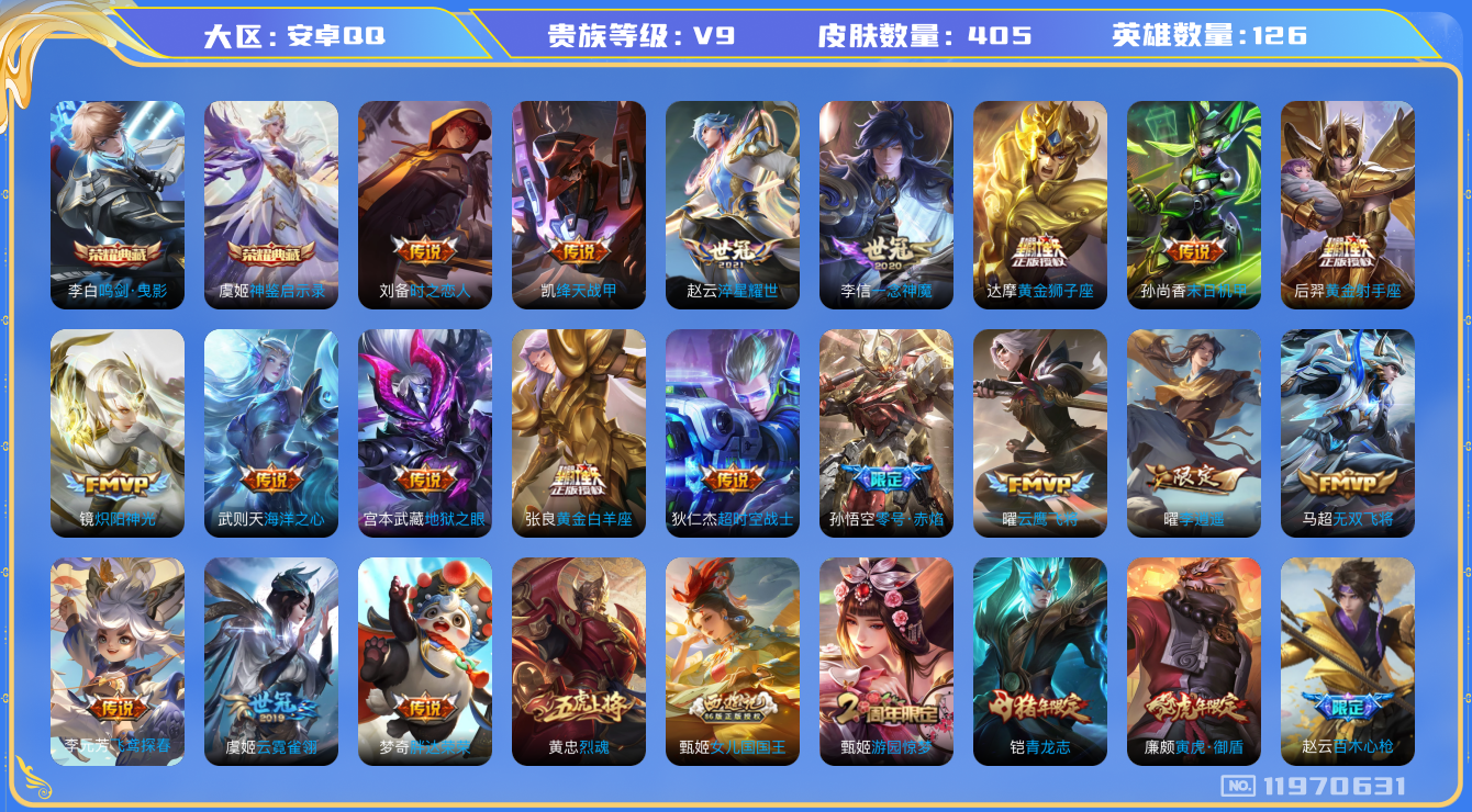 [11970631]V9 2典藏 26传说 126英雄 405皮肤 典藏英雄武则天 可修改实名 优质装备:鸣剑·曳影,神鉴启示录,黄金狮子座,黄金射手座,云鹰飞将(小将军),绛天战甲(鸡嘴战神),黄金白羊座,炽阳神光,一念神魔,云霓雀翎,末日机甲-孙尚香(绿蚂蚱),零号·赤焰,海洋之心,地狱之眼,飞鸢探春,胖达荣荣,李逍遥,时之恋人-刘备(电焊工),淬星耀世,超时空战士-狄仁杰,无双飞将 珍宝阁皮:万物之道,优雅恋人,女武神 限定皮:至尊宝,凤求凰(白切鸡),武陵仙君(小桃花),异界灵契(白毛香),傲雪梅枪,寅虎·展翼(孙膑年限),时雨天司(水龙头),神威(电光马子),瑞麟志(木兰年限),遇见飞天,高山流水,五谷丰年,青龙志(铠年限),冰锋战神,天狼运算者,游园惊梦,梁祝,龙胆,烈魂,李小龙,逐梦之光,如梦令-后羿,霸王别姬-虞姬,孙行者,猪悟能,大圣娶亲,青春决赛季,冰霜恋舞曲,蜜橘之夏,匿光追影者,女儿国国王,寅虎·御盾(廉颇年限),寅虎·瑞焰(虎皮蛋子),寅虎·心曲(虎婆),寅虎·赤拳(老虎年限),百木心枪,玉兔公主,山海·玄木吟(马可年限) 史诗皮:鸭鸭历险记-刘禅,化蝶舞,灵蛊蚀心,星界战将,龙之律动,石田雨龙,茶境仙,百相守梦-黄忠,紫霞仙子,苍穹之光,白龙吟,黄金分割率,特工魅影,千年之狐,魅语,百解令(蒙犽),蒙恬荣光圣徽,冰冠公主,偶像歌手,晚萤,暗夜猫娘,龙骑士(小龙虾),末日机甲-吕布,猫狗日记-孙策,猫狗日记-大乔,乱世虎臣,节奏热浪,修罗,女仆咖啡,摇滚巨星,水果甜心,绅士熊喵,天才门将,星夜王子,心灵骇客,时之奇旅-安琪拉,功夫厨神,德古拉伯爵,暗隐猎兽者,幽灵船长,鬼剑武藏,暗渊魔法,心灵战警,乐园奇幻夜,舞动绿茵,地狱岩魂,纤云弄巧,繁星吟游(呼啦呼啦),拒霜思,缤纷独角兽,乘风破浪,逐浪之夏,水晶猎龙者,曙光守护者,箭羽风息,金属风暴,原初追逐者,圣诞狂欢,圣诞恋歌,鹰眼统帅,王者之锤,暗夜贵公子,魅力维加斯,黎明之约,赏金猎手,寅虎·御盾,无心,未来纪元-赵云