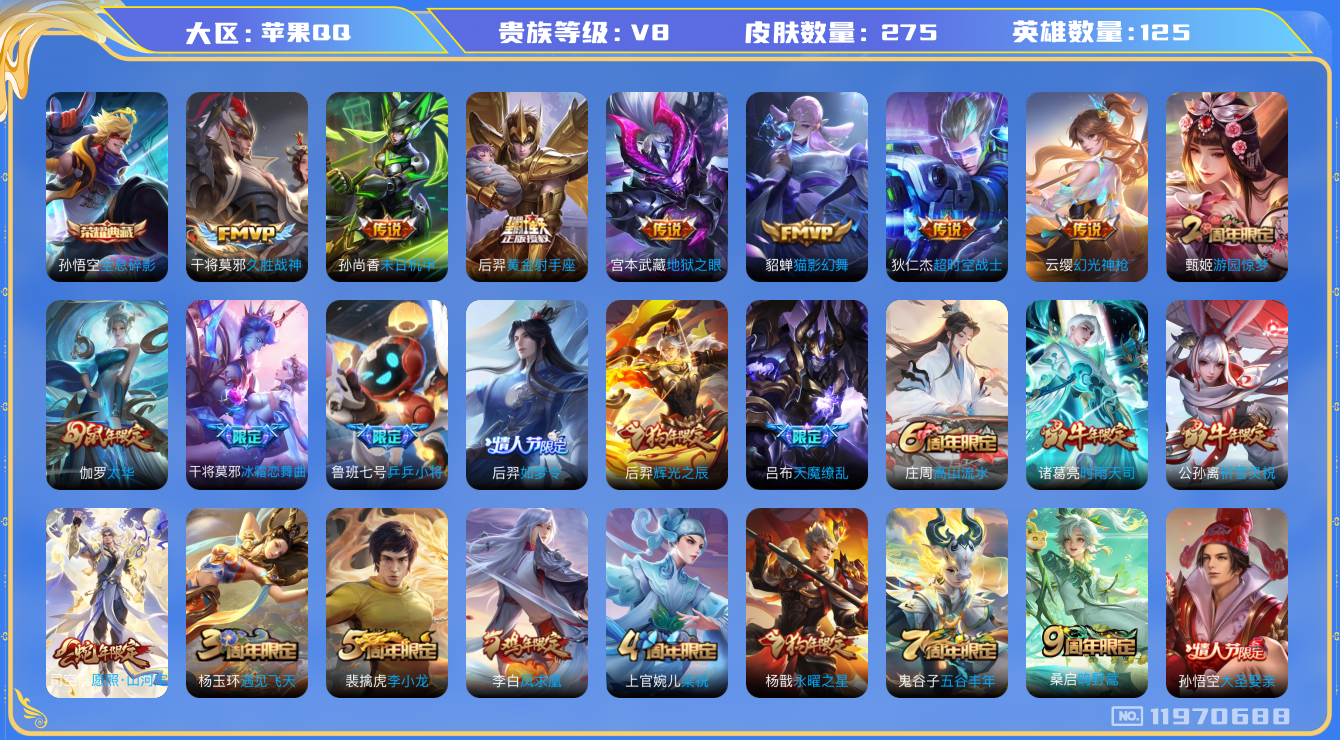 [11970688]V8 1典藏 17传说 125英雄 275皮肤 可修改实名 女号 优质装备:全息碎影(猴子典藏),黄金射手座,猫影幻舞,久胜战神,末日机甲-孙尚香(绿蚂蚱),地狱之眼,超时空战士-狄仁杰,涂山容容 传说皮:幻光神枪 珍宝阁皮:蔷薇恋人 限定皮:愿照·山河定(司空震年限),鸣野蒿,至尊宝,白虎志(电光耗子),凤求凰(白切鸡),太华(伽罗年限),时雨天司(水龙头),神威(电光马子),飞衡(韩信年限),遇见飞天,高山流水,五谷丰年,冰锋战神,游园惊梦,梁祝,祈雪灵祝(雪兔子),李小龙,逐梦之影,朱雀志(守约年限),永曜之星,辉光之辰,如梦令-嫦娥,如梦令-后羿,大圣娶亲,天魔缭乱,冰霜恋舞曲,乒乒小将 史诗皮:化蝶舞,雪豹·霜爪,百相守梦-黄忠,紫霞仙子,苍穹之光,白龙吟,黄金分割率,特工魅影,千年之狐,江河有灵,魅语,百解令(蒙犽),无限星赏官,冰冠公主,偶像歌手,末日机甲-吕布,乱世虎臣,节奏热浪,修罗,女仆咖啡,水果甜心,星夜王子,心灵骇客,功夫厨神,德古拉伯爵,幽灵船长,鬼剑武藏,舞动绿茵,地狱岩魂,诗语江南,繁星吟游(呼啦呼啦),拒霜思,缤纷独角兽,乘风破浪,逐浪之夏,月团寄思,水晶猎龙者,曙光守护者,金属风暴,原初追逐者,圣诞狂欢,圣诞恋歌,鹰眼统帅,黎明之约,未来纪元-赵云