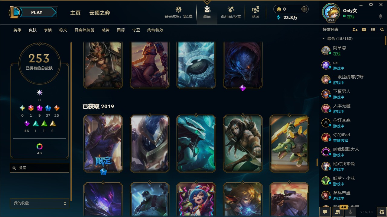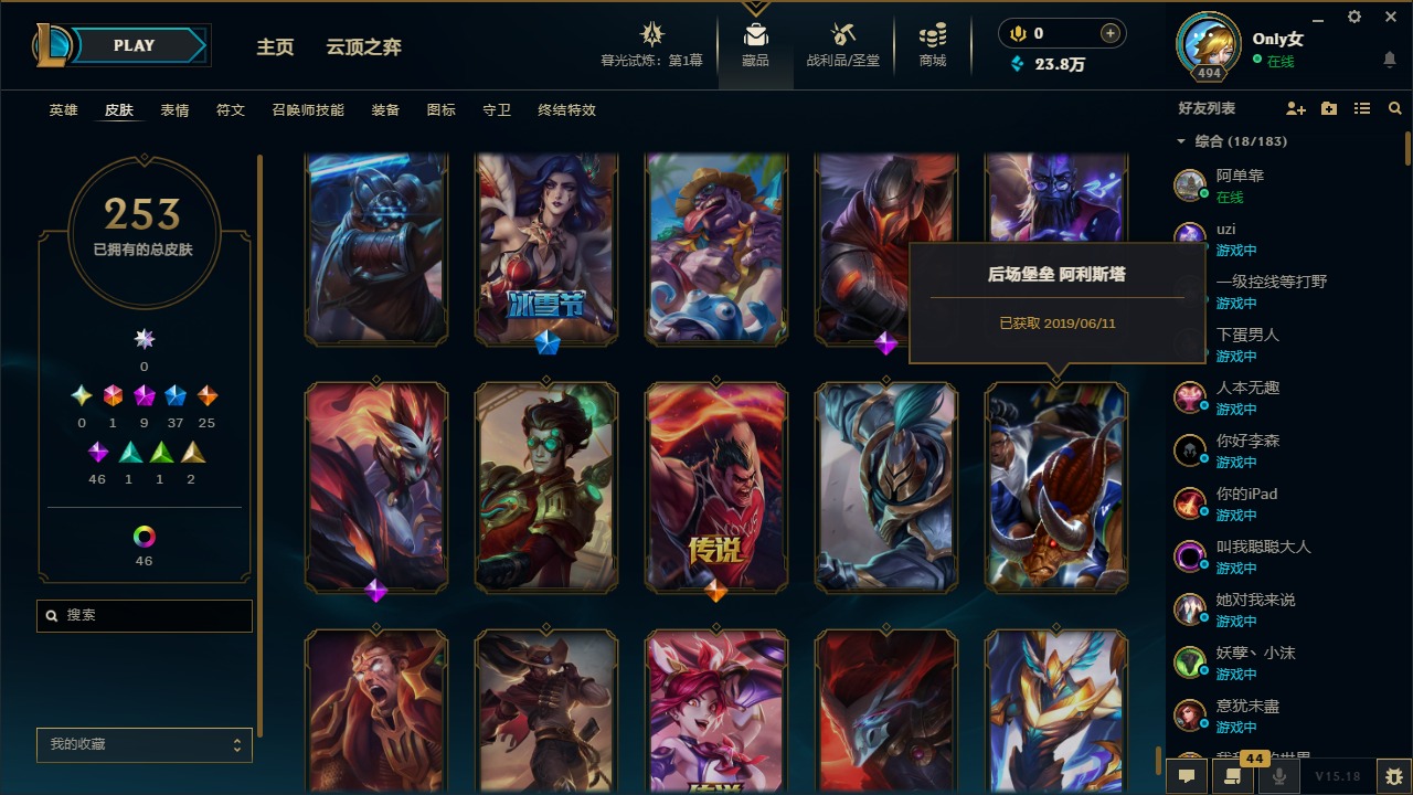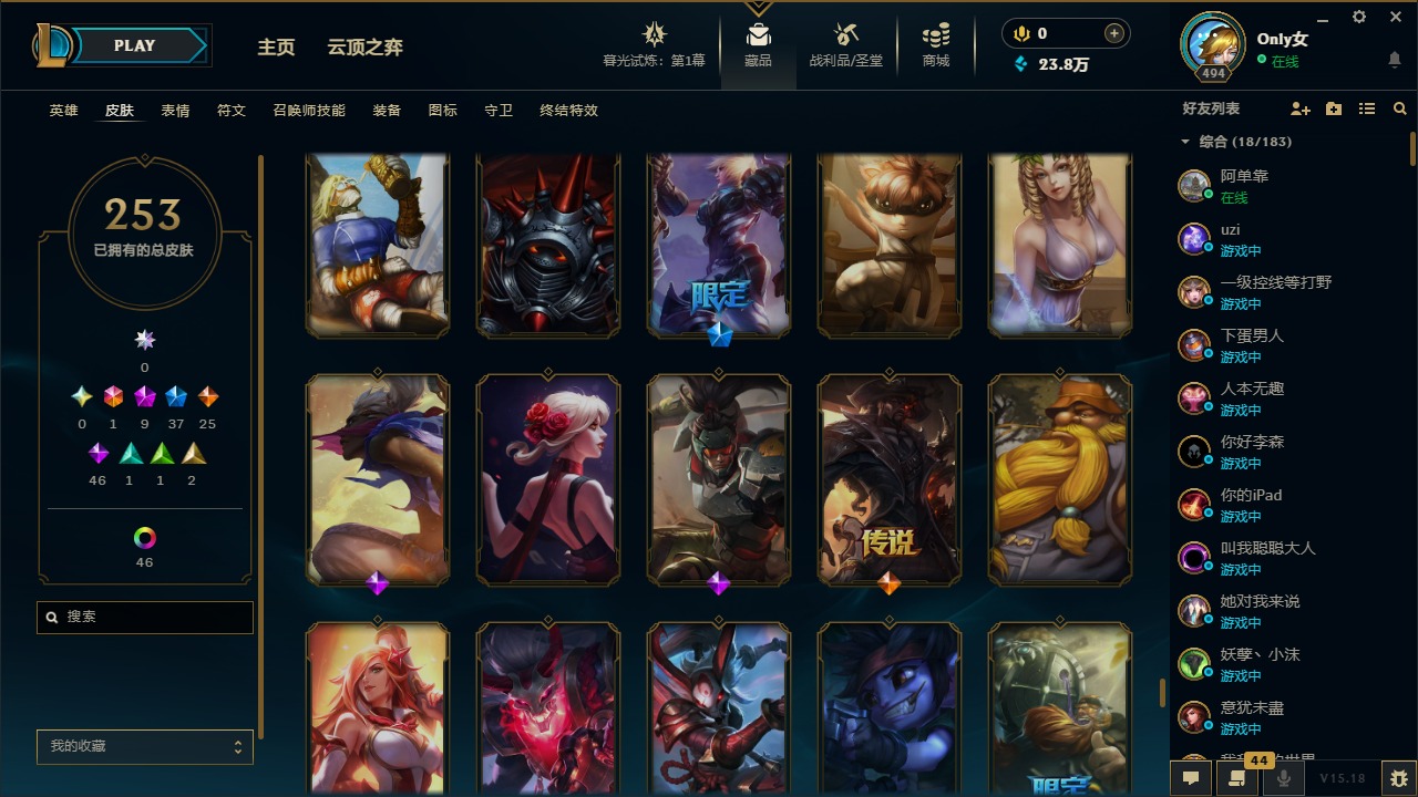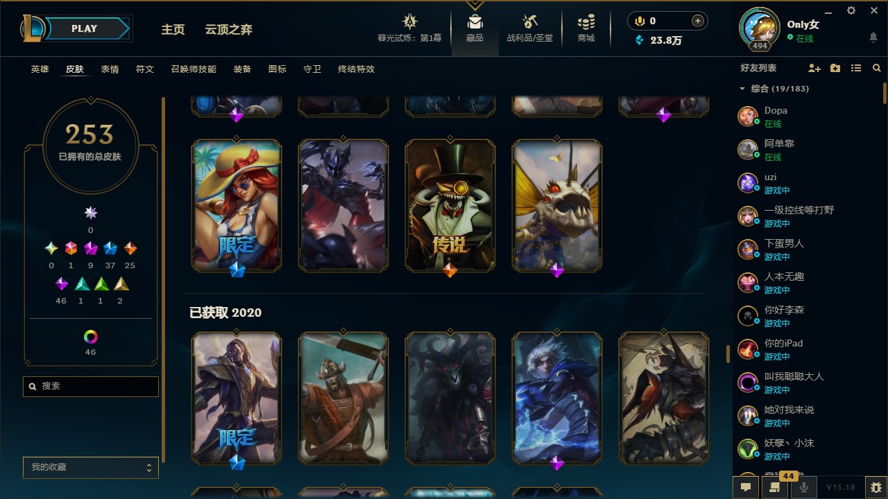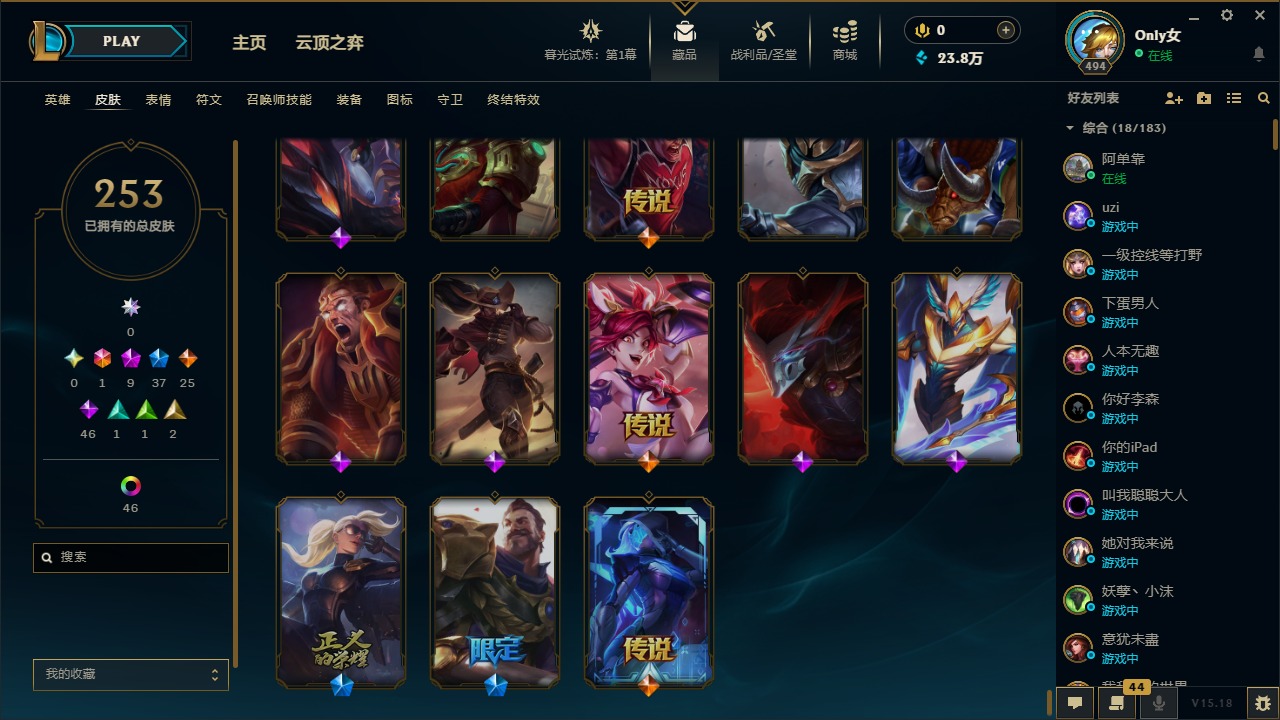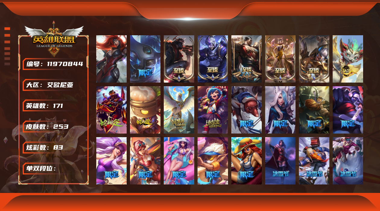 [11970844]1终极 9神话 37限定 25传说 46史诗 253皮肤 83炫彩 171英雄 可二次 可修改实名 优质装备:至臻 K/DA 阿狸,至臻 神龙尊者 炎龙瑟提,防爆天使 凯尔,暗影 沃里克,地底世界 崔斯特,冠军典狱长 锤石,冠军之矛 滑板鞋,冠军之刃 锐雯,冠军之刃 锐雯 2016,糖果使徒 费德提克,永恒之森 乐芙兰,至臻 西部魔影 泰隆,武装战姬,冠军之箭 艾希 凯旋圣装,冠军之刃 锐雯 2016 凯旋圣装,无畏骑士 瑟庄妮 赤子初心,霸天异形 卡兹克 刹那银光,可爱可爱粉红红 布里茨,冠军之矛 卡莉丝塔 凯旋圣装,净雪之月 莫甘娜 冬虹,星之守护者 阿卡丽 热情之光,魔女 阿卡丽 虚荣,至臻 凯旋将军 德莱厄斯,殿堂传奇 薇恩,至臻 灵魂莲华 劫,暗裔英雄 盖伦,殿堂传奇 薇恩 登神 限定:创星之灵 璐璐 赛季限定皮:胜利剑圣 易,胜利巨口 克格莫,胜利之树 茂凯,胜利枪神 格雷福斯,胜利女神 奥利安娜,胜利之剑 剑魔,胜利枪神 卢锡安 冠军限定系列:S1FNC 酒桶,S2 暗杀星 慎,S4 SSW 图奇,S7 SSG 霞 冰雪节限定:冰雪节 炼金,魄罗骑士 瑟庄妮,幸福女神 乐芙兰,雪球也能爆炸 吉格斯 泳池派对:泳池派对 厄运小姐,泳池派对 黑默丁格,泳池派对 凯特琳,泳池派对 球女,海之歌 艾希 万圣节限定:魅惑女巫 崔丝塔娜,魅惑女巫 娜美,南瓜头 费德提克 年限:点心宝贝 阿木木,天龙之子 斯莫德,蛇年 库奇 周年:10周年 安妮,10周年 凤凰