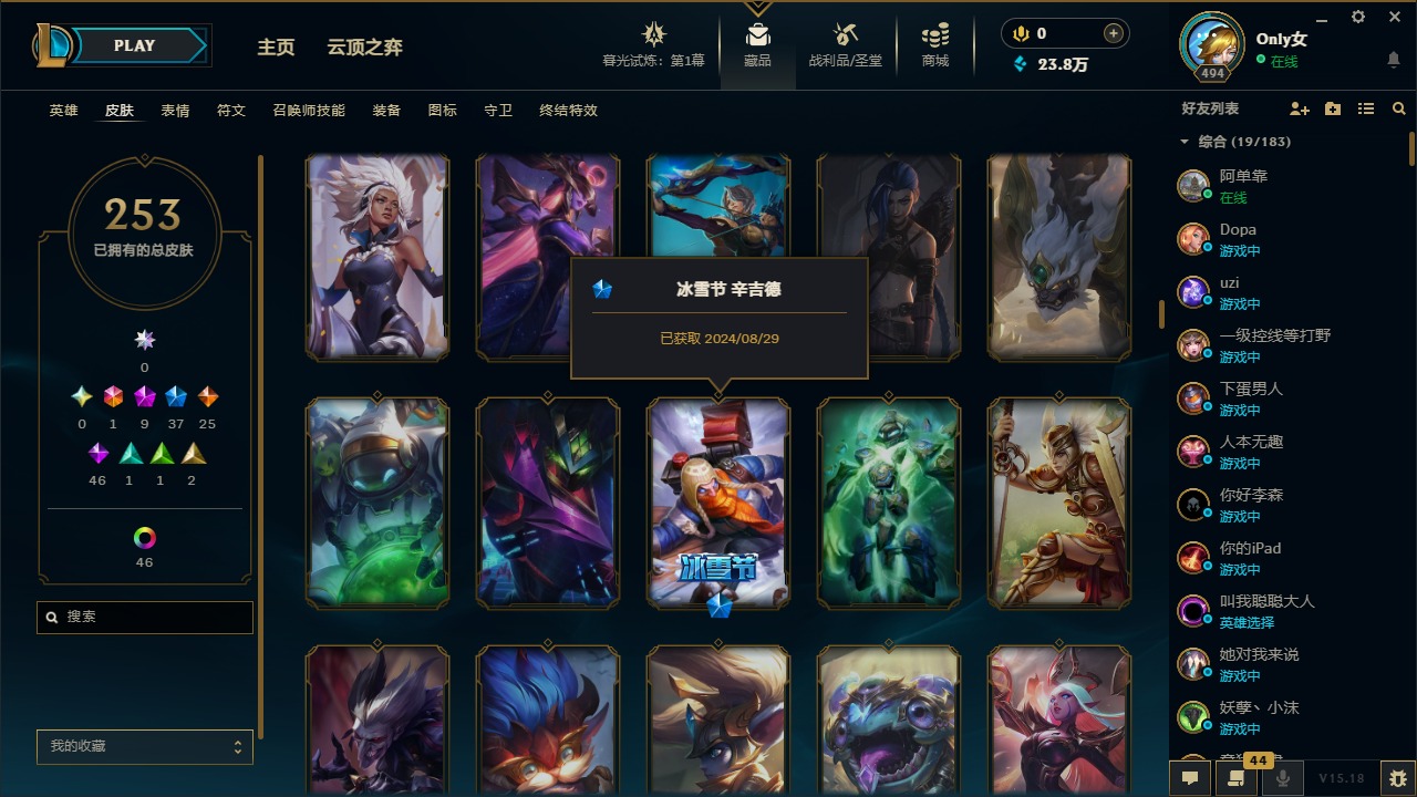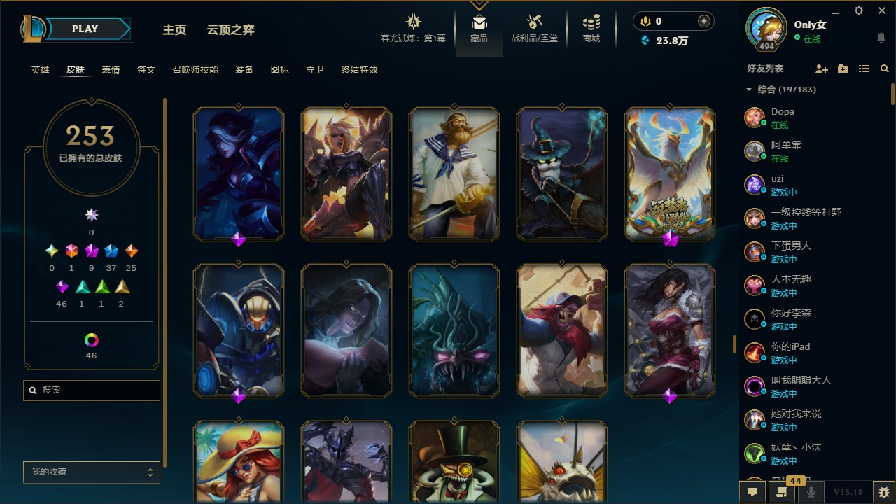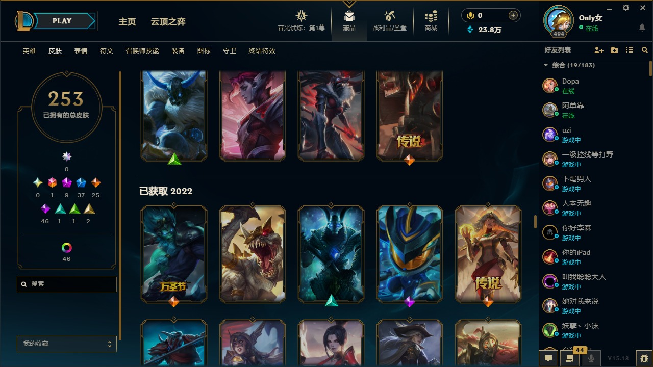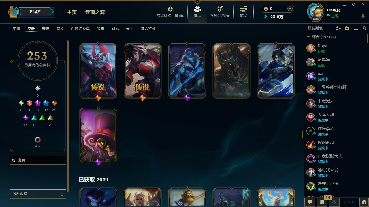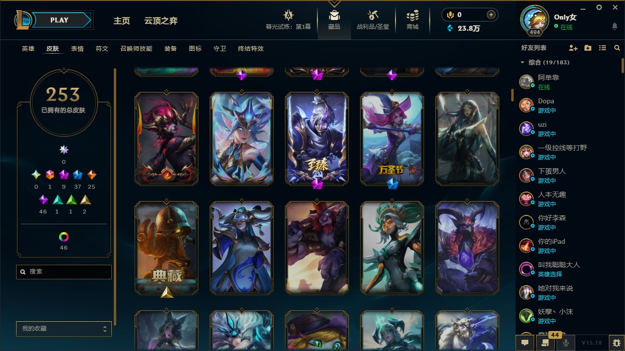 [11970844]1终极 9神话 37限定 25传说 46史诗 253皮肤 83炫彩 171英雄 可二次 可修改实名 优质装备:至臻 K/DA 阿狸,至臻 神龙尊者 炎龙瑟提,防爆天使 凯尔,暗影 沃里克,地底世界 崔斯特,冠军典狱长 锤石,冠军之矛 滑板鞋,冠军之刃 锐雯,冠军之刃 锐雯 2016,糖果使徒 费德提克,永恒之森 乐芙兰,至臻 西部魔影 泰隆,武装战姬,冠军之箭 艾希 凯旋圣装,冠军之刃 锐雯 2016 凯旋圣装,无畏骑士 瑟庄妮 赤子初心,霸天异形 卡兹克 刹那银光,可爱可爱粉红红 布里茨,冠军之矛 卡莉丝塔 凯旋圣装,净雪之月 莫甘娜 冬虹,星之守护者 阿卡丽 热情之光,魔女 阿卡丽 虚荣,至臻 凯旋将军 德莱厄斯,殿堂传奇 薇恩,至臻 灵魂莲华 劫,暗裔英雄 盖伦,殿堂传奇 薇恩 登神 限定:创星之灵 璐璐 赛季限定皮:胜利剑圣 易,胜利巨口 克格莫,胜利之树 茂凯,胜利枪神 格雷福斯,胜利女神 奥利安娜,胜利之剑 剑魔,胜利枪神 卢锡安 冠军限定系列:S1FNC 酒桶,S2 暗杀星 慎,S4 SSW 图奇,S7 SSG 霞 冰雪节限定:冰雪节 炼金,魄罗骑士 瑟庄妮,幸福女神 乐芙兰,雪球也能爆炸 吉格斯 泳池派对:泳池派对 厄运小姐,泳池派对 黑默丁格,泳池派对 凯特琳,泳池派对 球女,海之歌 艾希 万圣节限定:魅惑女巫 崔丝塔娜,魅惑女巫 娜美,南瓜头 费德提克 年限:点心宝贝 阿木木,天龙之子 斯莫德,蛇年 库奇 周年:10周年 安妮,10周年 凤凰
