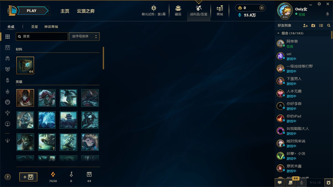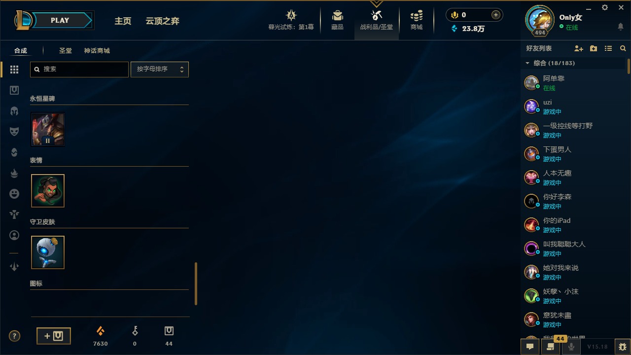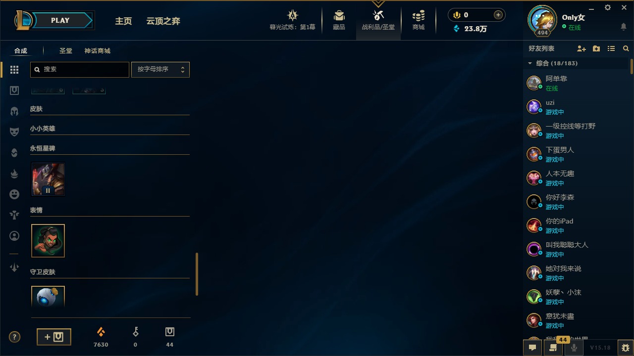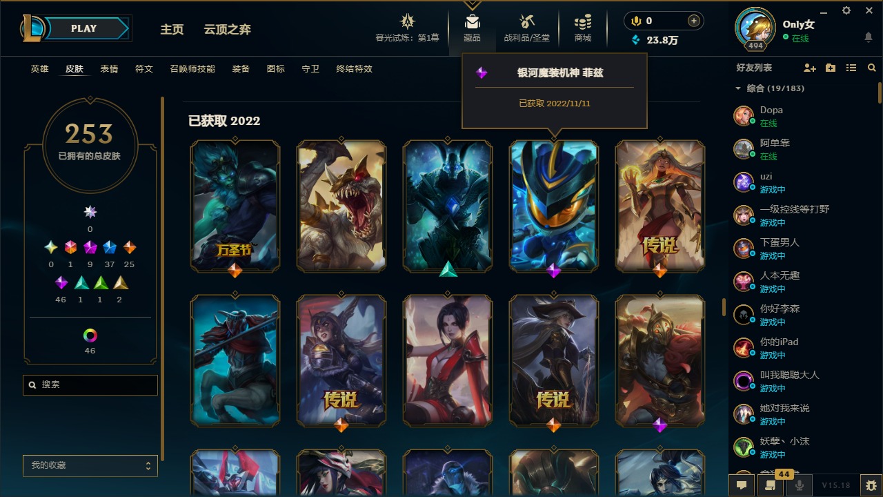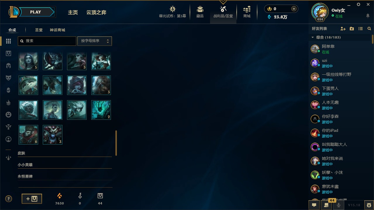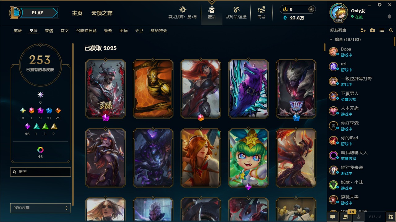 [11970844]1终极 9神话 37限定 25传说 46史诗 253皮肤 83炫彩 171英雄 可二次 可修改实名 优质装备:至臻 K/DA 阿狸,至臻 神龙尊者 炎龙瑟提,防爆天使 凯尔,暗影 沃里克,地底世界 崔斯特,冠军典狱长 锤石,冠军之矛 滑板鞋,冠军之刃 锐雯,冠军之刃 锐雯 2016,糖果使徒 费德提克,永恒之森 乐芙兰,至臻 西部魔影 泰隆,武装战姬,冠军之箭 艾希 凯旋圣装,冠军之刃 锐雯 2016 凯旋圣装,无畏骑士 瑟庄妮 赤子初心,霸天异形 卡兹克 刹那银光,可爱可爱粉红红 布里茨,冠军之矛 卡莉丝塔 凯旋圣装,净雪之月 莫甘娜 冬虹,星之守护者 阿卡丽 热情之光,魔女 阿卡丽 虚荣,至臻 凯旋将军 德莱厄斯,殿堂传奇 薇恩,至臻 灵魂莲华 劫,暗裔英雄 盖伦,殿堂传奇 薇恩 登神 限定:创星之灵 璐璐 赛季限定皮:胜利剑圣 易,胜利巨口 克格莫,胜利之树 茂凯,胜利枪神 格雷福斯,胜利女神 奥利安娜,胜利之剑 剑魔,胜利枪神 卢锡安 冠军限定系列:S1FNC 酒桶,S2 暗杀星 慎,S4 SSW 图奇,S7 SSG 霞 冰雪节限定:冰雪节 炼金,魄罗骑士 瑟庄妮,幸福女神 乐芙兰,雪球也能爆炸 吉格斯 泳池派对:泳池派对 厄运小姐,泳池派对 黑默丁格,泳池派对 凯特琳,泳池派对 球女,海之歌 艾希 万圣节限定:魅惑女巫 崔丝塔娜,魅惑女巫 娜美,南瓜头 费德提克 年限:点心宝贝 阿木木,天龙之子 斯莫德,蛇年 库奇 周年:10周年 安妮,10周年 凤凰