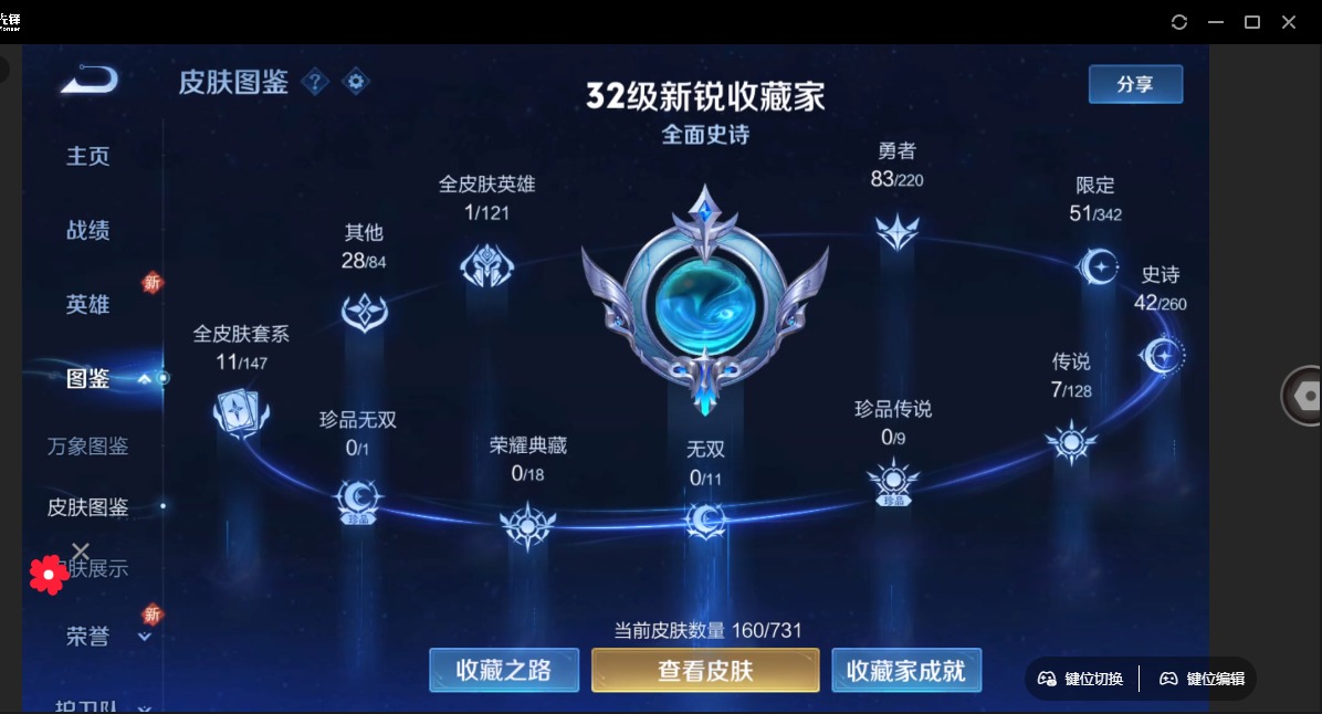 - PX_2106510-Q/永恒钻石/162皮肤/102英雄/1典藏/0珍品无双/2无双/4珍品传说/26传说/39史诗/5稀有英雄 【4 珍品传说】怪盗基德 马可波罗,时之奇旅 孙策,器灵·落星盏 嫦娥,江户川柯南 鲁班七号, 【1 典藏皮肤】全息碎影 孙悟空, 【2 无双皮肤】真我赫兹 瑶,器灵·螭龙剑 曜, 【26 传说皮肤】启明星使 虞姬,逐花归海 澜,电玩·雷克斯 澜,无双飞将 马超,游龙