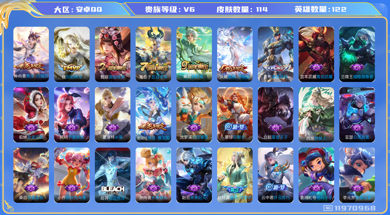 - [12091120]V8 1典藏 8传说 126英雄 297皮肤 典藏英雄武则天 可修改实名 信用分57分 优质装备:弑枪猎影(韩信典藏),一念神魔,云霓雀翎,末日机甲-孙尚香(绿蚂蚱),零号·赤焰,超时空战士-狄仁杰 珍宝阁皮:女武神,玩趣恶龙 限定皮:至尊宝,白晶晶,时雨天司(水龙头),神威(电光马子),遇见飞天,高山流水,五谷丰年,冰锋战神,游园惊梦,梁祝,天狼溯光者,奔雷神使(牛魔年限),祈雪灵祝(雪兔子),李小龙,霸王别姬-项羽,霸王别姬-虞姬,孙行者,猪悟能,一生所爱,大圣娶亲,冰霜恋舞曲 史诗皮:百相守梦-黄忠,白龙吟,黄金分割率,特工魅影,千年之狐,江河有灵,魅语,冰冠公主,偶像歌手,龙骑士(小龙虾),末日机甲-吕布,猫狗日记-孙策,时之恋人-孙尚香,乱世虎臣,节奏热浪,修罗,女仆咖啡,摇滚巨星,水果甜心,天才门将,星夜王子,时之奇旅-安琪拉,功夫厨神,德古拉伯爵,暗隐猎兽者,幽灵船长,暗渊魔法,心灵战警,舞动绿茵,地狱岩魂,纤云弄巧,拒霜思,缤纷独角兽,乘风破浪,逐浪之夏,水晶猎龙者,曙光守护者,热力回旋,箭羽风息,金属风暴,原初追逐者,圣诞狂欢,圣诞恋歌,鹰眼统帅,暗夜贵公子,魅力维加斯,黎明之约
