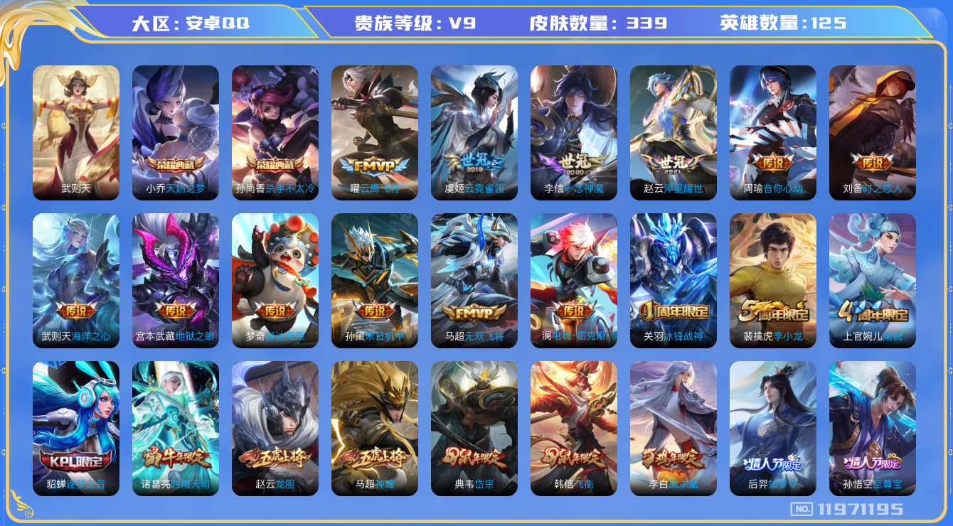- [11972750]V4 26传说 125英雄 243皮肤 可修改实名 优质装备:炽阳神光,一念神魔,云霓雀翎,飞鸢探春,超时空战士-狄仁杰,挚爱之约,挚爱花嫁,无双飞将,神器·狴犴令,山海·炽霜斩(李信年限),炽翼辉光(娃娃菜牛角包),浮生妄,记忆之芯(机甲兔),鹤羽星尊,霜月吟,金乌负日,黄金天蝎座,涂山容容 传说皮:乘龙·问璇玑(孙尚香年限),乘龙·铭钟鼎(赵云年限) 珍宝阁皮:万物之道,蔷薇恋人,女武神 限定皮:愿照·岁时盈(虞姬年限),鸣野蒿,异界灵契(白毛香),前尘镜,至美·化雀舞,遇见飞天,高山流水,无限倾心-虞姬,五谷丰年,梁祝,天狼溯光者,李小龙,朱雀志(守约年限),寅虎·心曲(虎婆),深海之息(深海大菠萝),山海·玄木吟(马可年限) 史诗皮:器灵·浮梦炉,狼魂孤将,化蝶舞,石田雨龙,琥珀纪元伽罗,星界特工,百相守梦-黄忠,紫霞仙子,永昼,江河有灵,高渐离燃音魔法,蒙恬荣光圣徽,冰冠公主,偶像歌手,电玩·爆裂旋风,暗夜猫娘,龙骑士(小龙虾),末日机甲-吕布,时之恋人-孙尚香,乱世虎臣,女仆咖啡,摇滚巨星,水果甜心,绅士熊喵,德古拉伯爵,暗隐猎兽者,幽灵船长,鬼剑武藏,舞动绿茵,地狱岩魂,缤纷独角兽,逐浪之夏,龙鼓争鸣,水晶猎龙者,金属风暴,圣诞恋歌,鹰眼统帅,魅力维加斯,黎明之约,赏金猎手,奇遇舞章,无心,玫瑰异探
