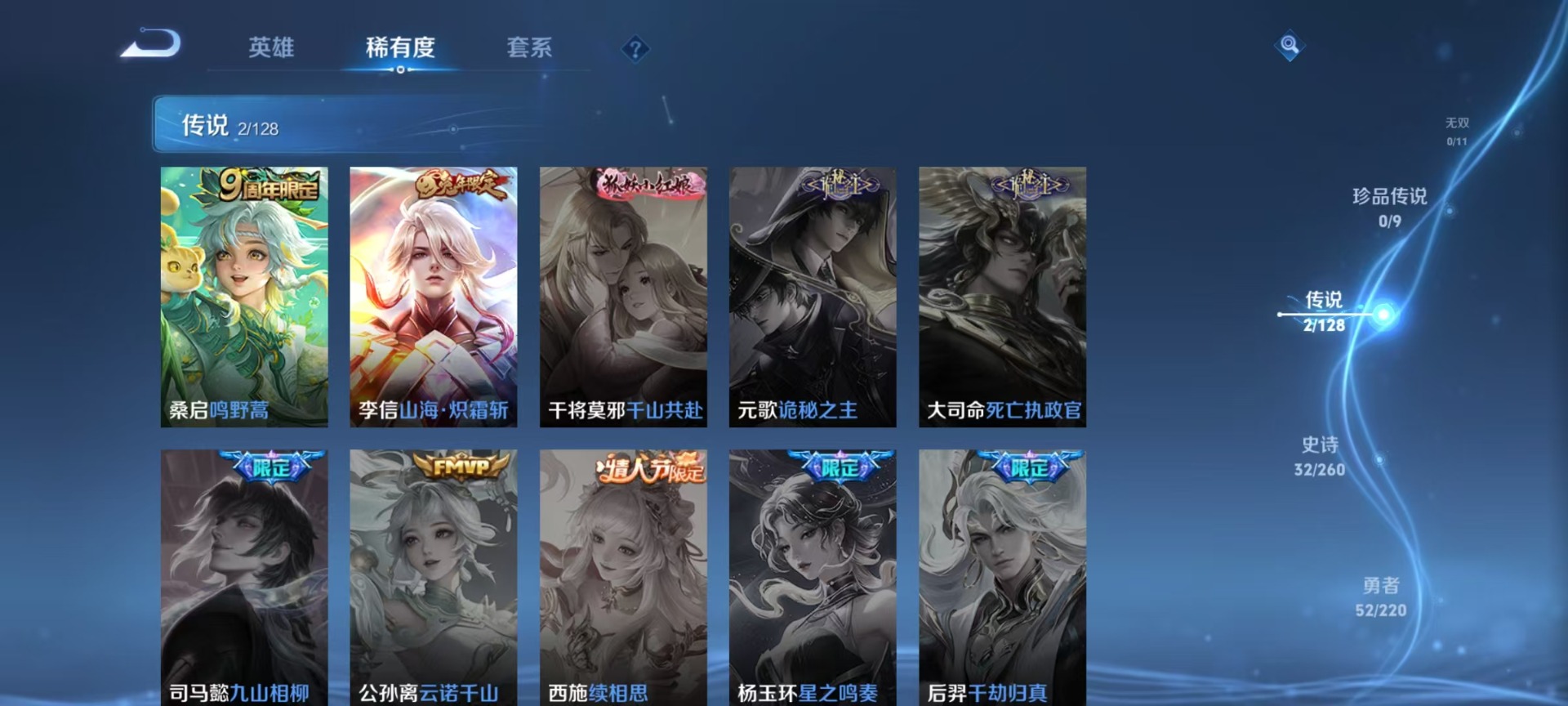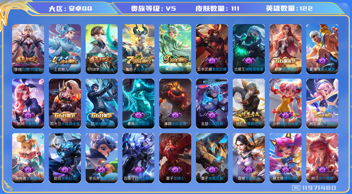 - [12026460]V4 1传说 91英雄 81皮肤 可修改实名 女号 梦奇大国标 曹操小国标 云樱小国标 元流之子小国标 阿古朵小国标 限定皮:逐霄战戟,鸣野蒿,李小龙 史诗皮:化蝶舞,破空之剑,炽弈燎原,千年之狐,江河有灵,偶像歌手,水果甜心,星夜王子,幽灵船长,鬼剑武藏,地狱岩魂,乘风破浪,鹰眼统帅,黎明之约