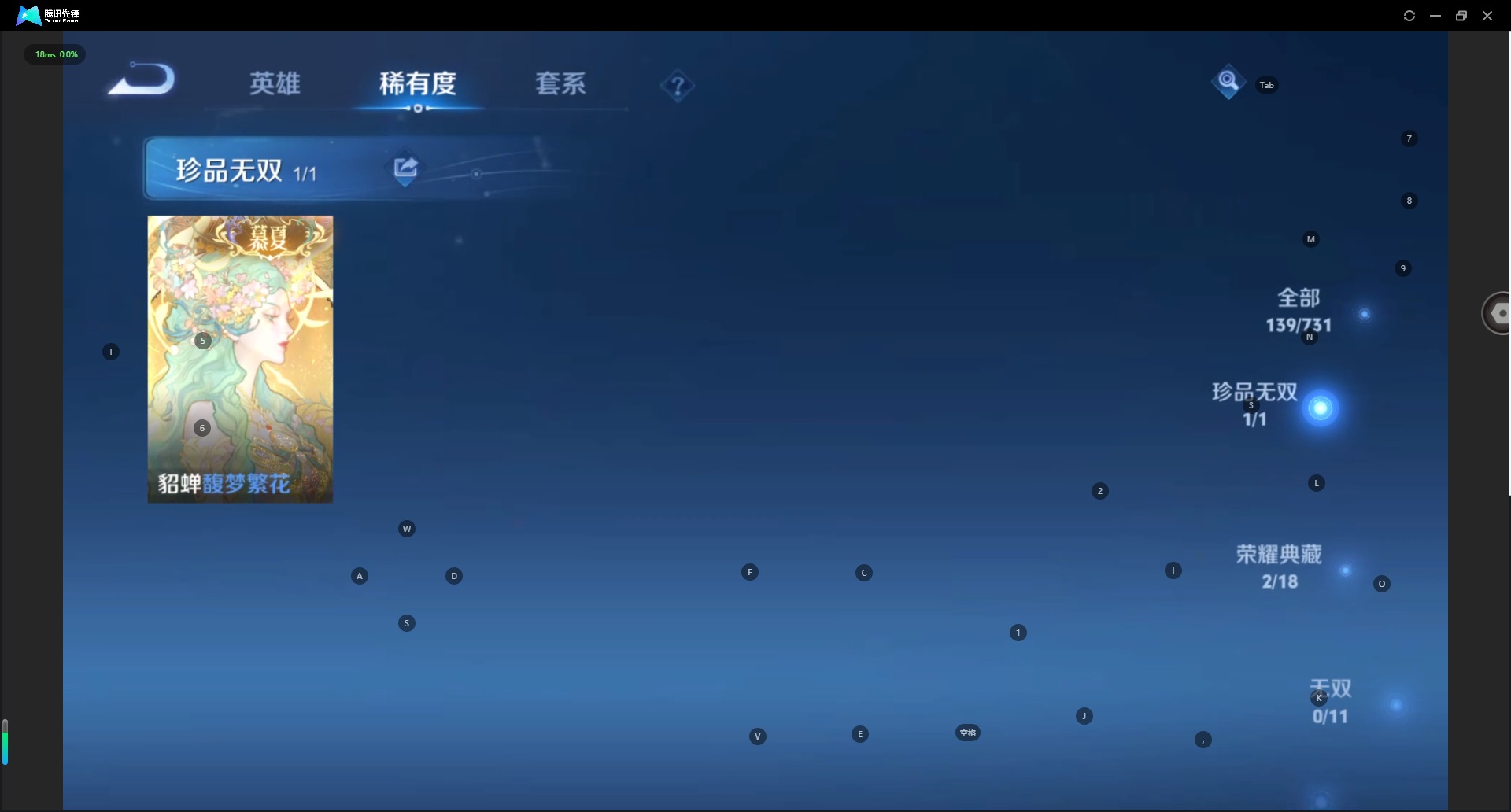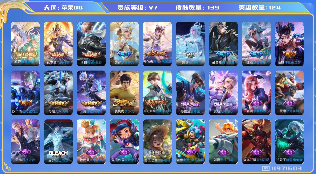 [11971603]V7 2典藏 1珍品无双 10传说 124英雄 139皮肤 可修改实名 优质装备:馥梦繁花,鸣剑·曳影,九霄神辉(木兰典藏),仲夏夜之梦(大飞蛾),超时空战士-狄仁杰,无双飞将,炽翼辉光(娃娃菜牛角包),鹤羽星尊,霜月吟,澜逐花归海 传说皮:乘龙·问璇玑(孙尚香年限),落雪白狼 珍宝阁皮:女武神 限定皮:至尊宝,无限倾心-虞姬,李小龙,山海·玄木吟(马可年限) 史诗皮:赞萌露比,龙之律动,石田雨龙,怒海争锋,蔬乡物语(鲁班七号),百相守梦-黄忠,守夜人,电玩小子(小书包),偶像歌手,电玩·爆裂旋风,节奏热浪,修罗,水果甜心,天才门将,功夫厨神,暗隐猎兽者,鬼剑武藏,心灵战警,纤云弄巧,水晶猎龙者,鹰眼统帅,魅力维加斯,滕王阁序